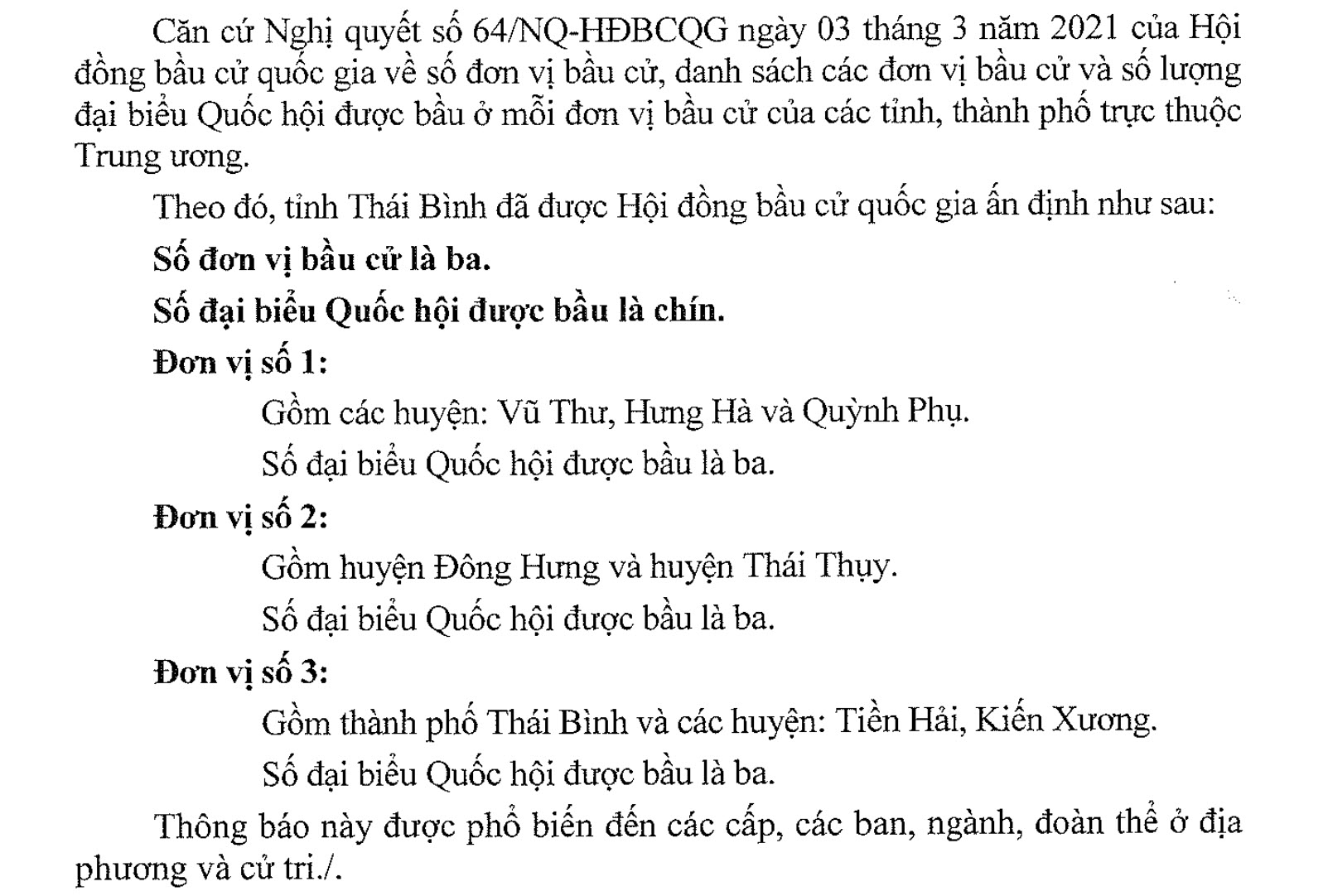 Thông báo số đơn vị bầu cử, danh sách các đơn vị bầu cử, số lượng đại biểu Quốc hội được bầu ở mỗi đơn vị bầu cử