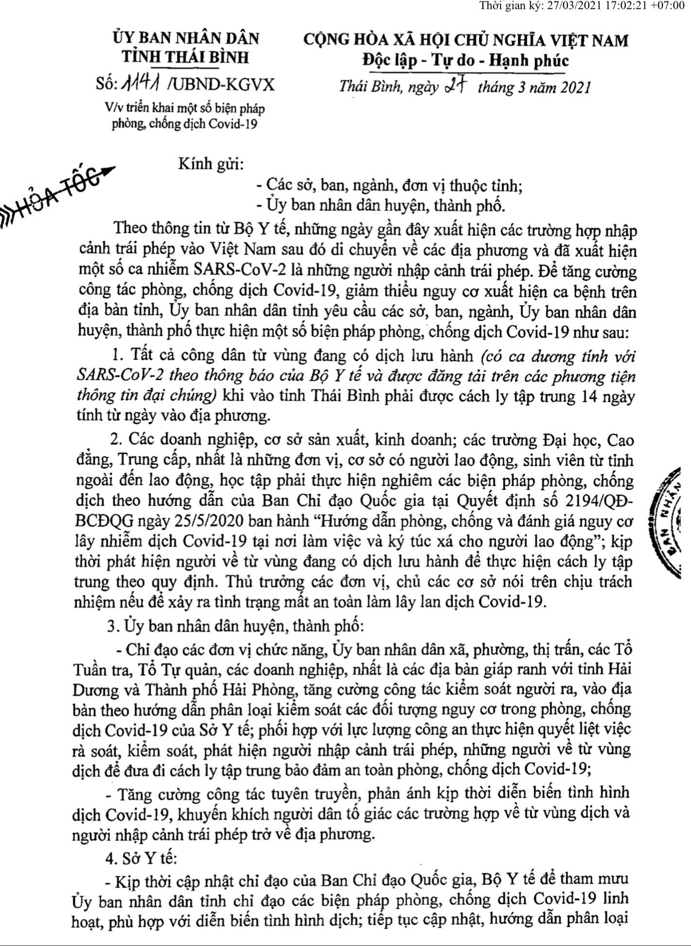 Ngày 27/3, UBND tỉnh Thái Bình có Công văn số 1141/UBND-KGVX Về việc triển khai một số biện pháp phòng, chống dịch Covid-19.