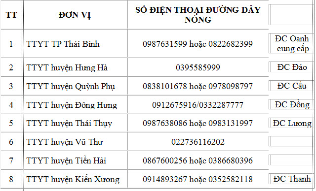 - Số điện thoại Đường dây nóng tiếp nhận các thông tin về COVID-19 tại Trung tâm Kiểm soát bệnh tật tỉnh Thái Bình: 0227 383 6722.