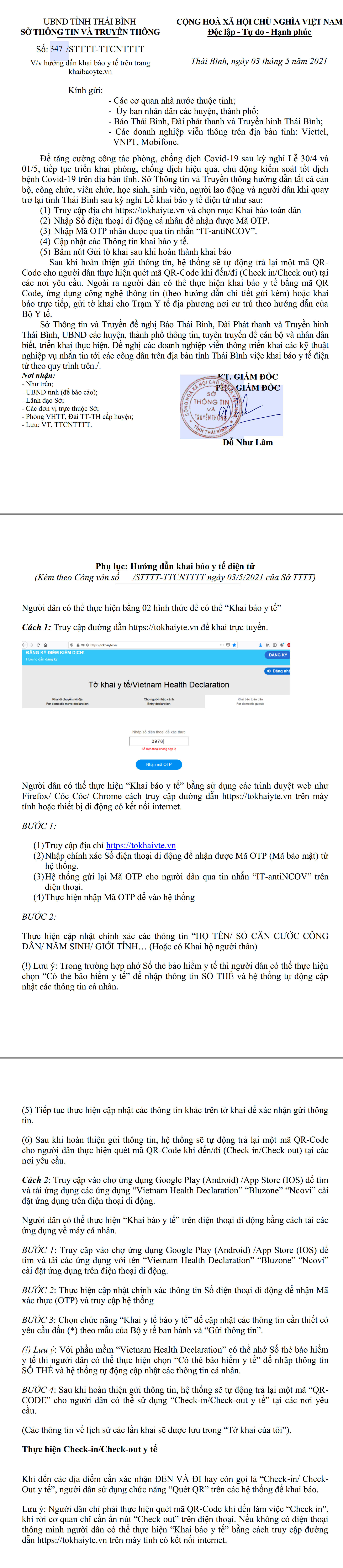 Ngày 3/5/2021, Sở Thông tin và Truyền thông ban hành Văn bản số 347/STTTT- TTCNTTTT về việc hướng dẫn khai báo y tế trên trang tokhaiyte.vn