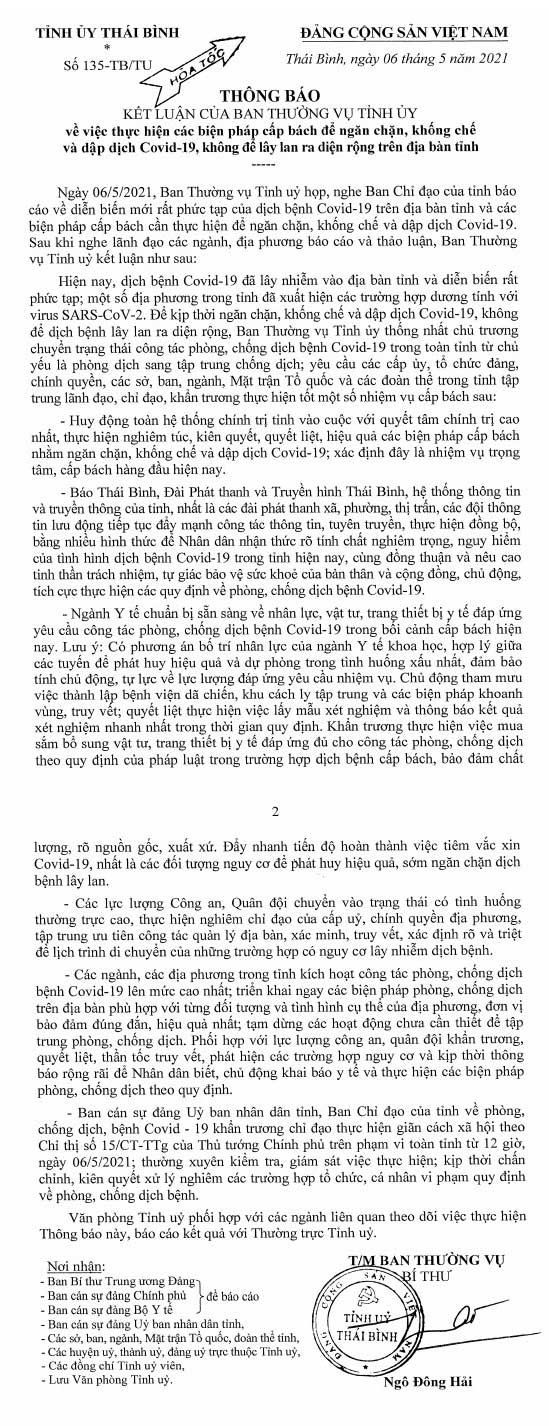 Thông báo kết luận của Ban Thường vụ Tỉnh ủy về việc thực hiện các biện pháp cấp bách để ngăn chặn, khống chế và dập dịch Covid-19, không để lây lan ra diện rộng trên địa bàn tỉnh.