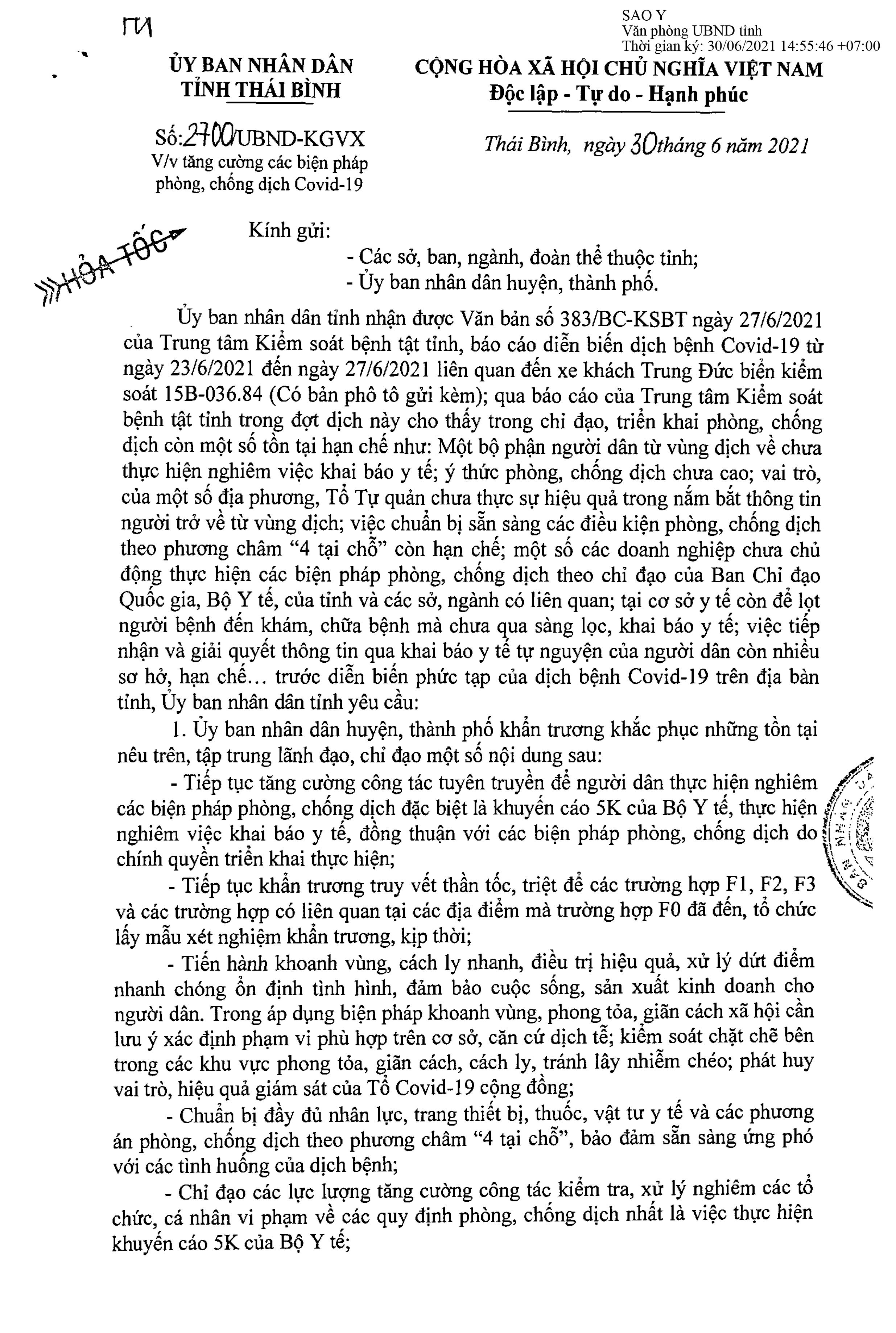 Công văn số 2700/UBND-KGVX về việc tăng cường các biện pháp phòng, chống dịch Covid-19