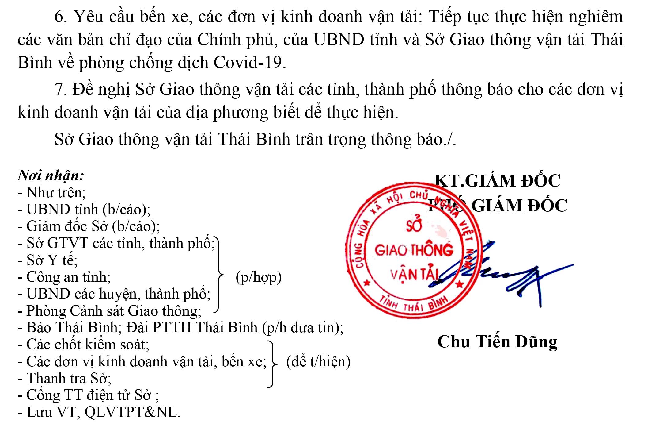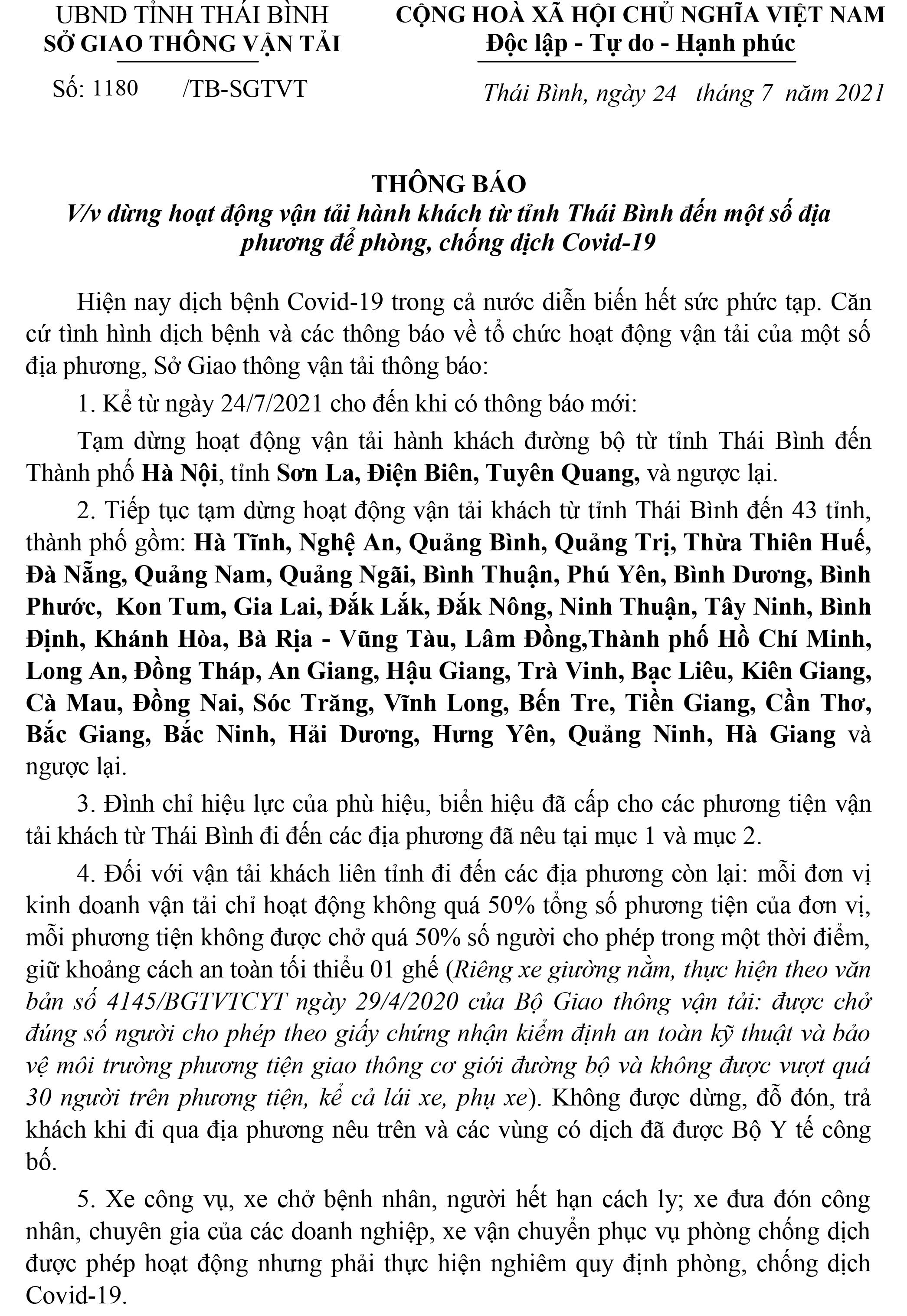 Thông báo số 1180/TB-SGTVT ngày 24/7/2021 của Sở Giao thông Vận tải tỉnh Thái Bình về việc dừng hoạt động vận tải hành khách từ tỉnh Thái Bình đến một số địa phương để phòng, chống dịch Covid19.