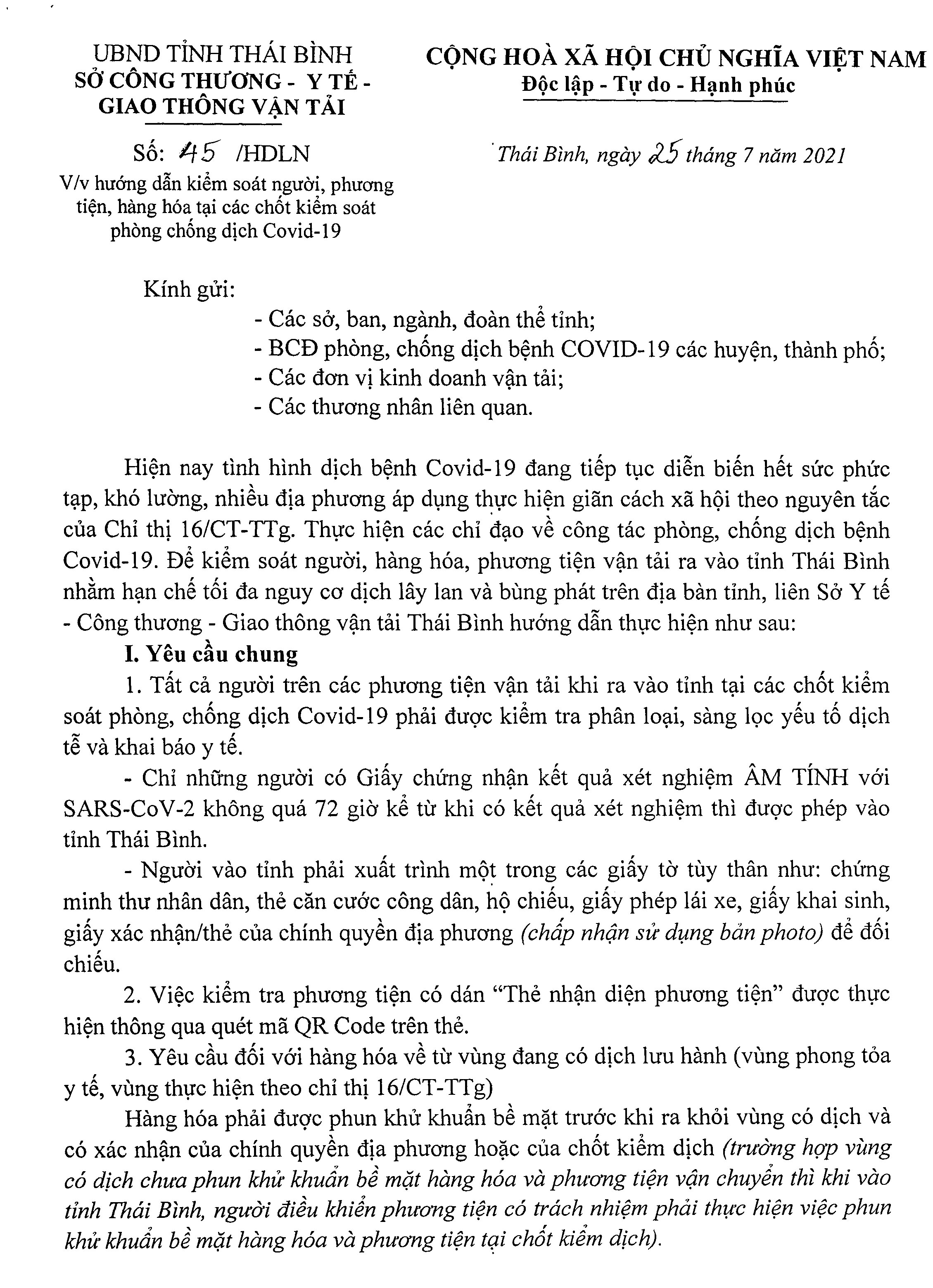 Hướng dẫn kiểm soát người, phương tiện, hàng hóa tại các chốt kiểm soát phòng, chống dịch Covid-19