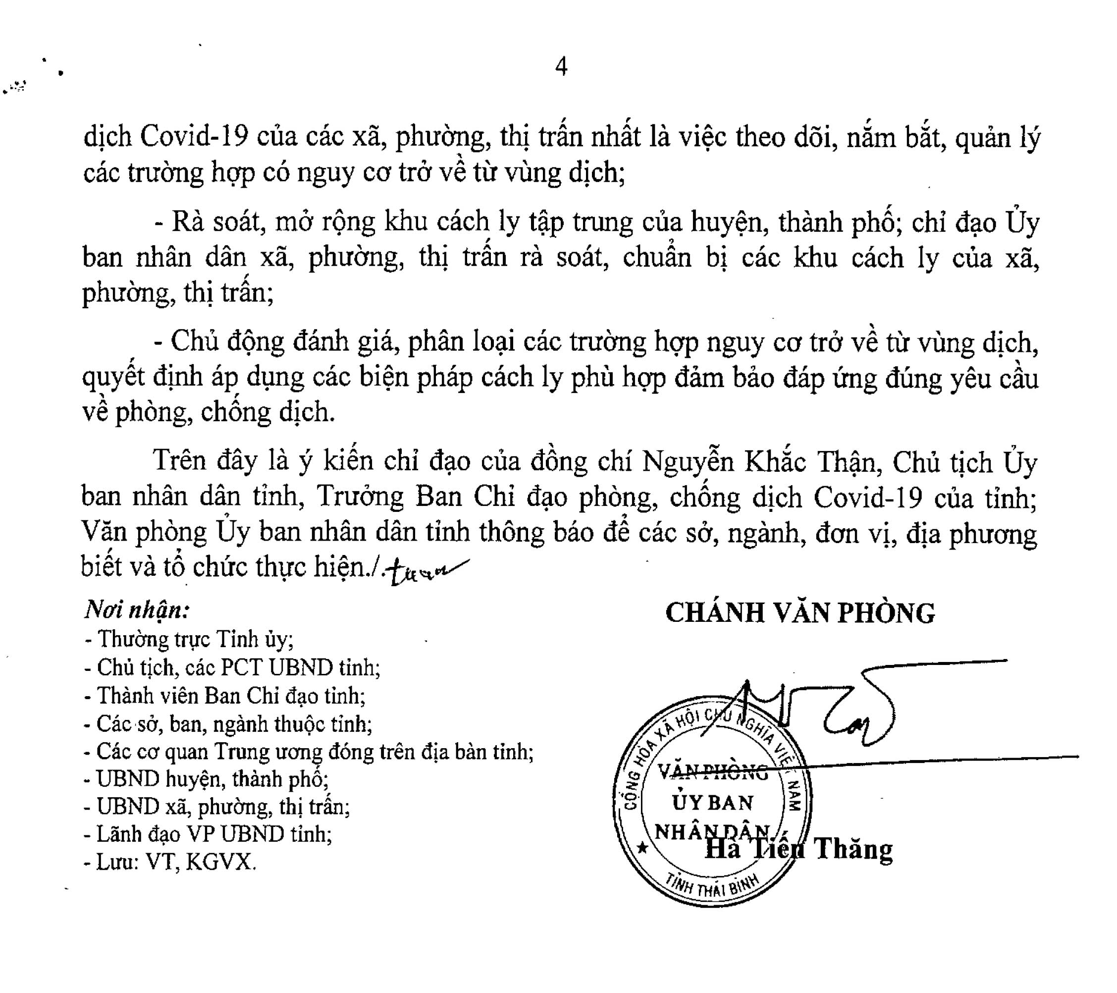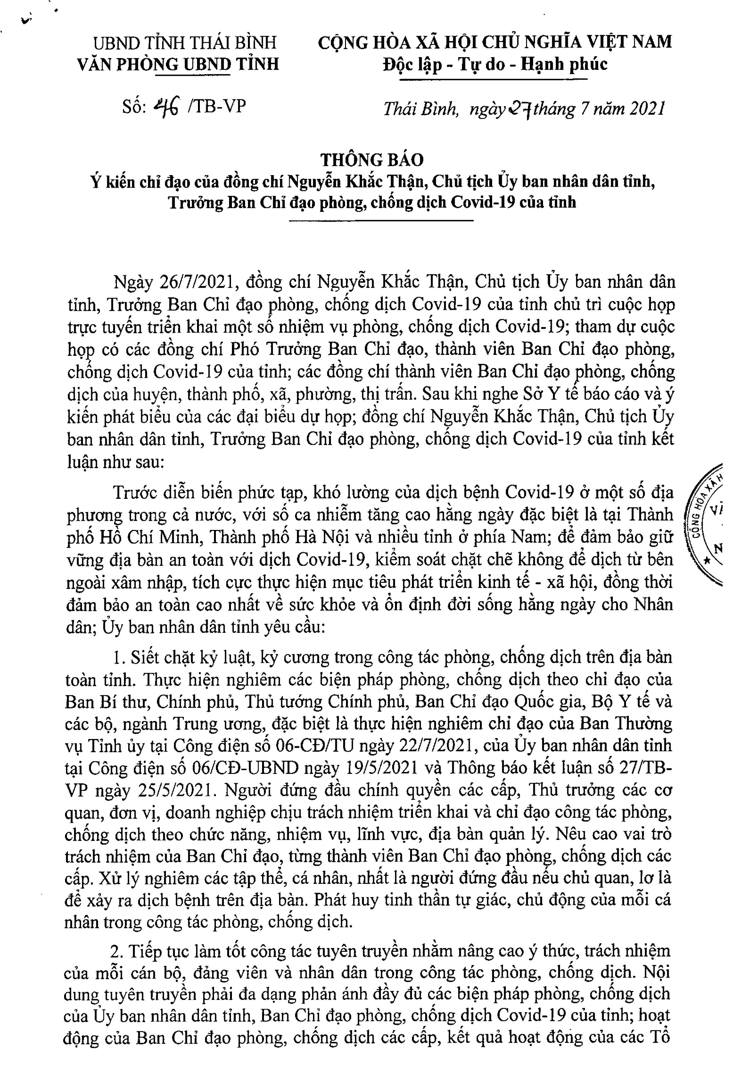 Thông báo ý kiến chỉ đạo của đồng chí Nguyễn Khắc Thận, Phó Bí thư Tỉnh ủy, Chủ tịch UBND tỉnh, Trưởng ban Chỉ đạo phòng, chống dịch Covid-19 tỉnh