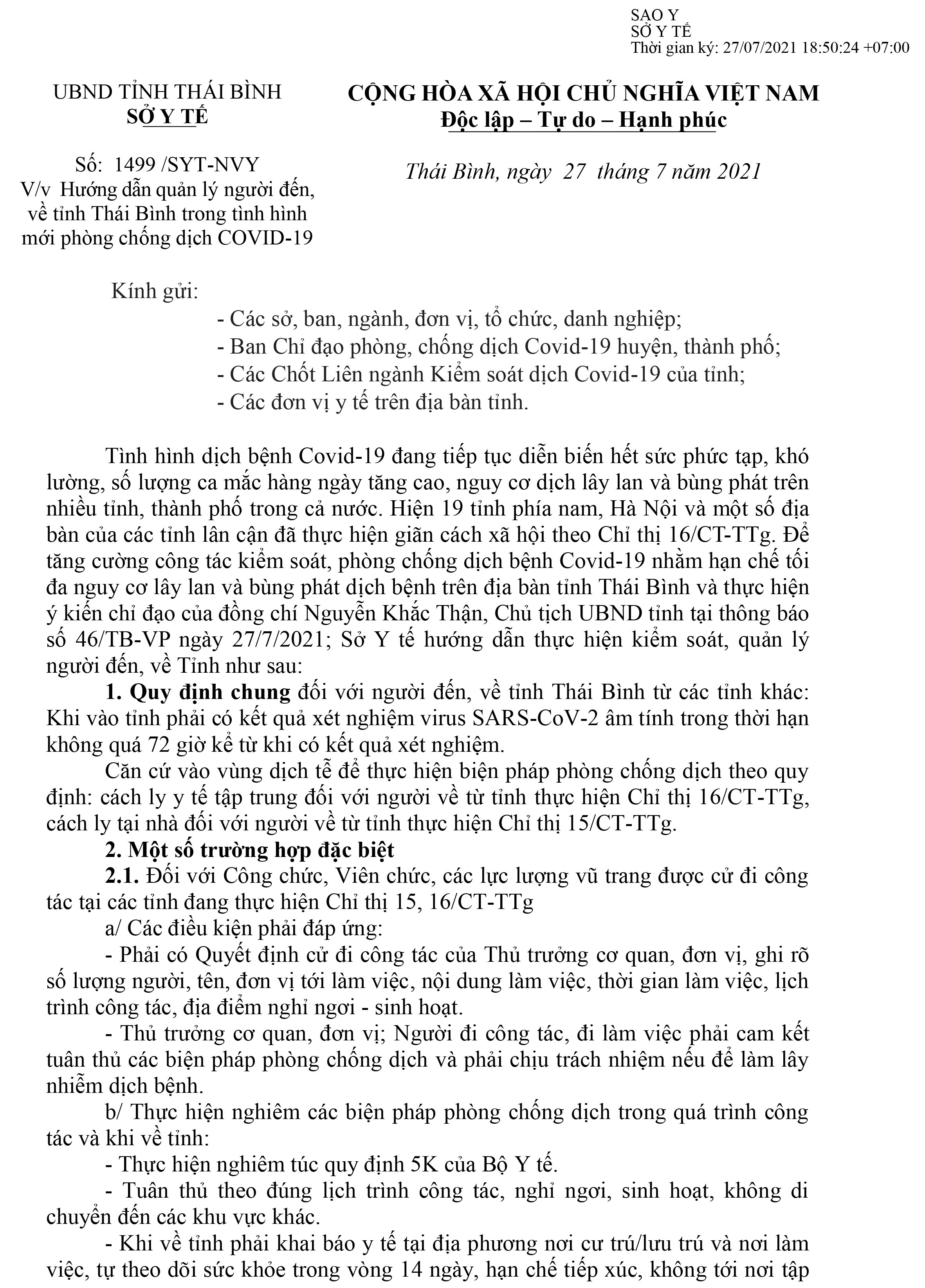 Hướng dẫn số 1499/SYT-NVY của Sở Y tế tỉnh Thái Bình về việc hướng dẫn quản lý người đến, về tỉnh Thái Bình trong tình hình mới phòng, chống dịch Covid-19.
