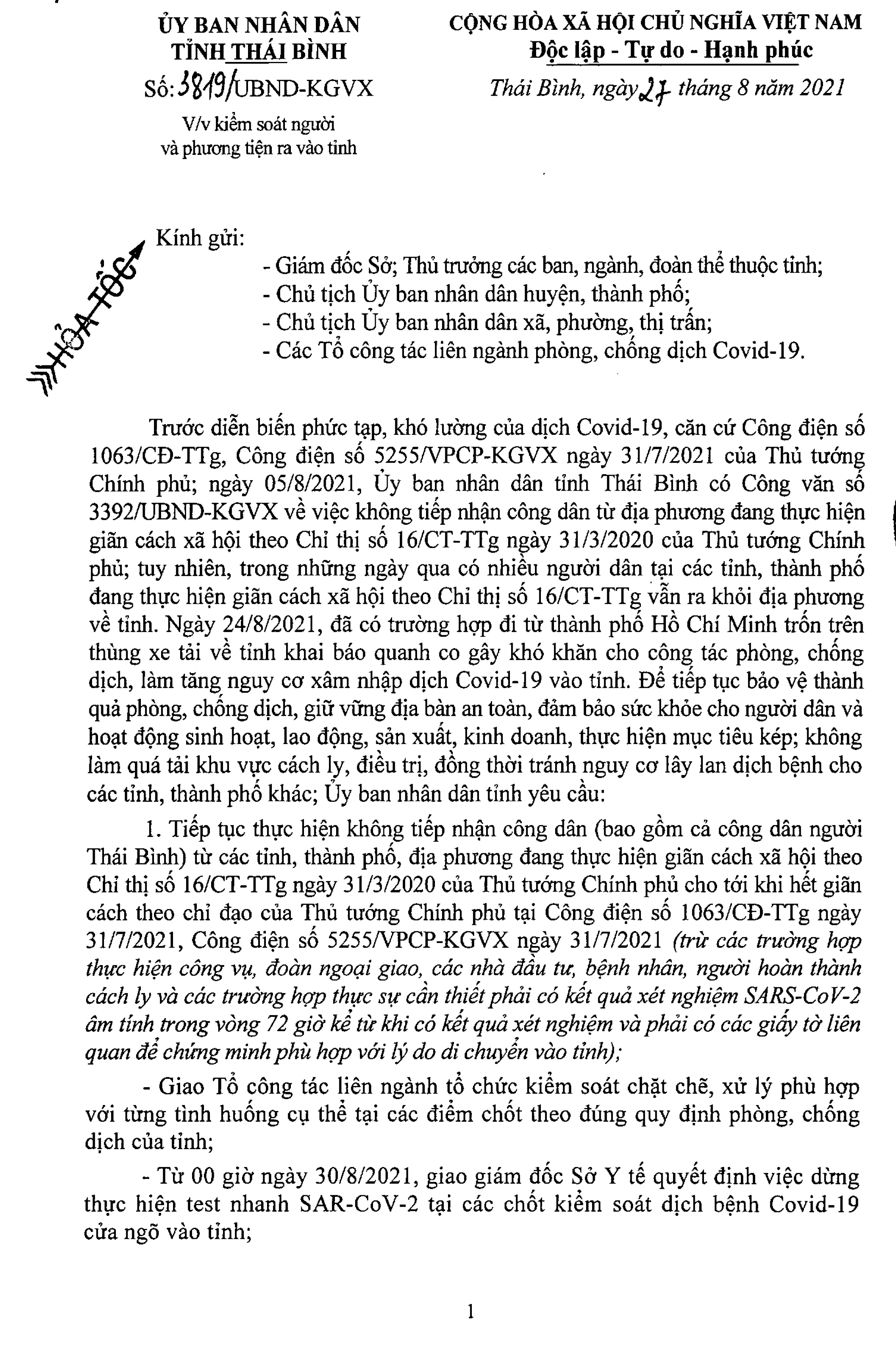 Công văn số 3819/UBND-KGVX về việc kiểm soát người và phương tiện ra vào tỉnh