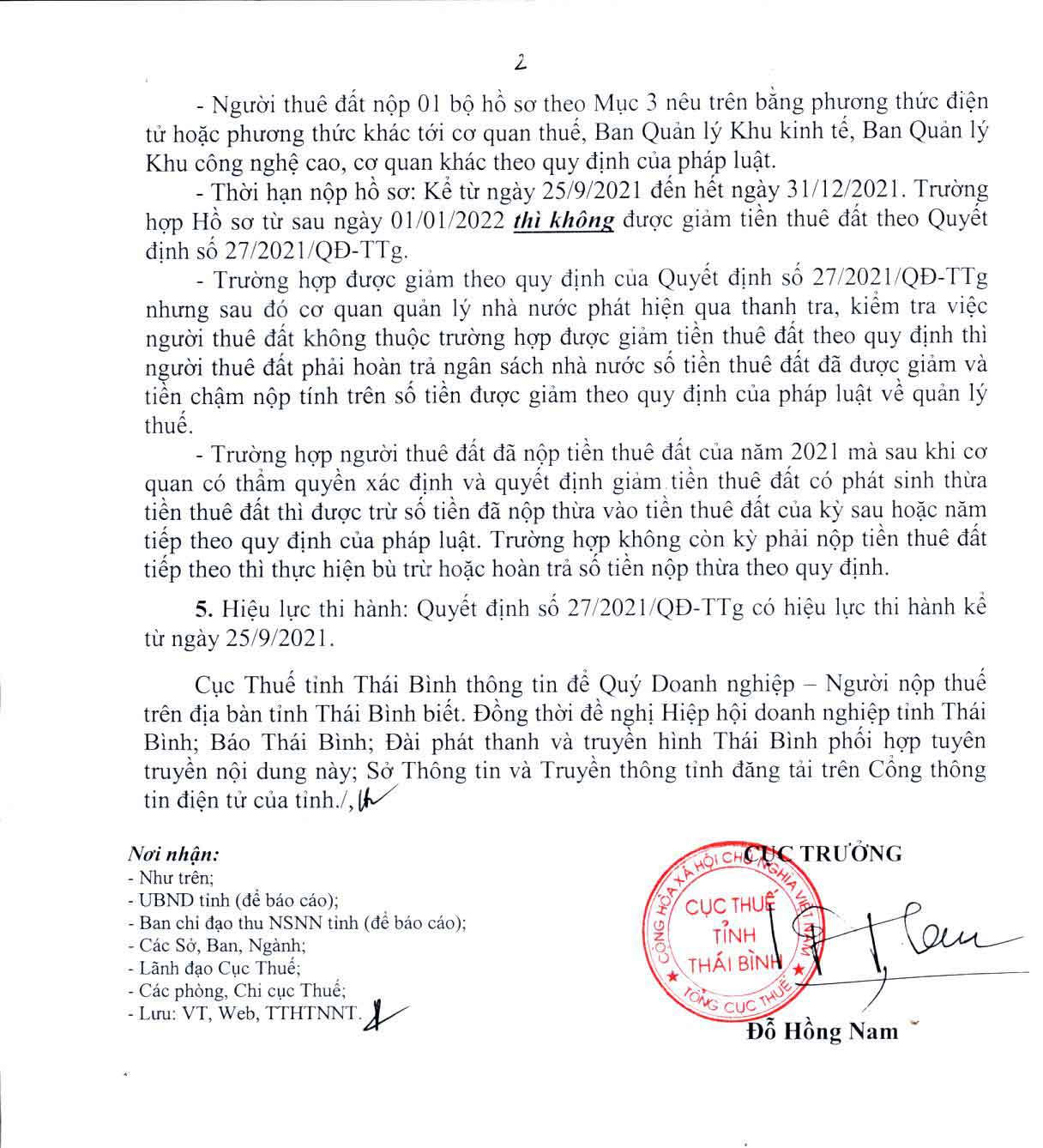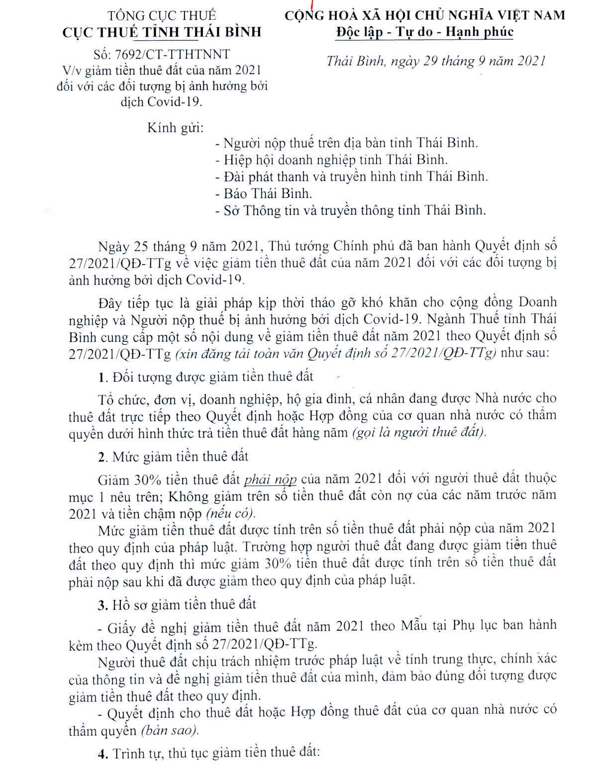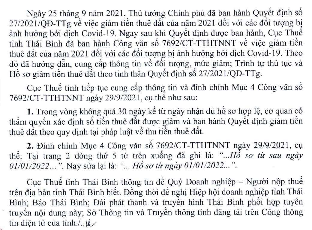 Nội dung Công văn số 7692/CT-TTHTNNT về việc giảm tiền thuê đất của năm 2021 đối với các đối tượng bị ảnh hưởng bởi dịch Covid-19: