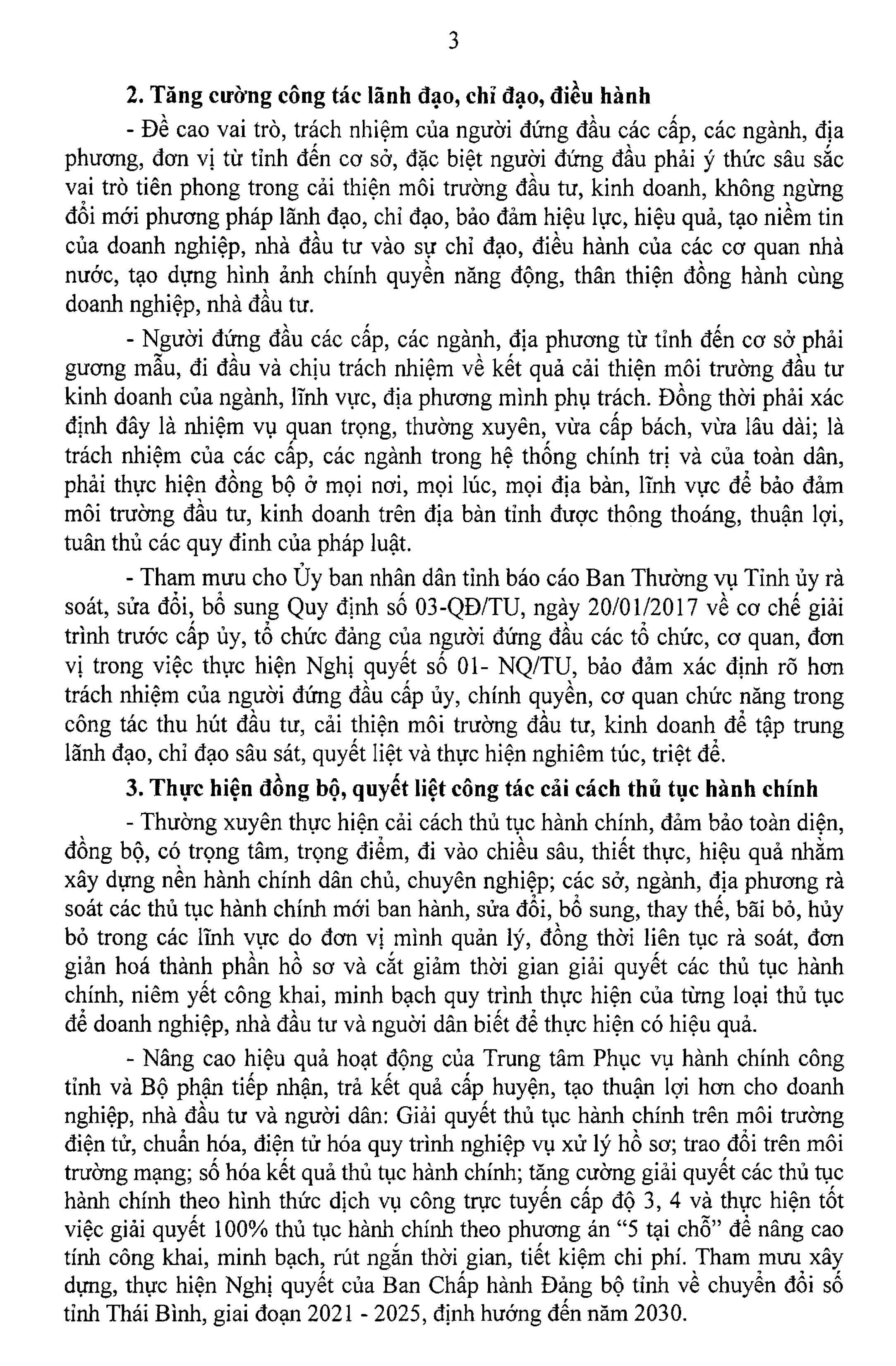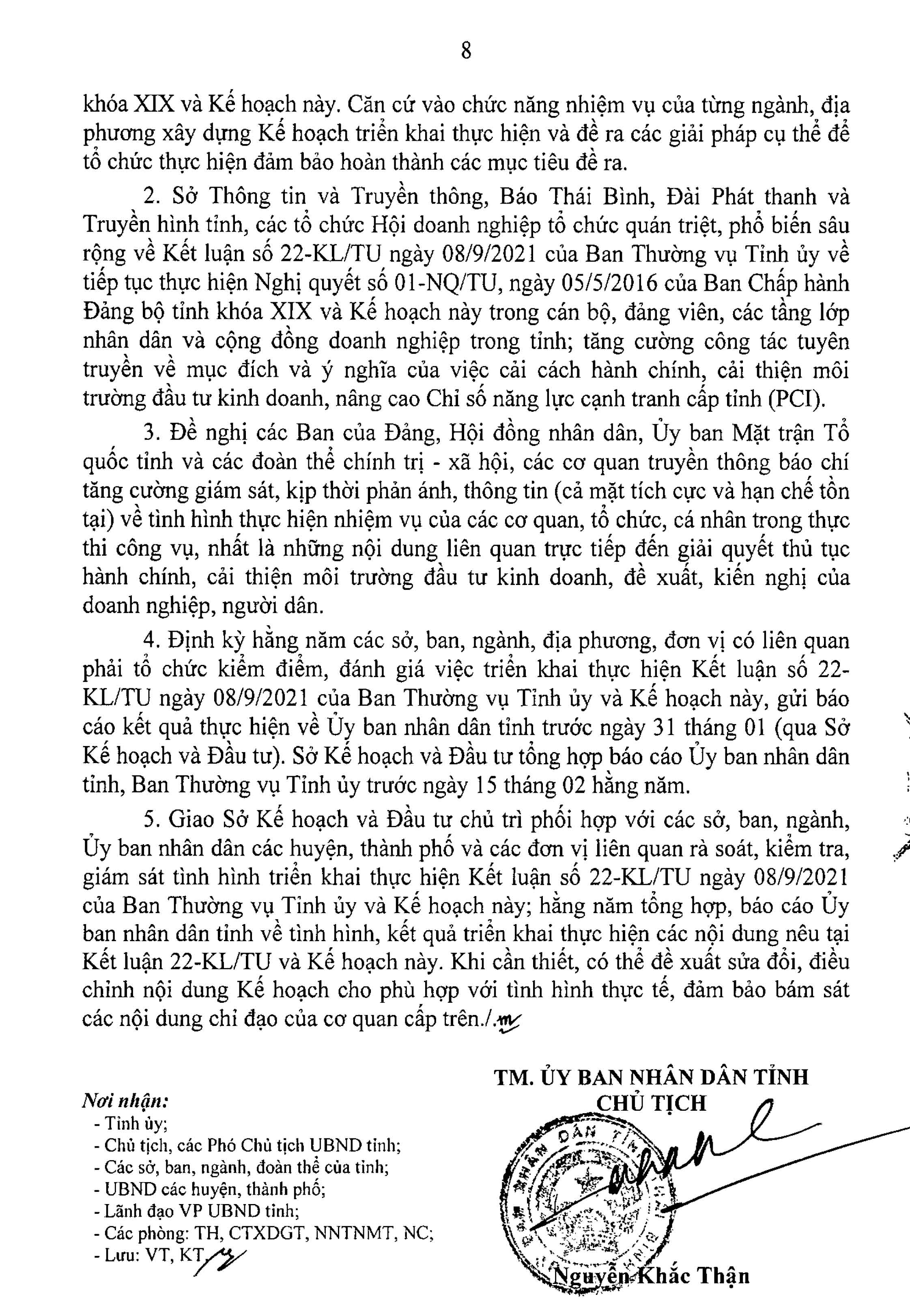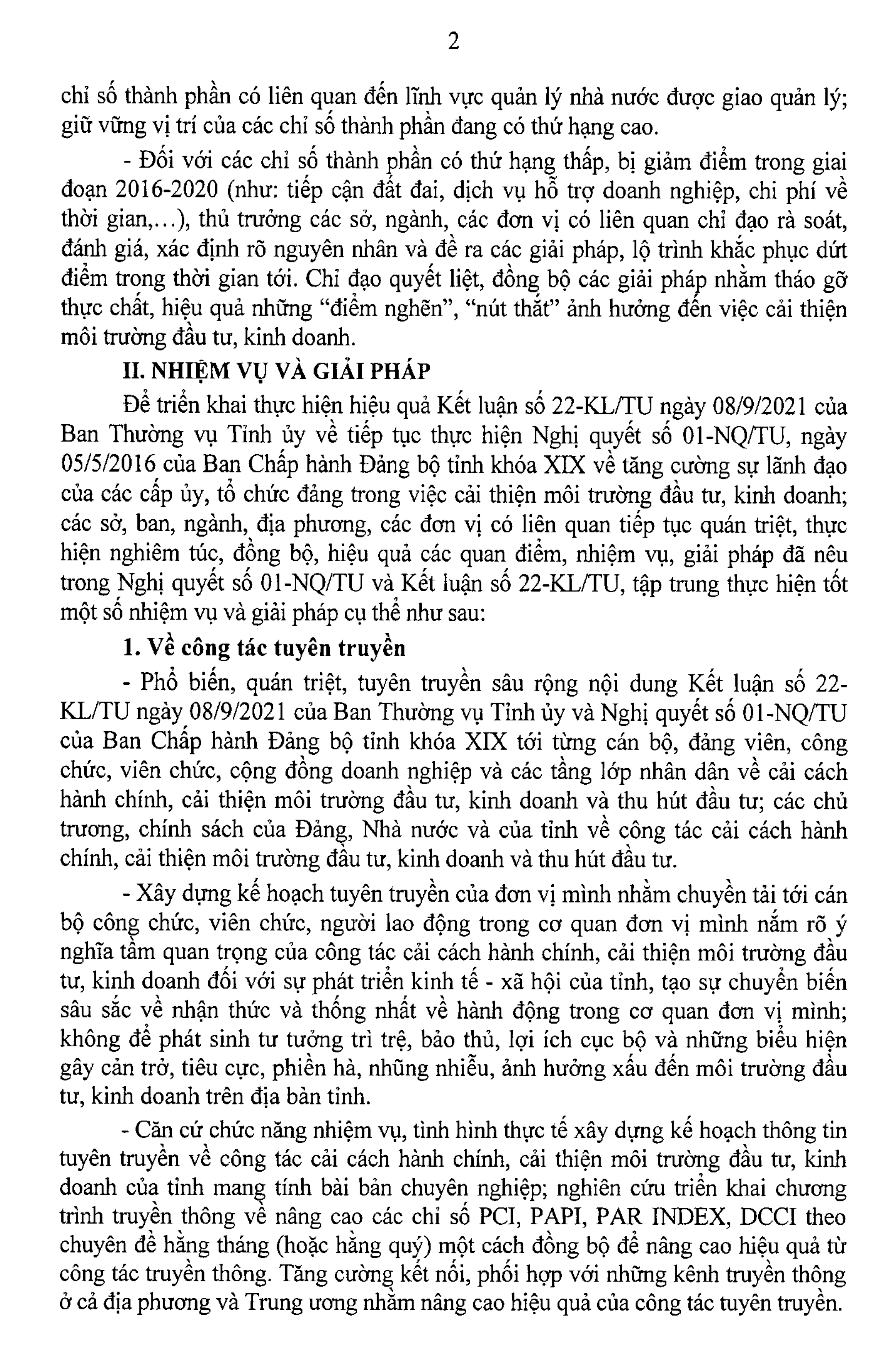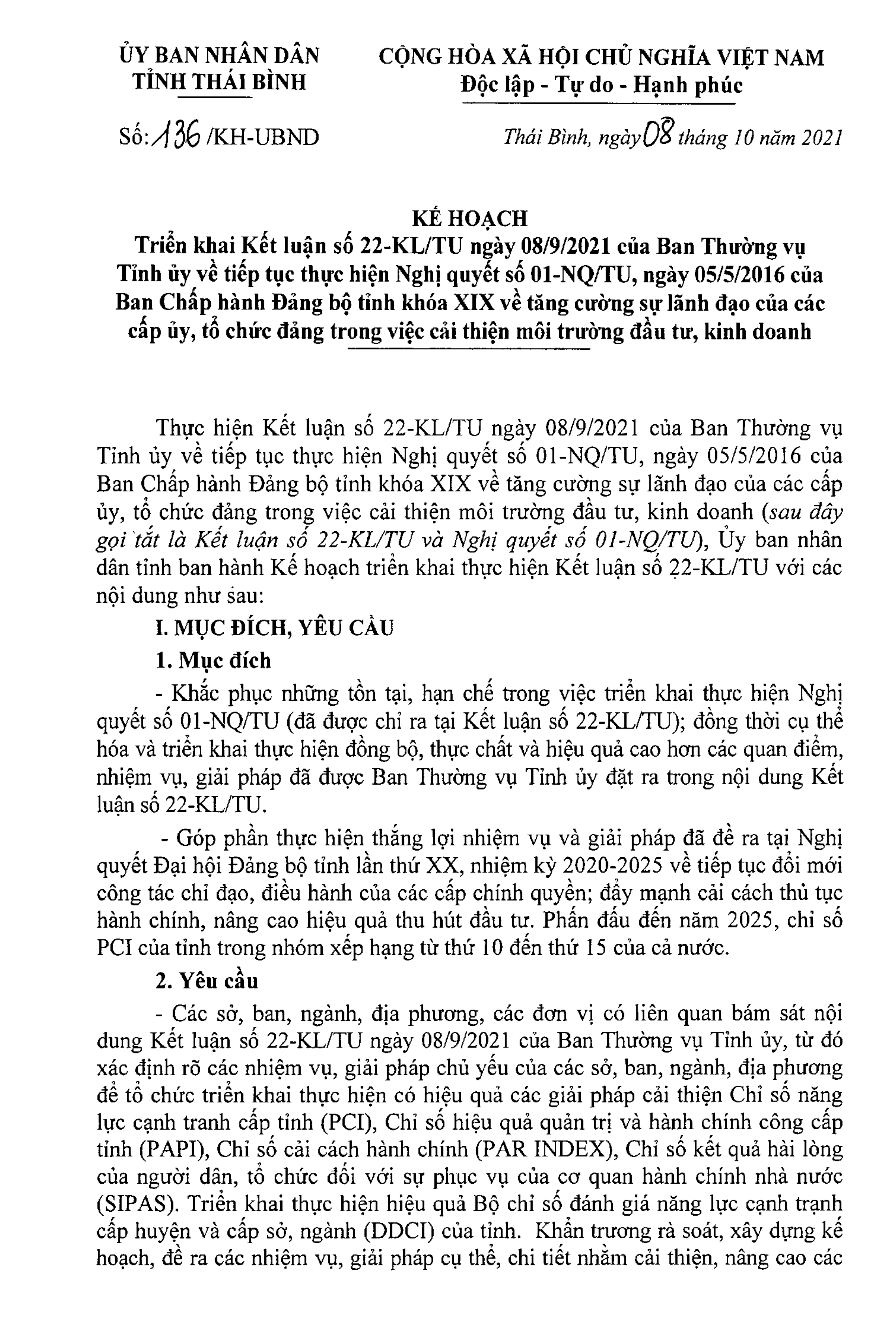 Kế hoạch số 136/KH-UBND ngày 8/10/2021 của UBND tỉnh về việc triển khai Kết luận số 22-KL/TU ngày 08/9/2021 của Ban Thường vụ Tỉnh ủy về tiếp tục thực hiện Nghị quyết số 01-NQ/TU, ngày 05/5/2016 của Ban Chấp hành Đảng bộ tỉnh khóa XIX về tăng cường sự lãnh đạo của các cấp ủy, tổ chức đảng trong việc cải thiện môi trường đầu tư, kinh doanh.