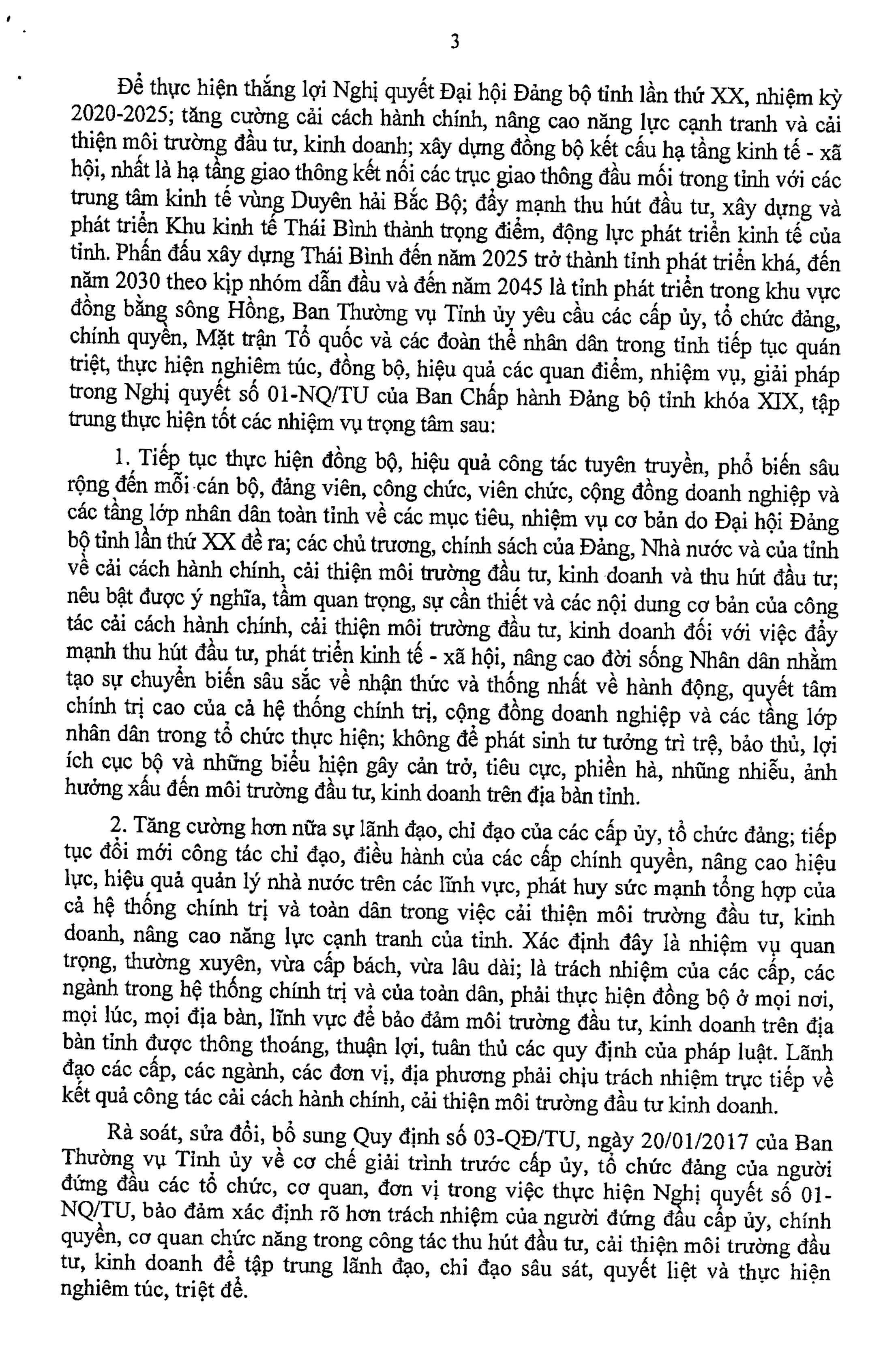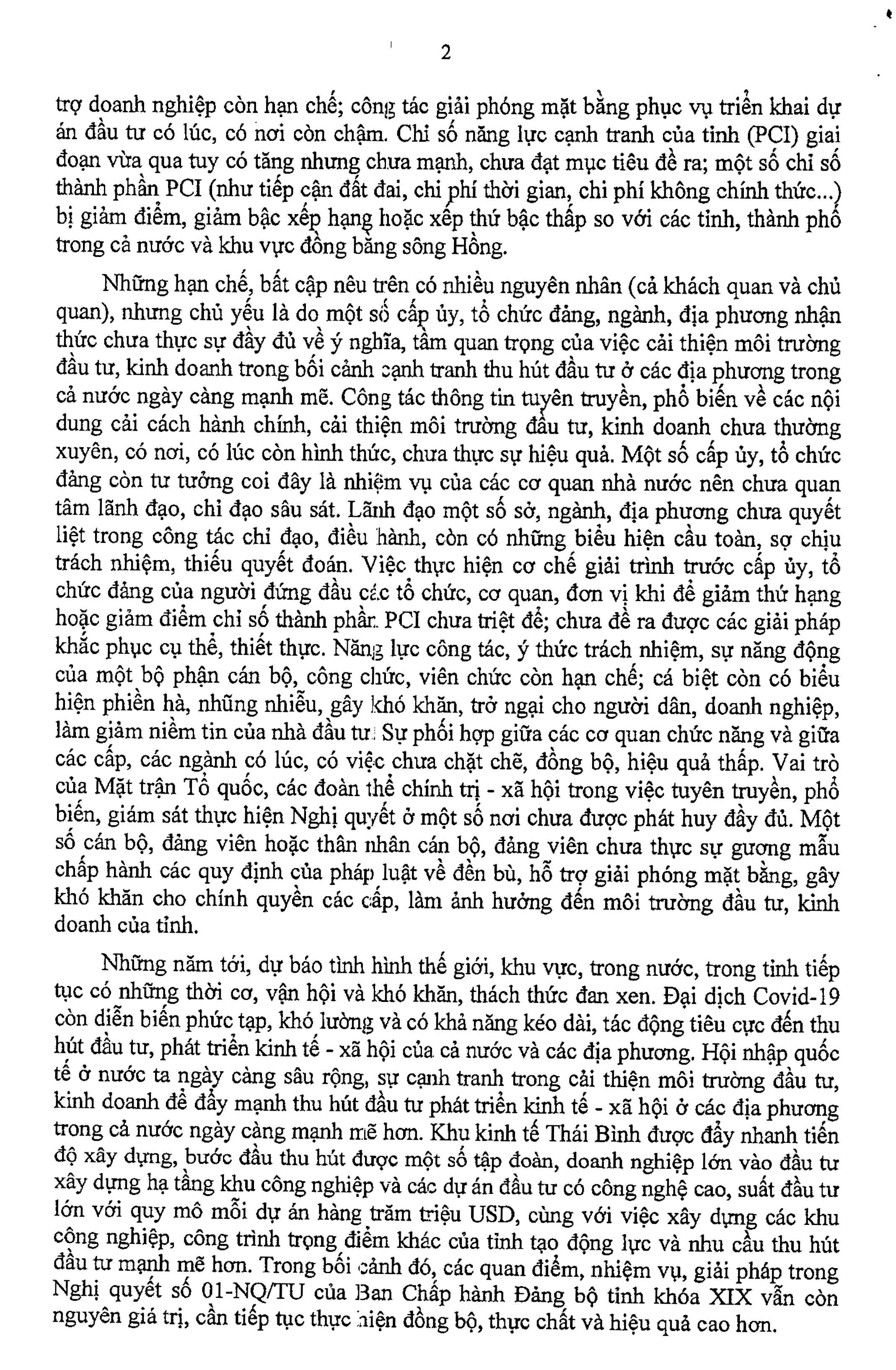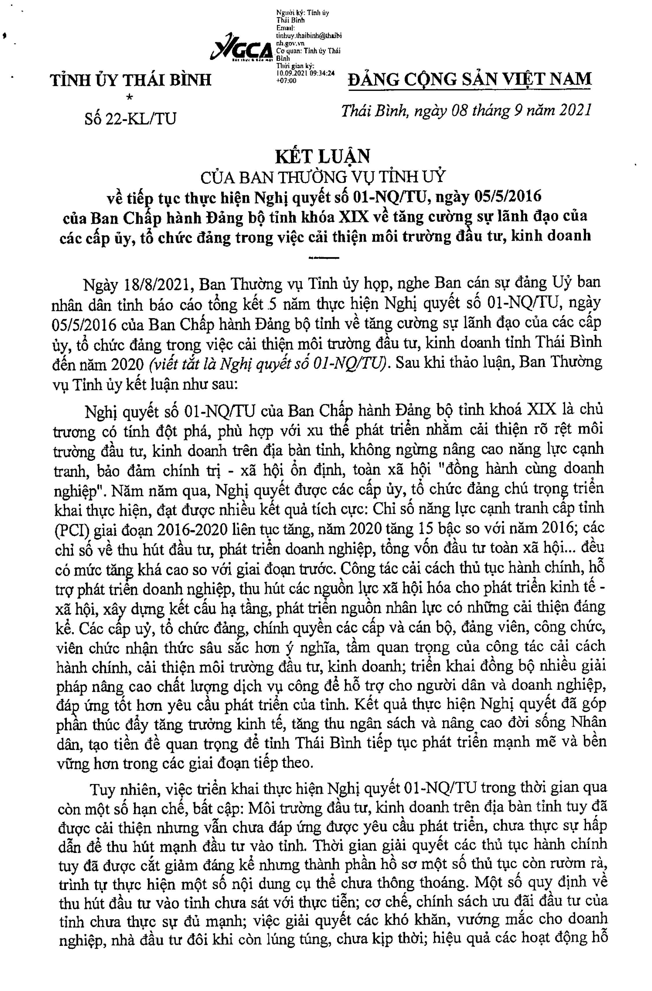 Kết luận số 22-KL/TU ngày 8/9/2021 của Ban Thường vụ Tỉnh ủy về việc tiếp tục thực hiện Nghị quyết số 01-NQ/TU, ngày 5/5/2016 của Ban Chấp hành Đảng bộ tỉnh khóa XIX về tăng cường sự lãnh đạo của các cấp ủy, tổ chức đảng trong việc cải thiện môi trường đầu tư, kinh doanh.