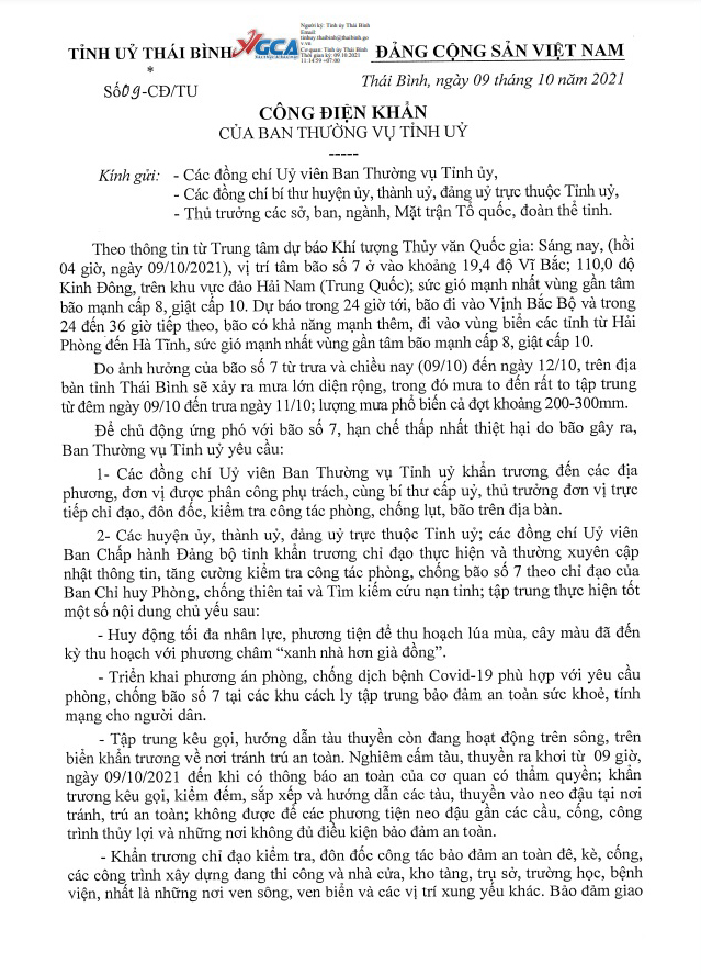 Ngày 09/10/2021, Ban Thường vụ Tỉnh ủy có công điện khẩn số 09-CĐ/TU về việc chủ động ứng phó với bão số 7.
