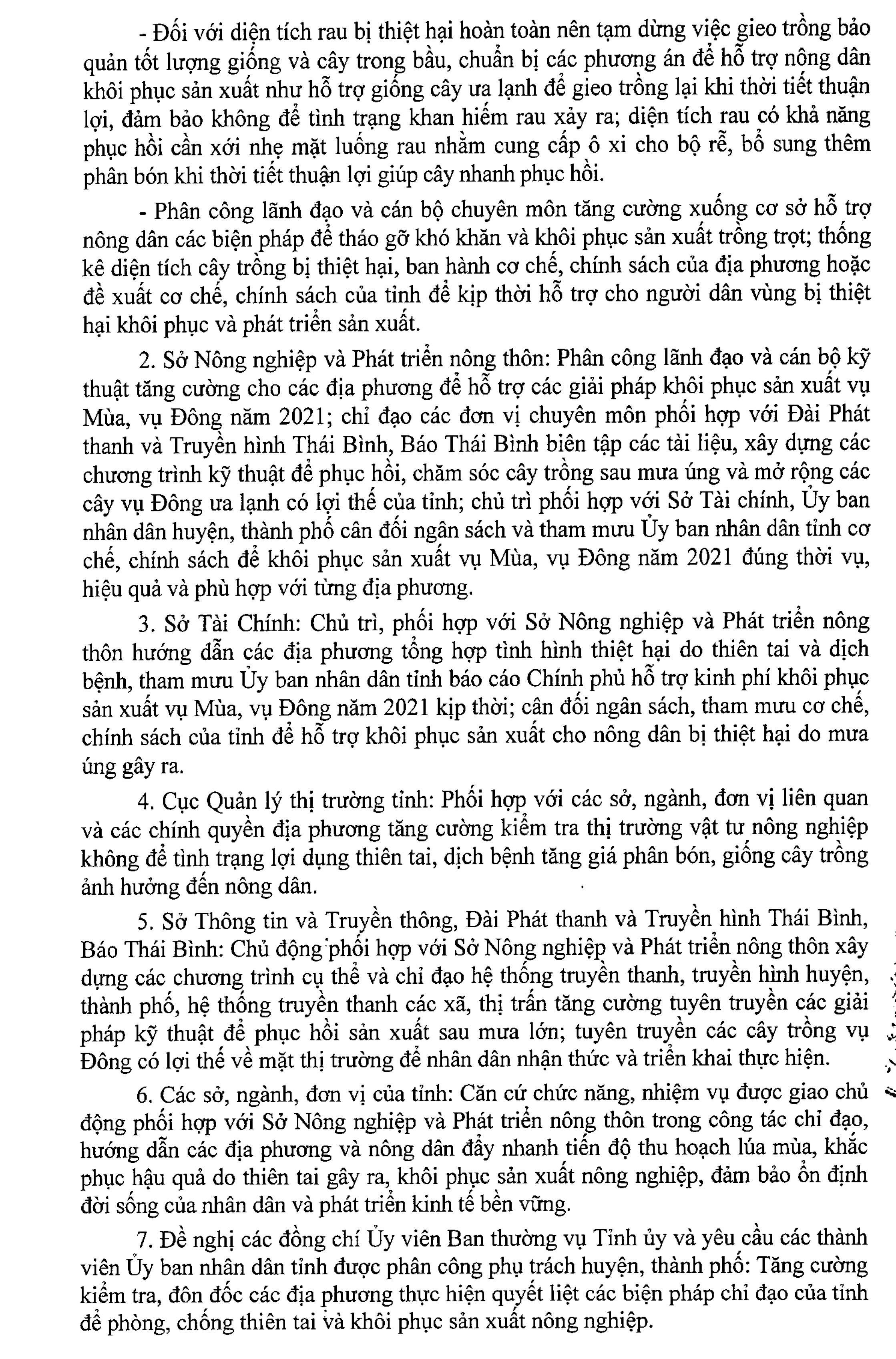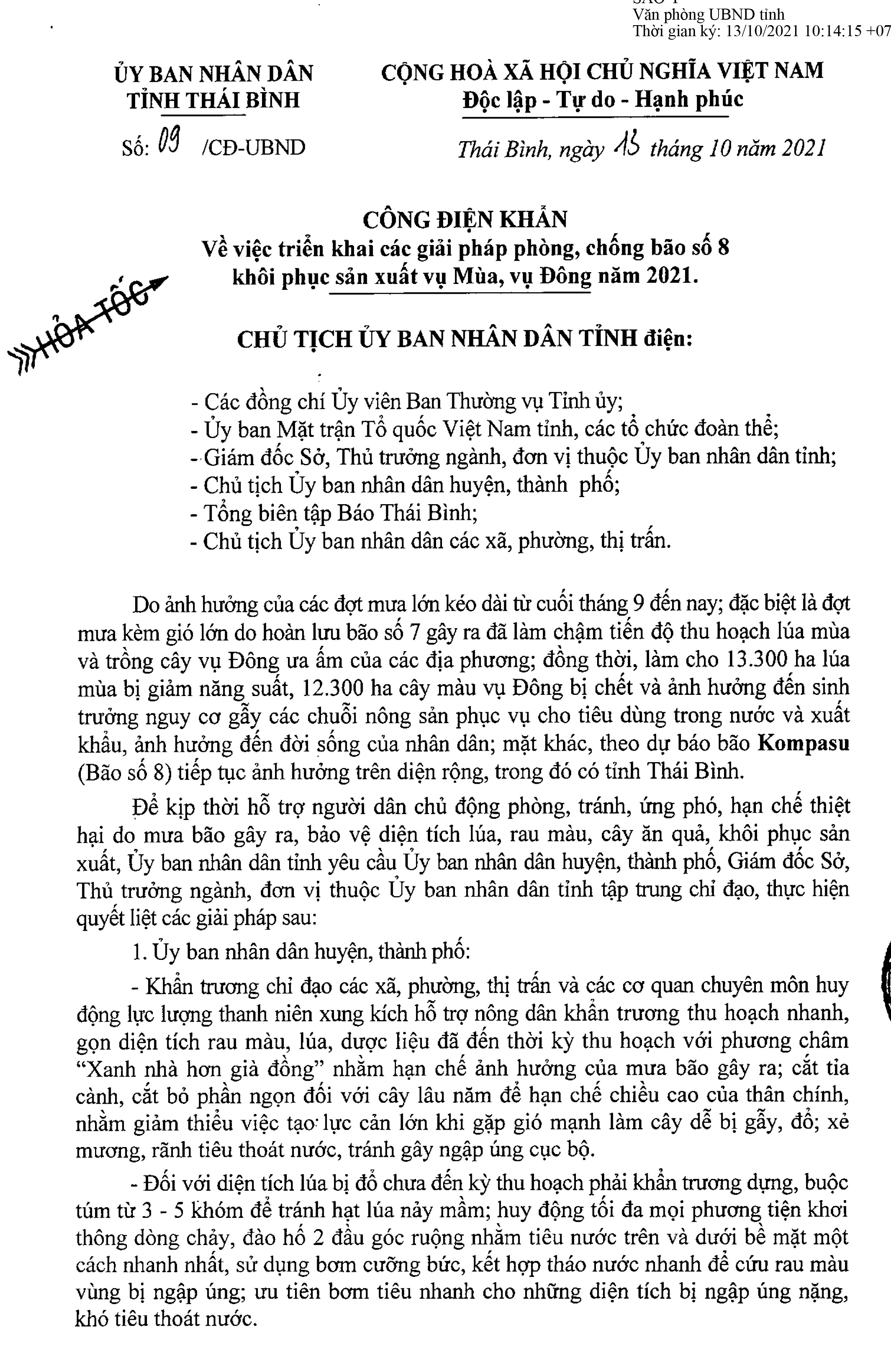 Công điện số 09/CĐ-UBND ngày 13/10/2021 của Ủy ban nhân dân tỉnh Thái Bình về việc triển khai các giải pháp phòng, chống bão số 8 khôi phục sản xuất vụ Mùa, vụ Đông năm 2021.