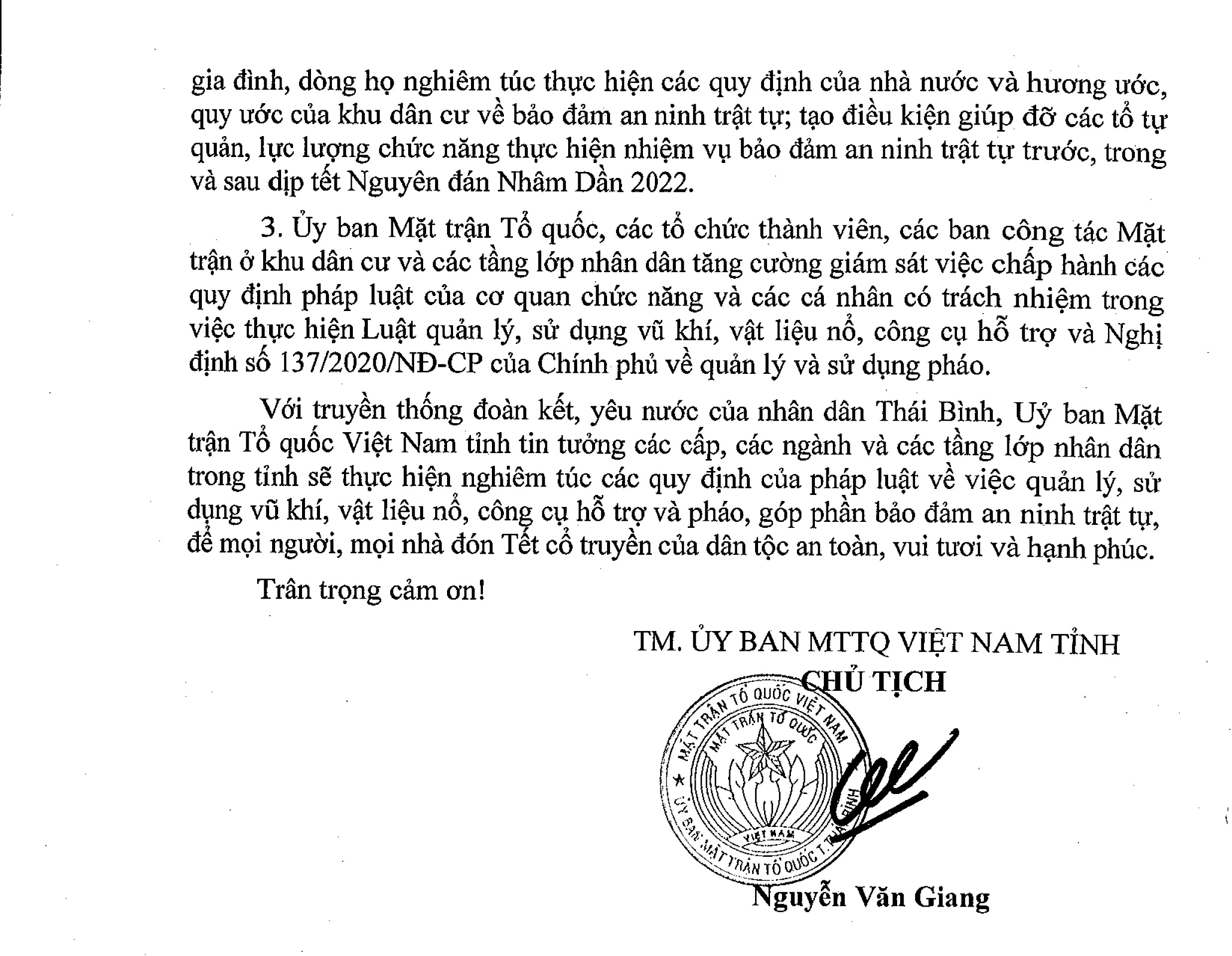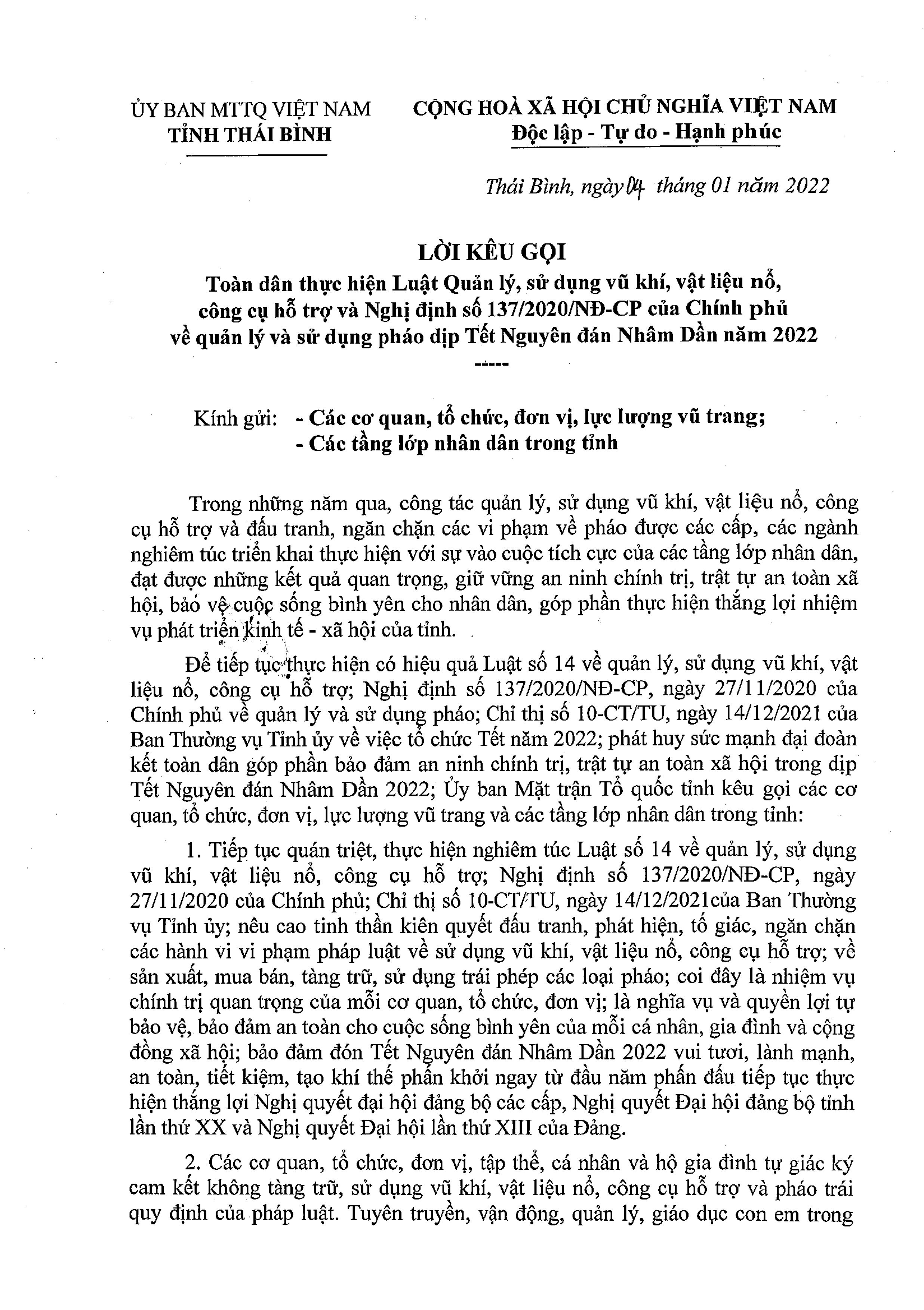 Ngày 4/1/2022, Ủy ban MTTQ Việt Nam tỉnh Thái Bình ra Lời kêu gọi toàn dân thực hiện Luật Quản lý, sử dụng vũ khí, vật liệu nổ, công cụ hỗ trợ và Nghị định số 137/2020/NĐ-CP của Chính phủ về quản lý và sử dụng pháo dịp tết Nguyên đán Nhâm Dần năm 2022.