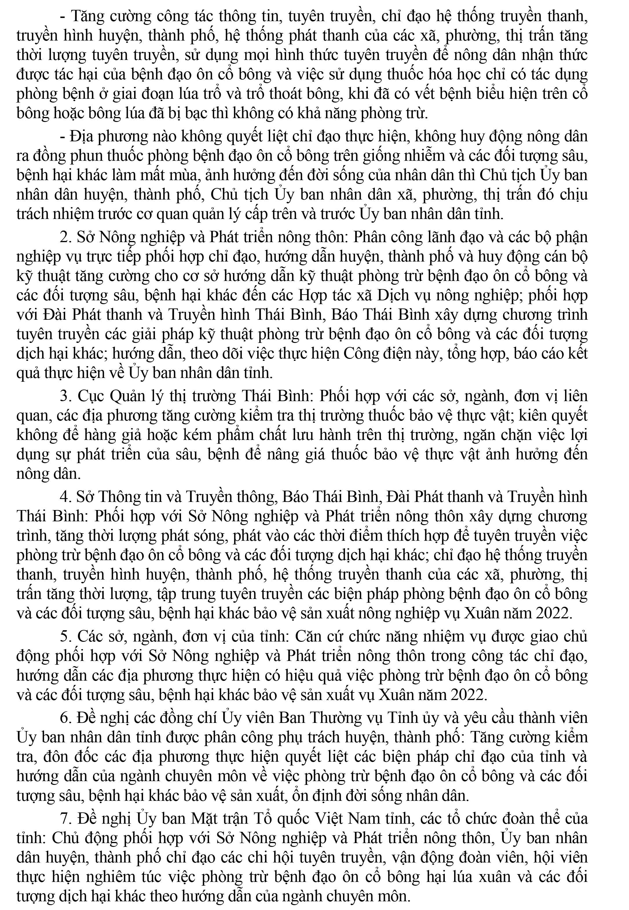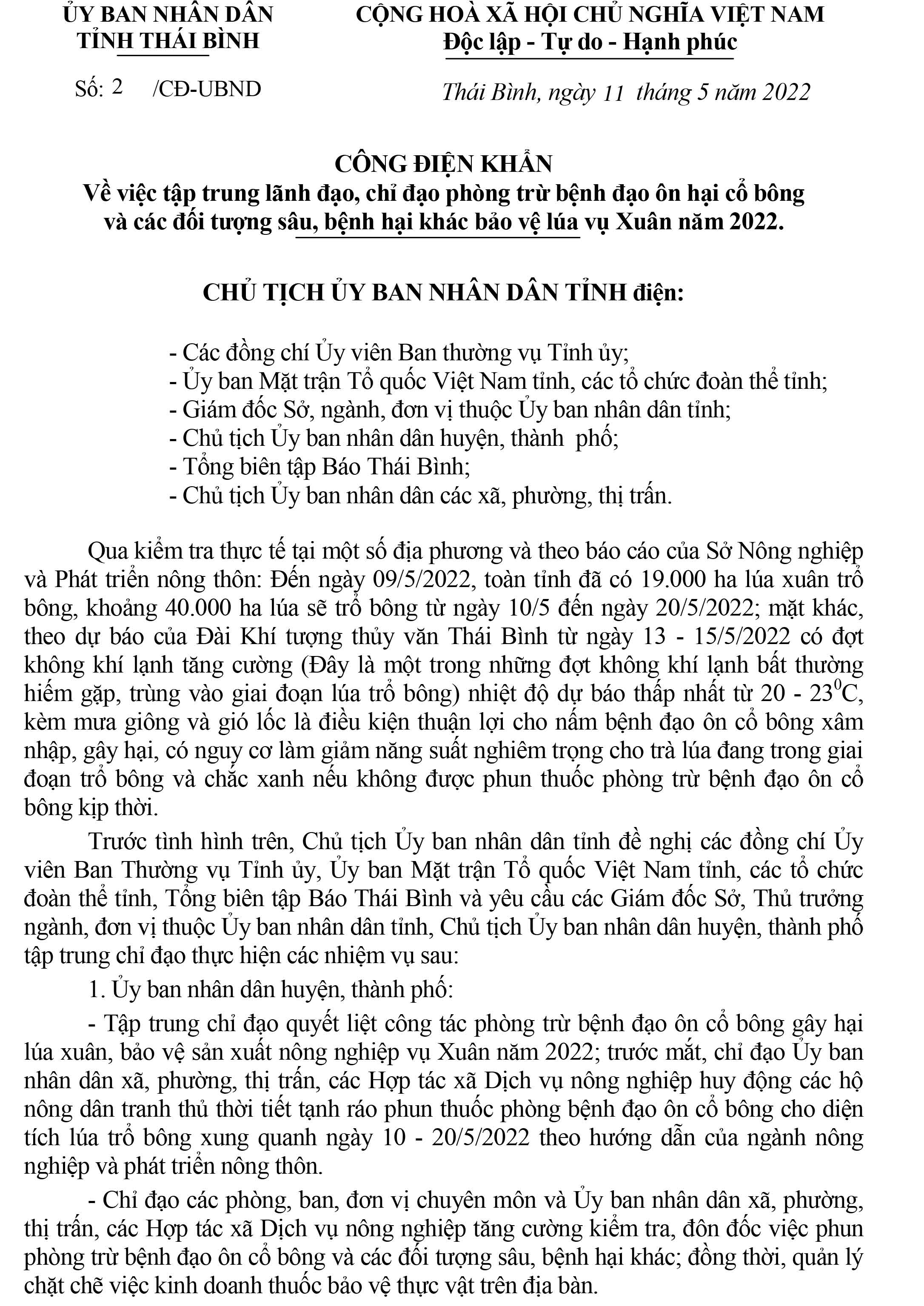Ngày 11/5/2022, Ủy ban nhân dân tỉnh Thái Bình ban hành Công điện khẩn số 02/CĐ-UBND về việc tập trung lãnh đạo, chỉ đạo phòng trừ bệnh đạo ôn hại cổ bông và các đối tượng sâu, bệnh hại khác bảo vệ lúa vụ Xuân năm 2022.