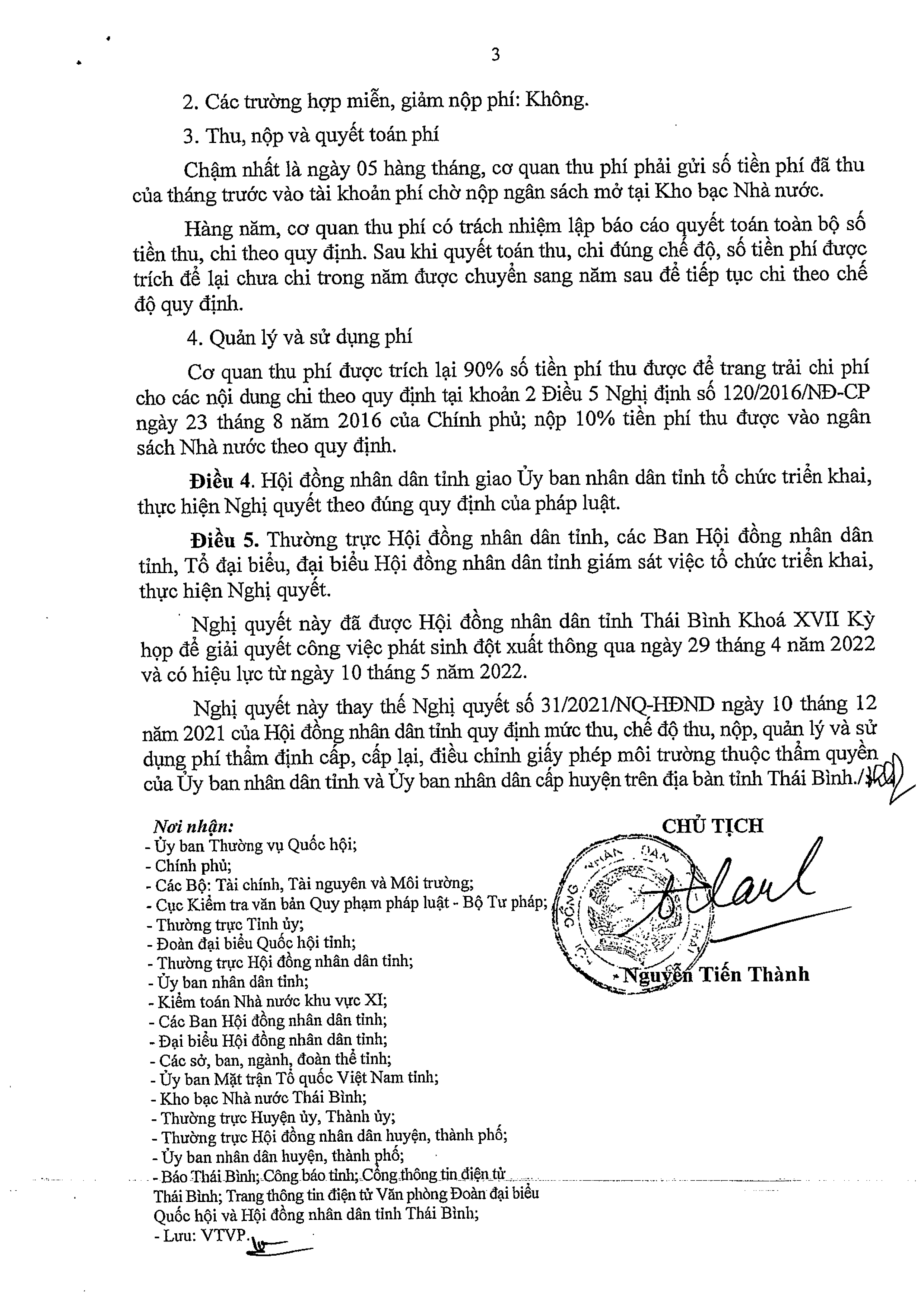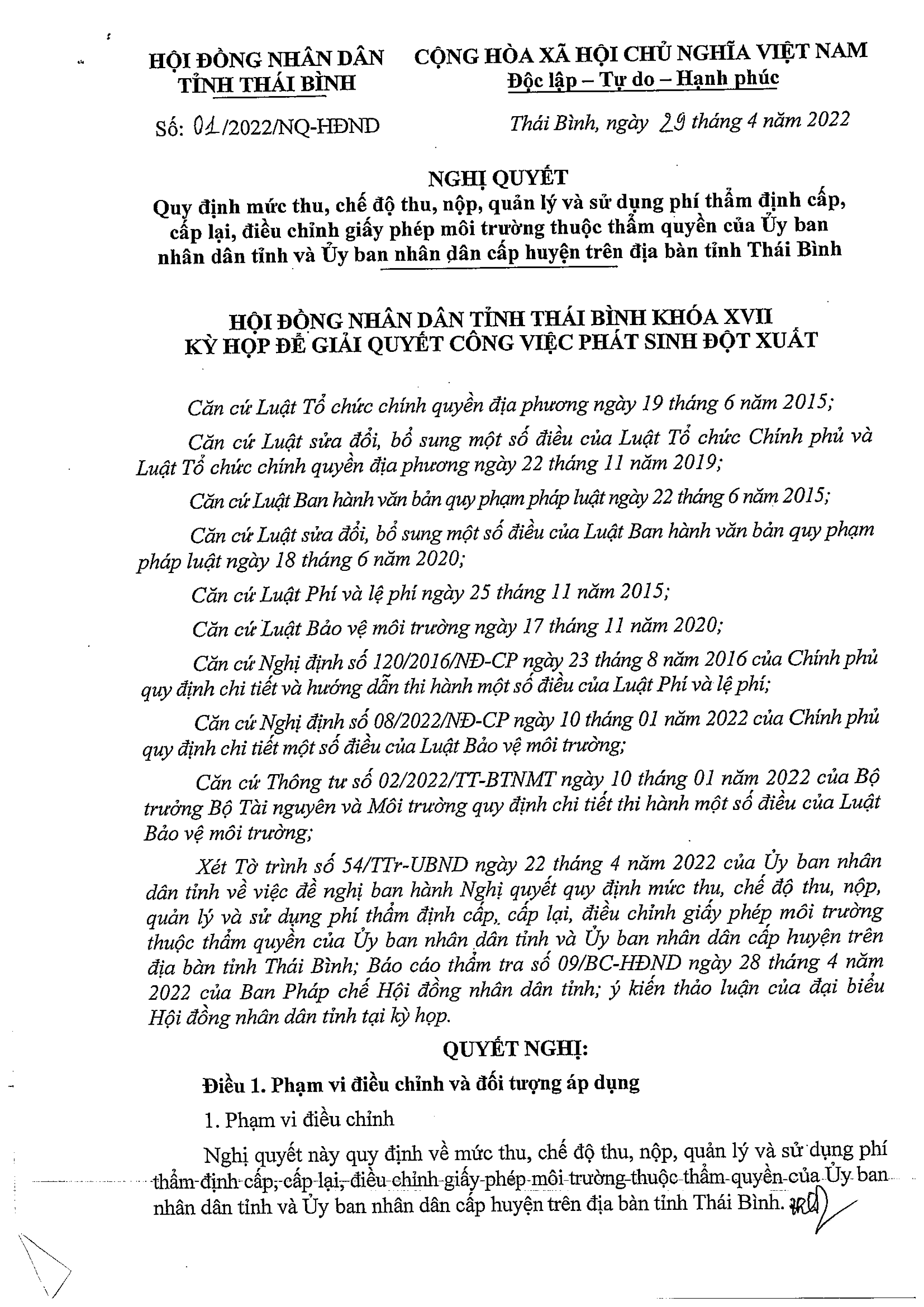 Nghị quyết Quy định mức thu, chế độ thu, nộp, quản lý và sử dụng phí thẩm định cấp, cấp lại, điều chỉnh giấy phép môi trường thuộc thẩm quyền của UBND tỉnh và UBND cấp huyện trên địa bàn tỉnh Thái Bình