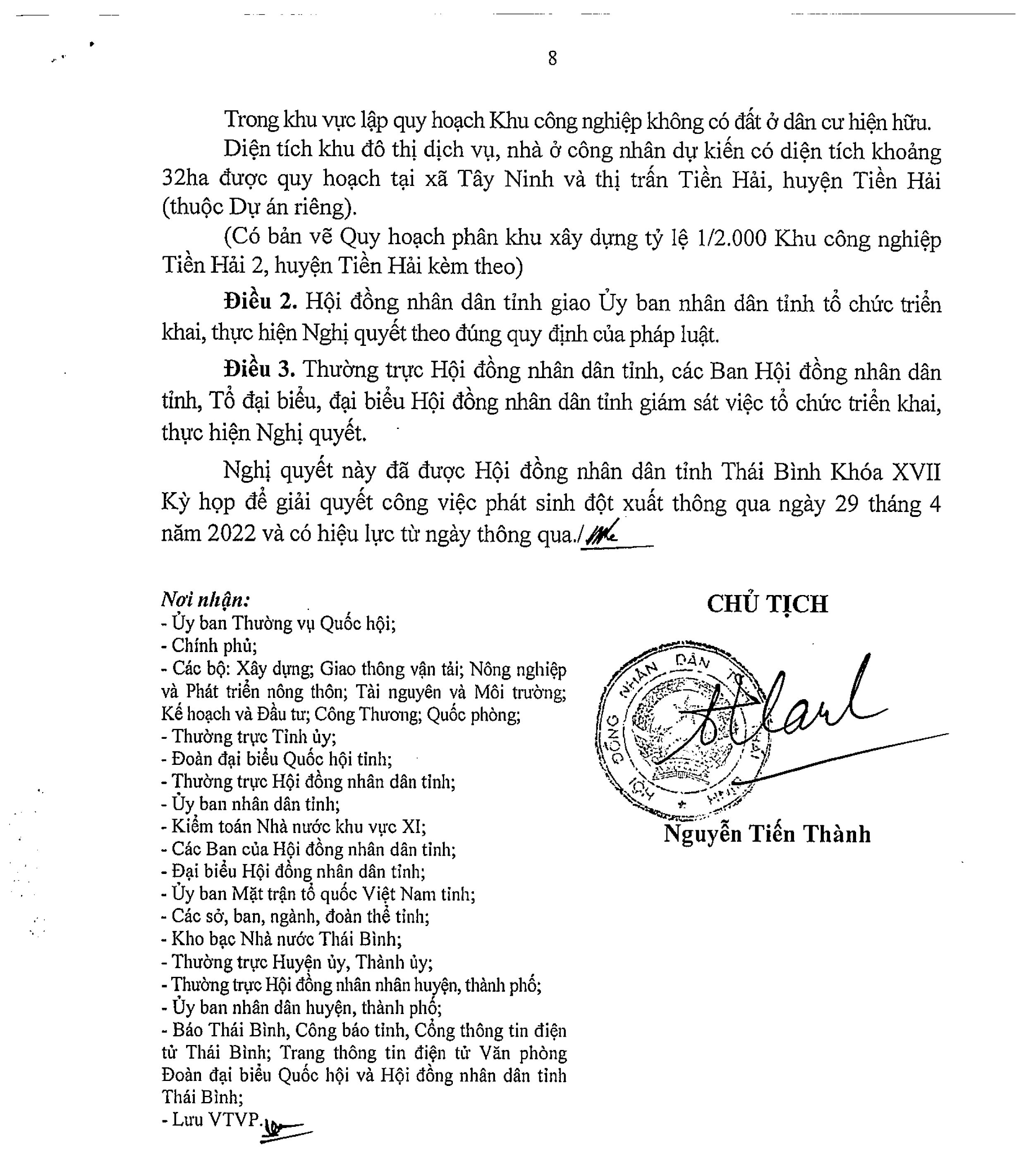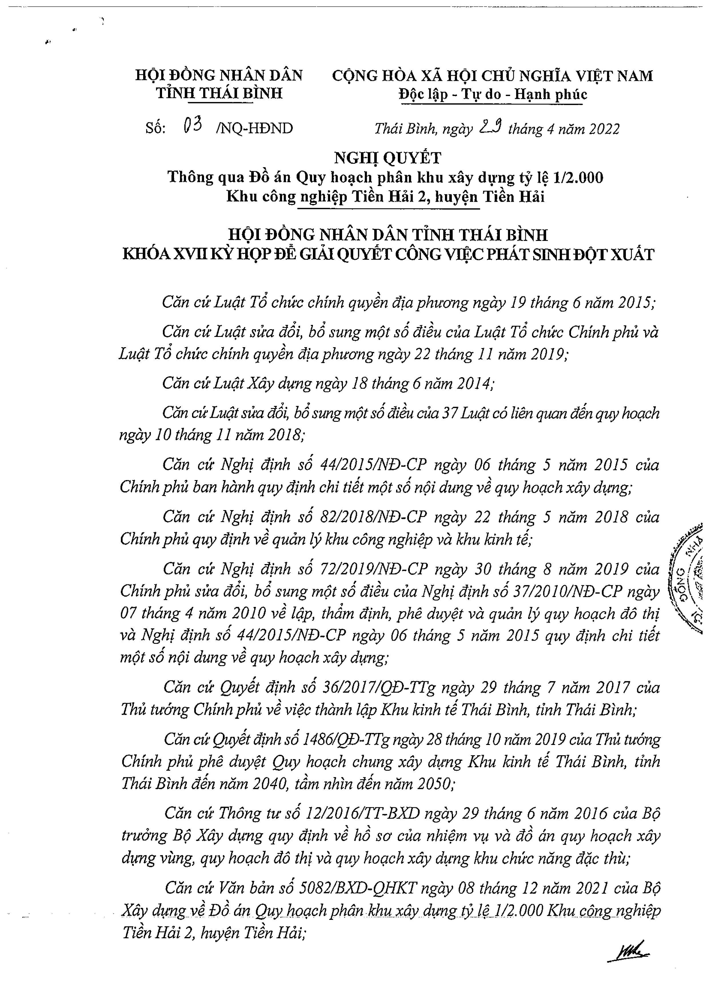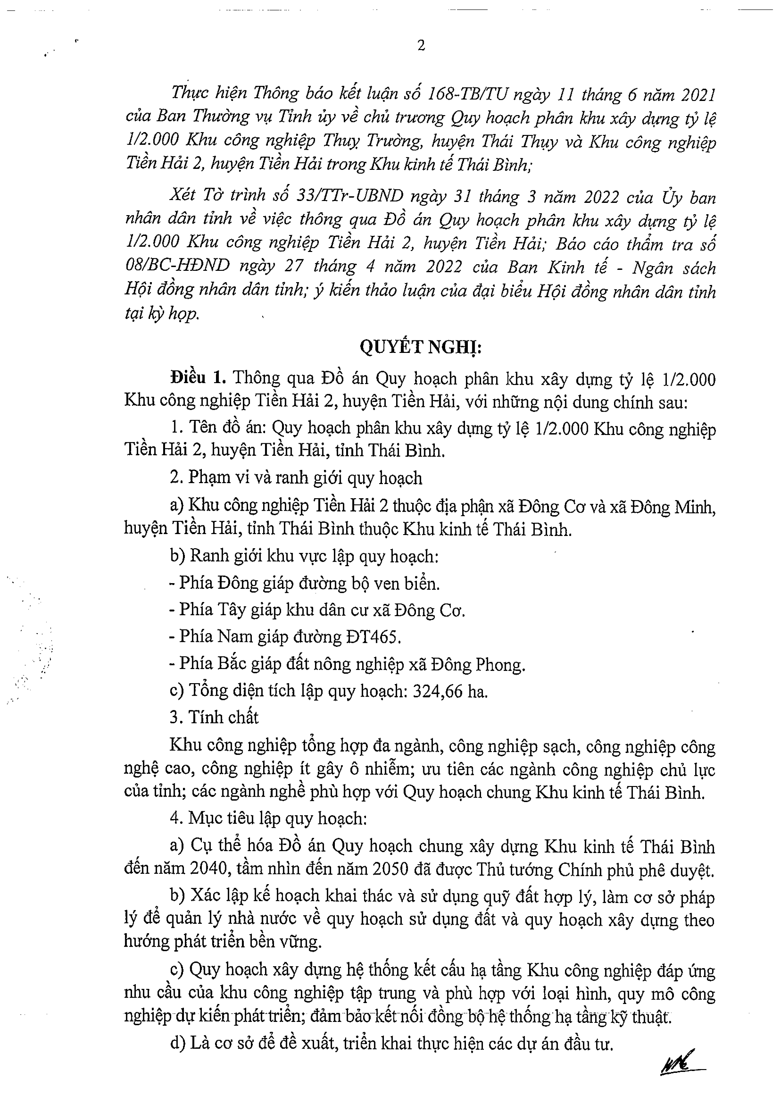 Nghị quyết thông qua Đồ án Quy hoạch phân khu xây dựng tỷ lệ 1/2.000 Khu công nghiệp Tiền Hải 2, huyện Tiền Hải