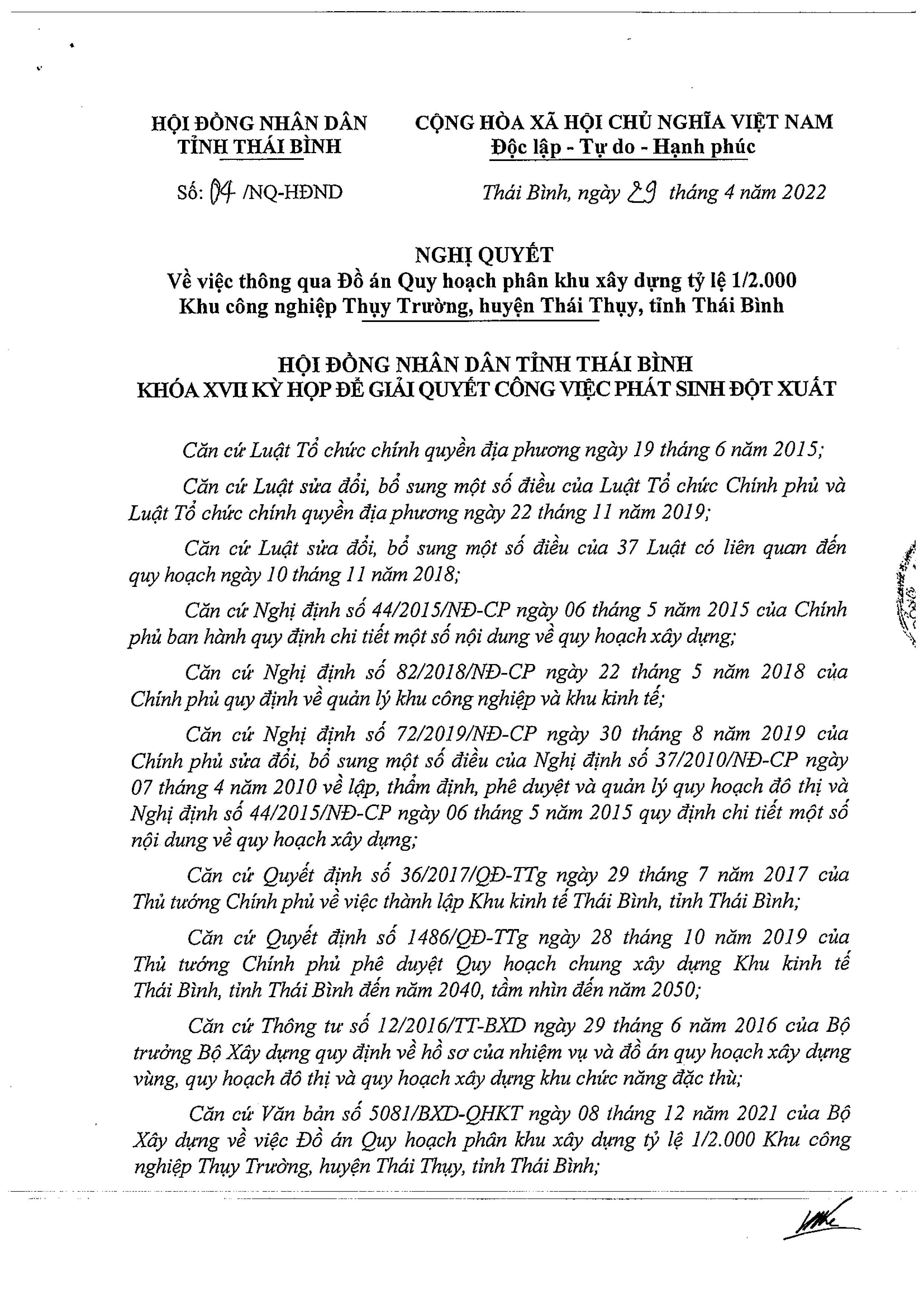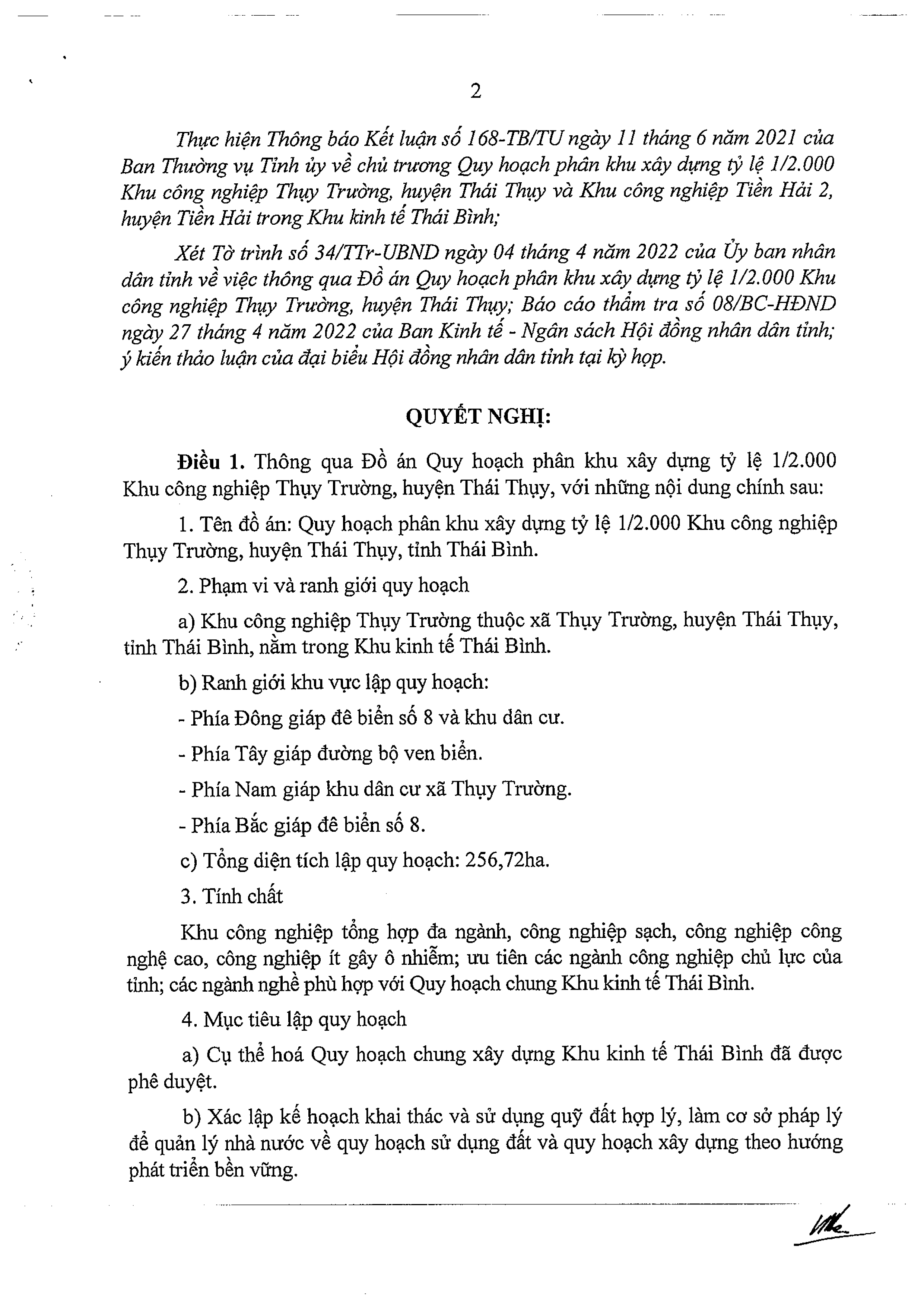 Nghị quyết về việc thông qua Đồ án Quy hoạch phân khu xây dựng tỷ lệ 1/2.000 Khu công nghiệp Thụy Trường, huyện Thái Thụy, tỉnh Thái Bình