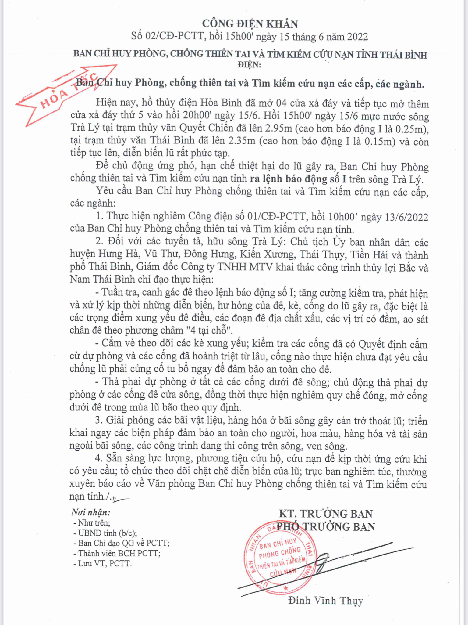 Công điện khẩn số 02 của Ban Chỉ huy Phòng, chống thiên tai và Tìm kiếm cứu nạn tỉnh Thái Bình