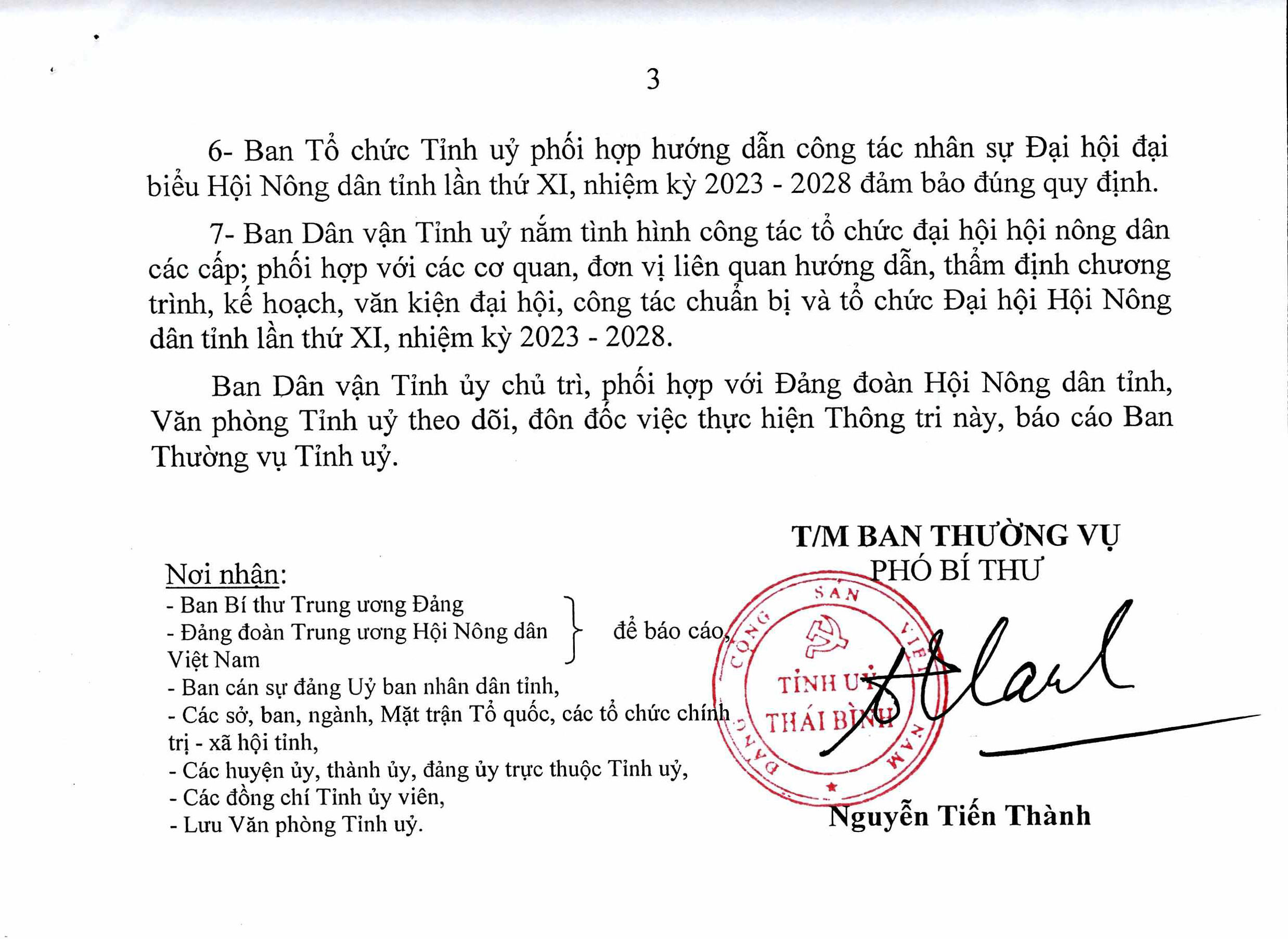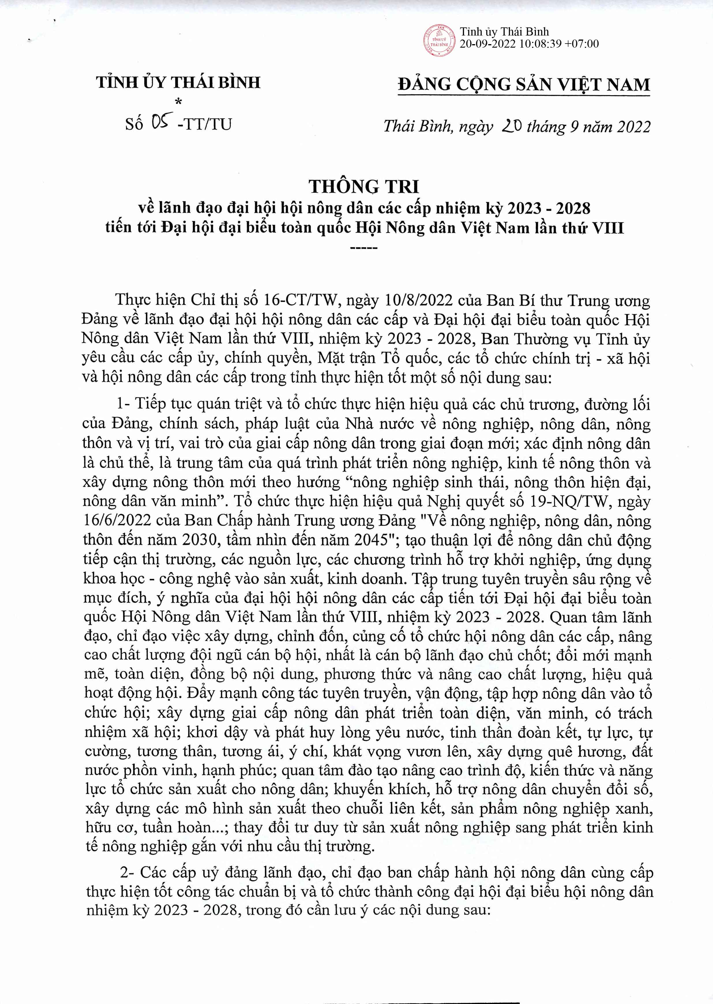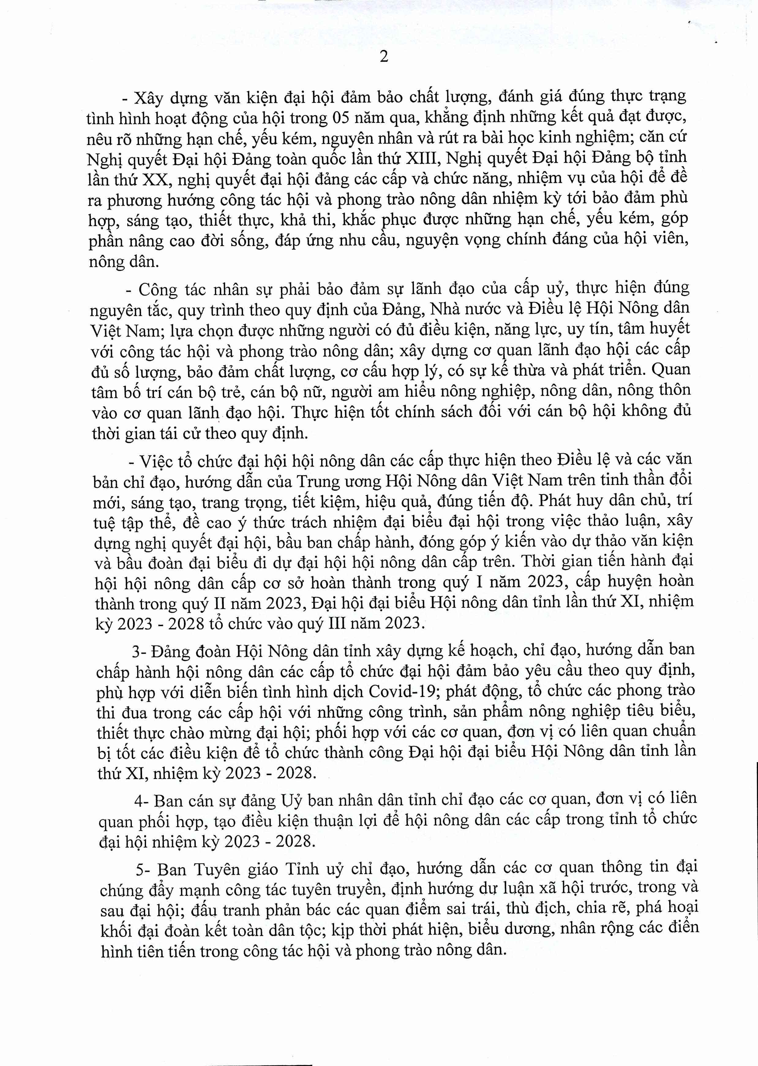 Thông tri về lãnh đạo đại hội hội nông dân các cấp nhiệm kỳ 2023-2028 tiến tới Đại hội đại biểu toàn quốc Hội Nông dân Việt Nam lần thứ VIII