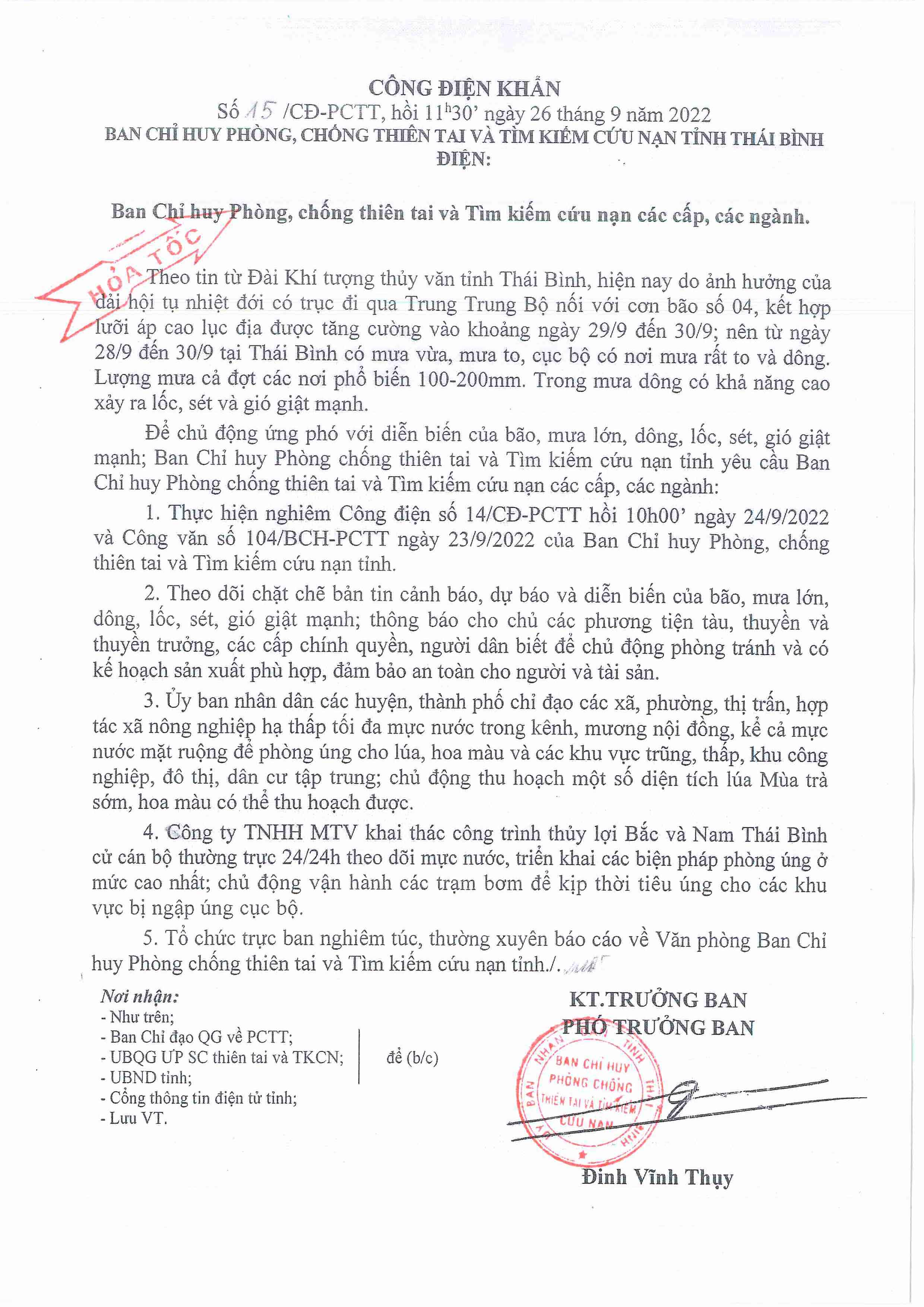 Công điện khẩn số 15/CĐ-PCTT của Ban Chỉ huy PCTT và TKCN tỉnh Thái Bình