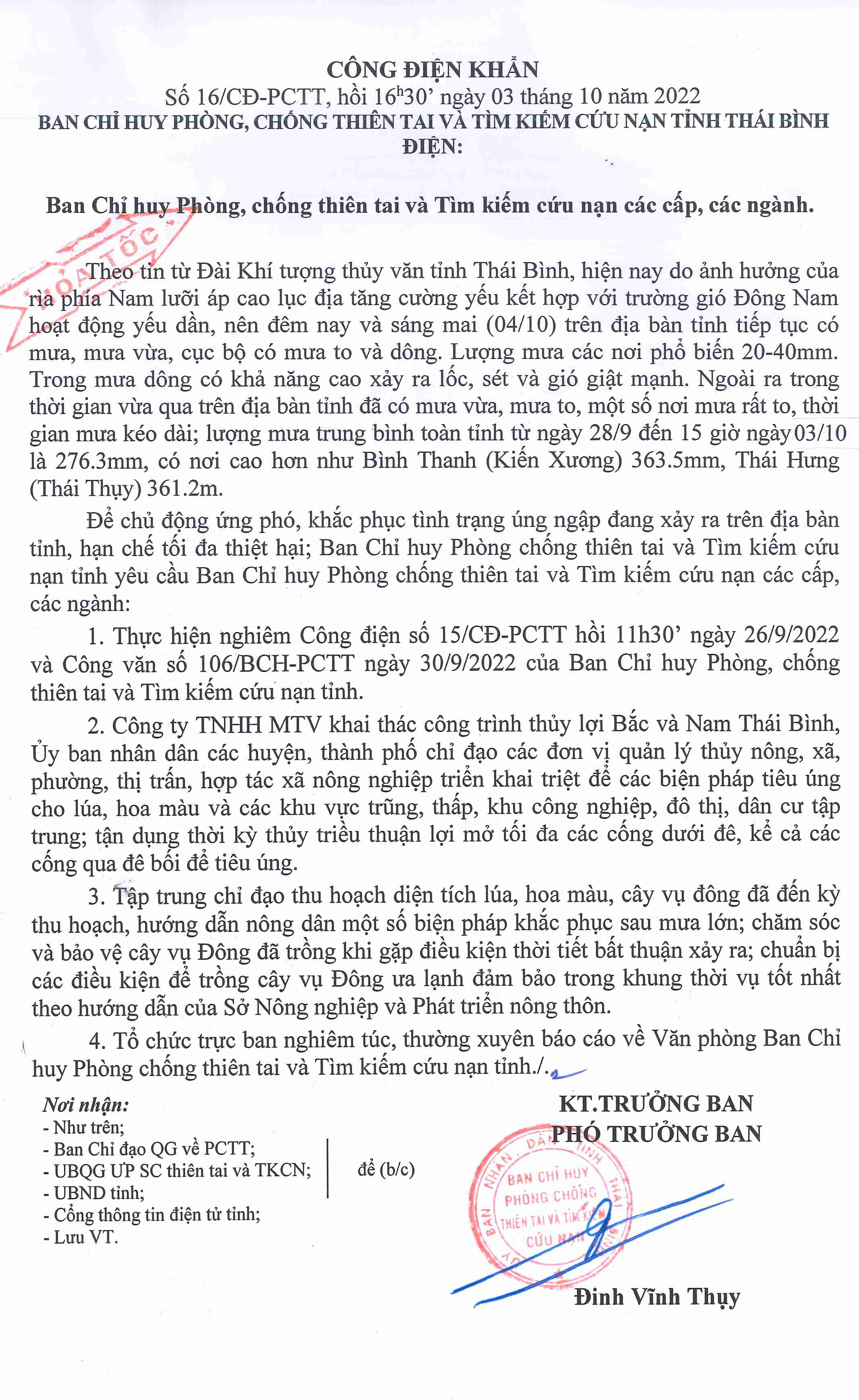 Công điện khẩn số 16/CĐ-PCTT của Ban Chỉ huy PCTT và TKCN tỉnh Thái Bình