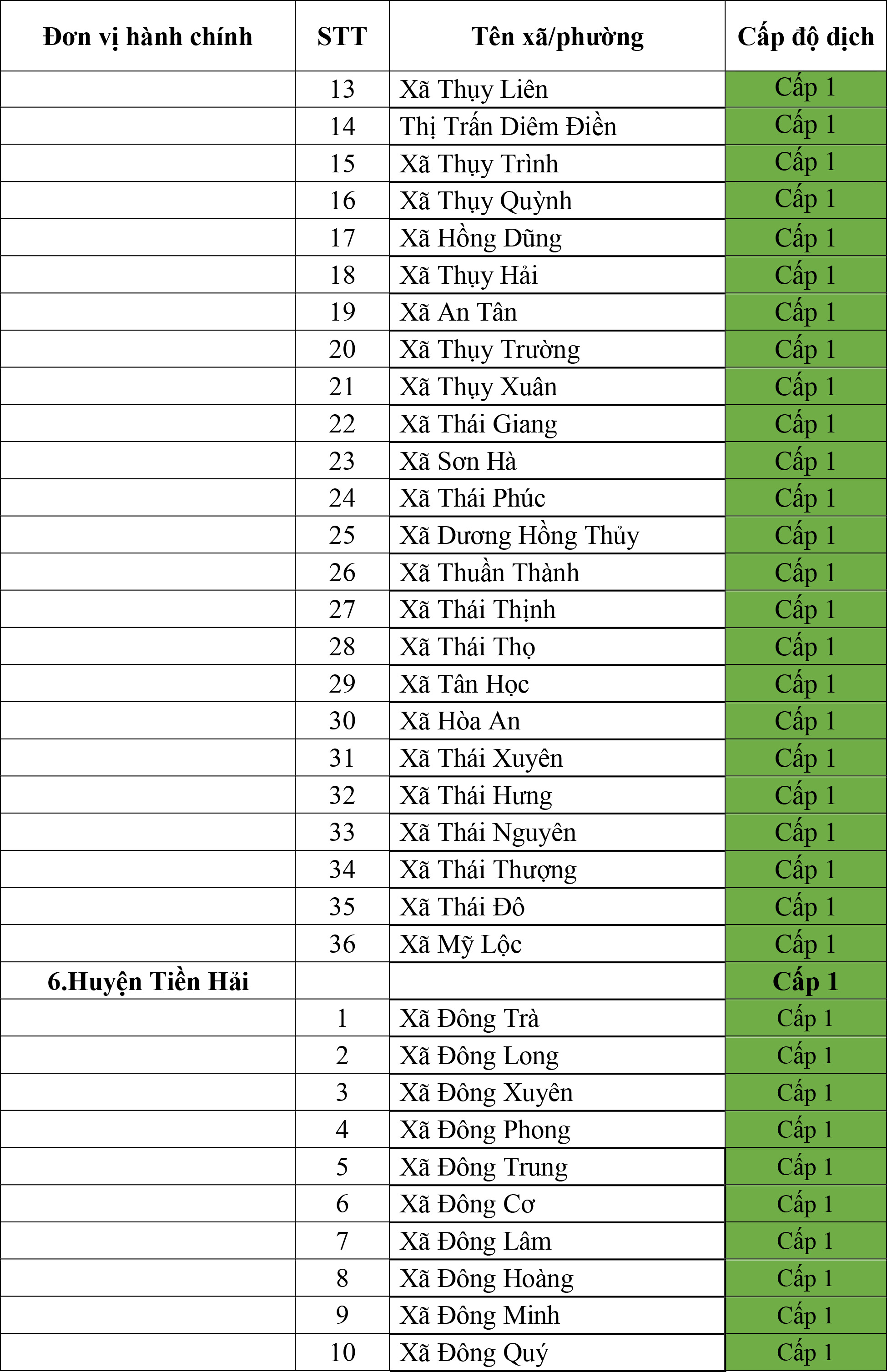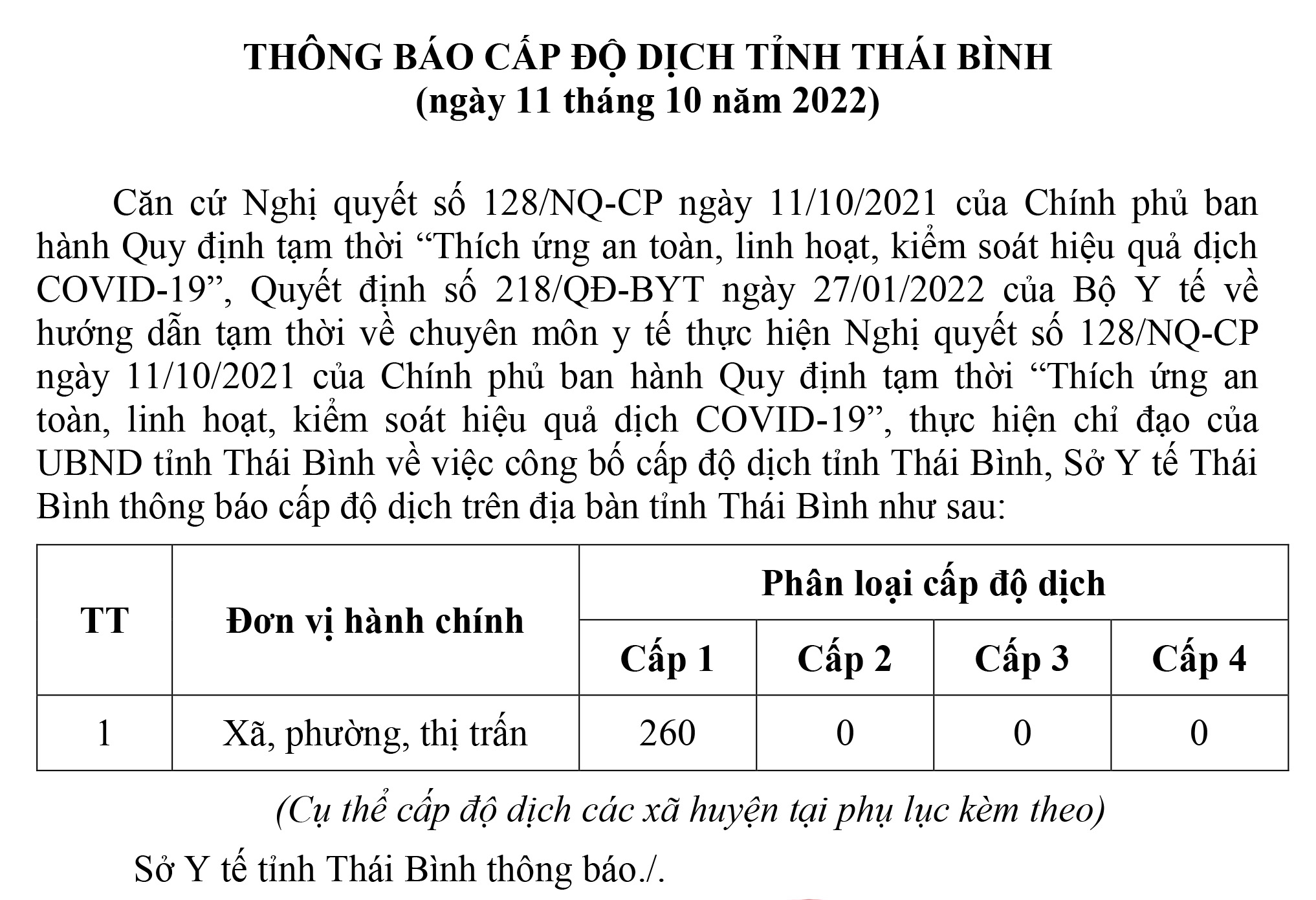 Thông báo cấp độ dịch tỉnh Thái Bình (ngày 11/10/2022)