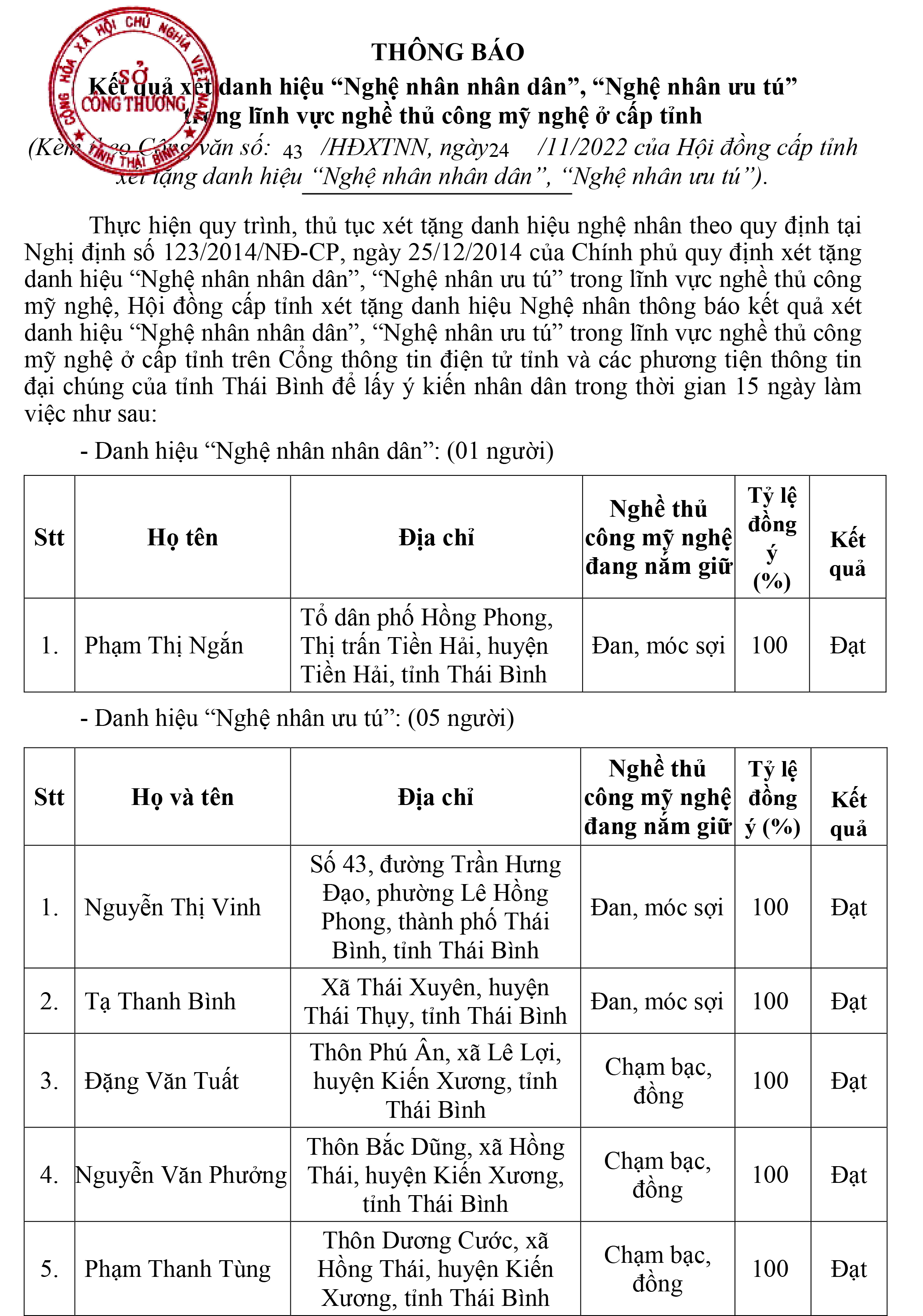 Thông báo kết quả xét danh hiệu “Nghệ nhân nhân dân”, “Nghệ nhân ưu tú” trong lĩnh vực nghề thủ công mỹ nghệ ở cấp tỉnh