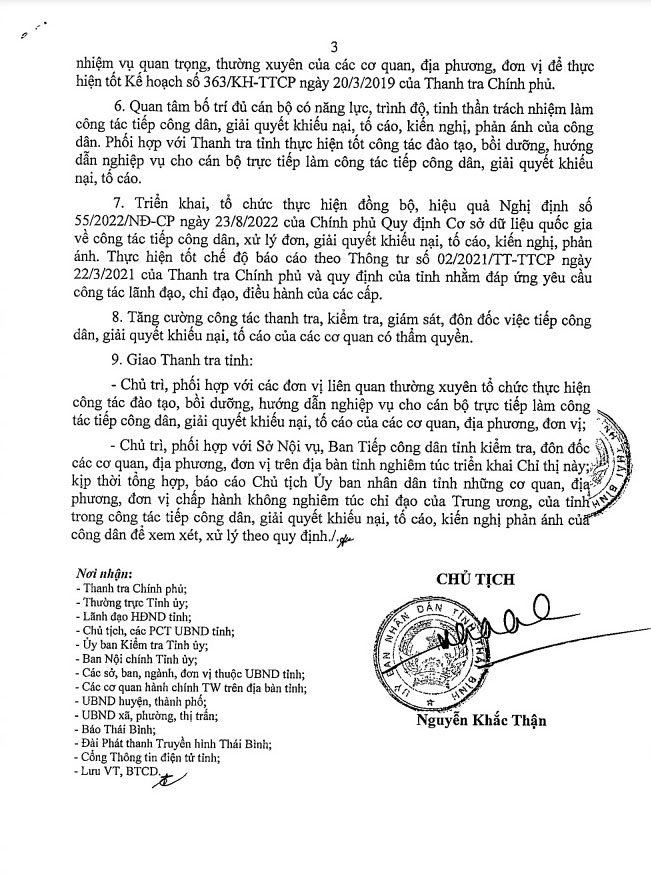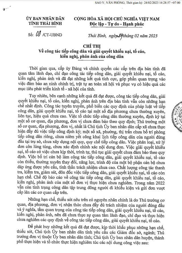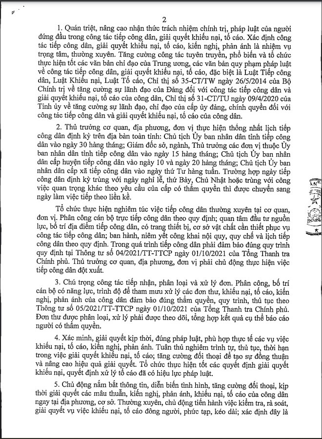 Ngày 24/2, UBND tỉnh có Chỉ thị số 03/CT-UBND về công tác tiếp công dân và giải quyết khiếu nại, tố cáo, kiến nghị, phản ánh của công dân.