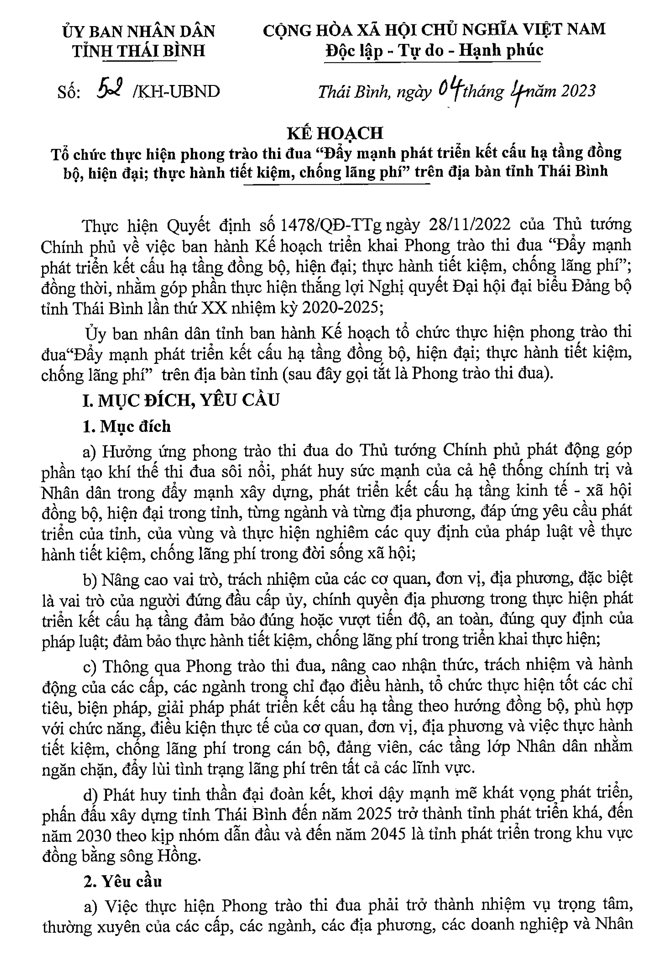Kế hoạch số 52/KH-UBND ngày 4/4/2023 của Ủy ban nhân dân tỉnh về tổ chức thực hiện phong trào thi đua ''Đẩy mạnh phát triển kết cấu hạ tầng đồng bộ, hiện đại; thực hành tiết kiệm, chống lãng phí'' trên địa bàn tỉnh Thái Bình.