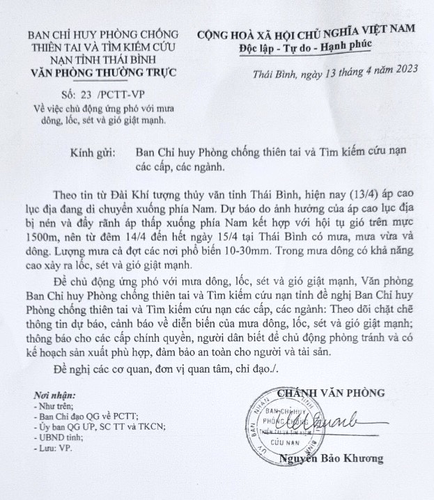 - Công điện khẩn số 10 của Ban chỉ huy PCTT và TKCN tỉnh Thái Bình điện Ban chỉ huy PCTT và TKCN các cấp, các ngành 03.09.2024 | 22:24 PM