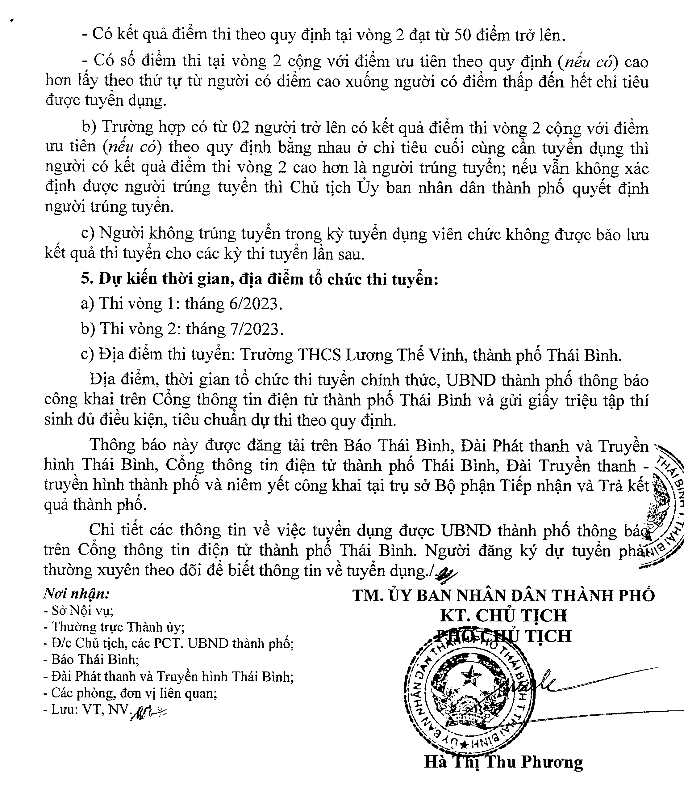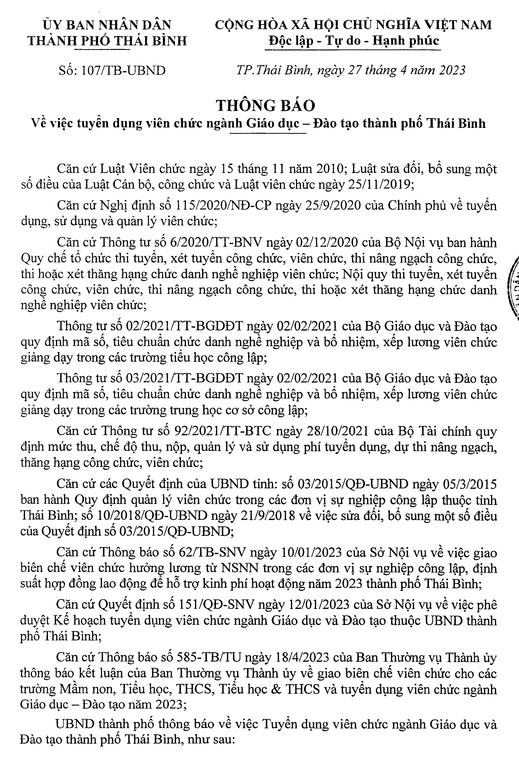 Thông báo về việc tuyển dụng viên chức ngành giáo dục - đào tạo thành phố Thái Bình