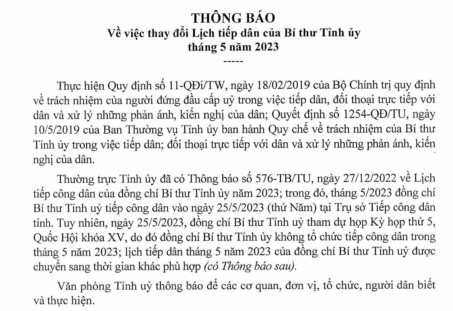 Thông báo về việc thay đổi Lịch tiếp công dân của Bí thư Tỉnh ủy tháng 5 năm 2023