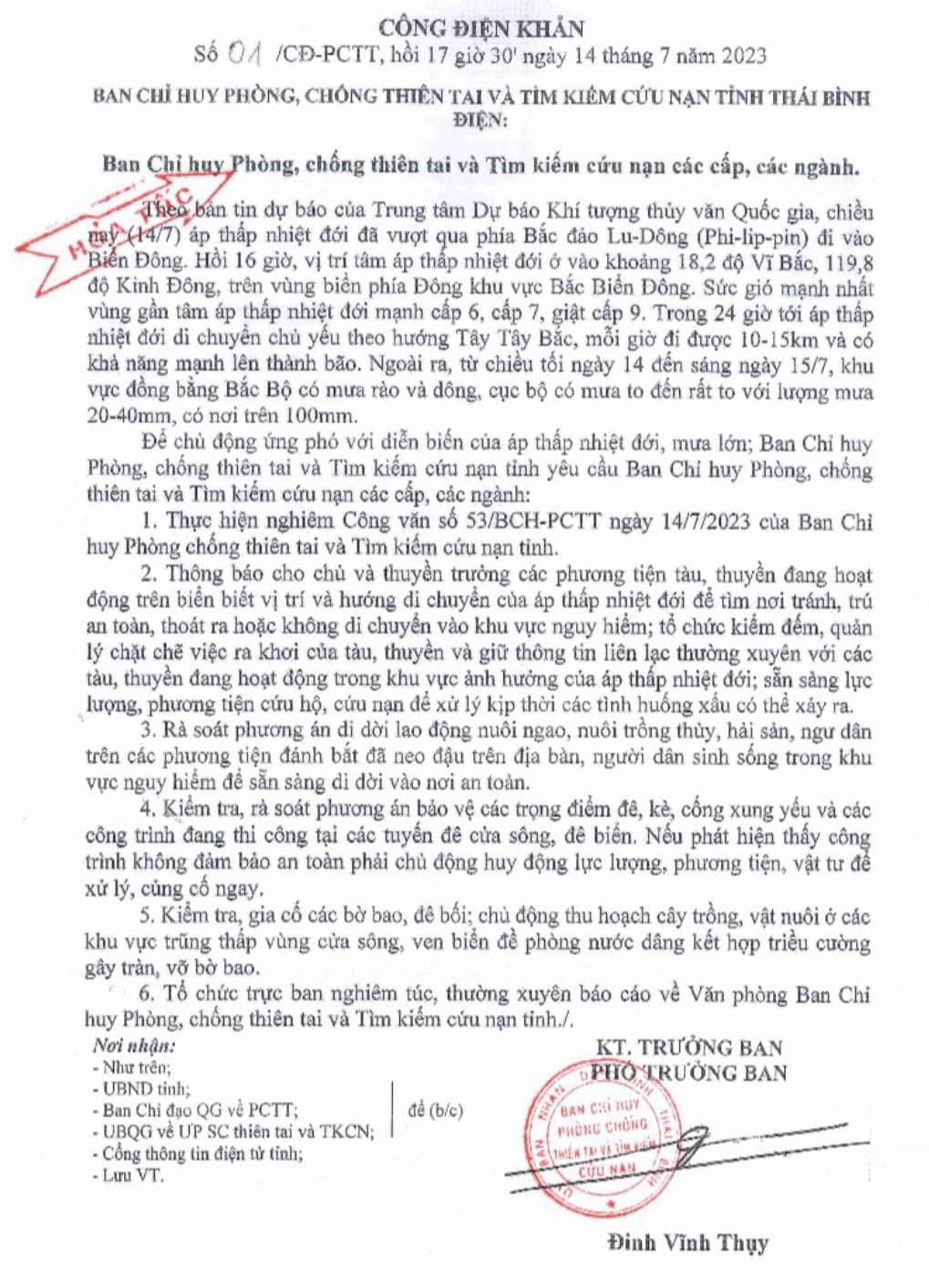 Công điện khẩn số 01/CĐ-PCTT, hồi 17h30p ngày 14/7/2023 của Ban Chỉ huy Phòng, chống thiên tai và Tìm kiếm cứu nạn tỉnh Thái Bình