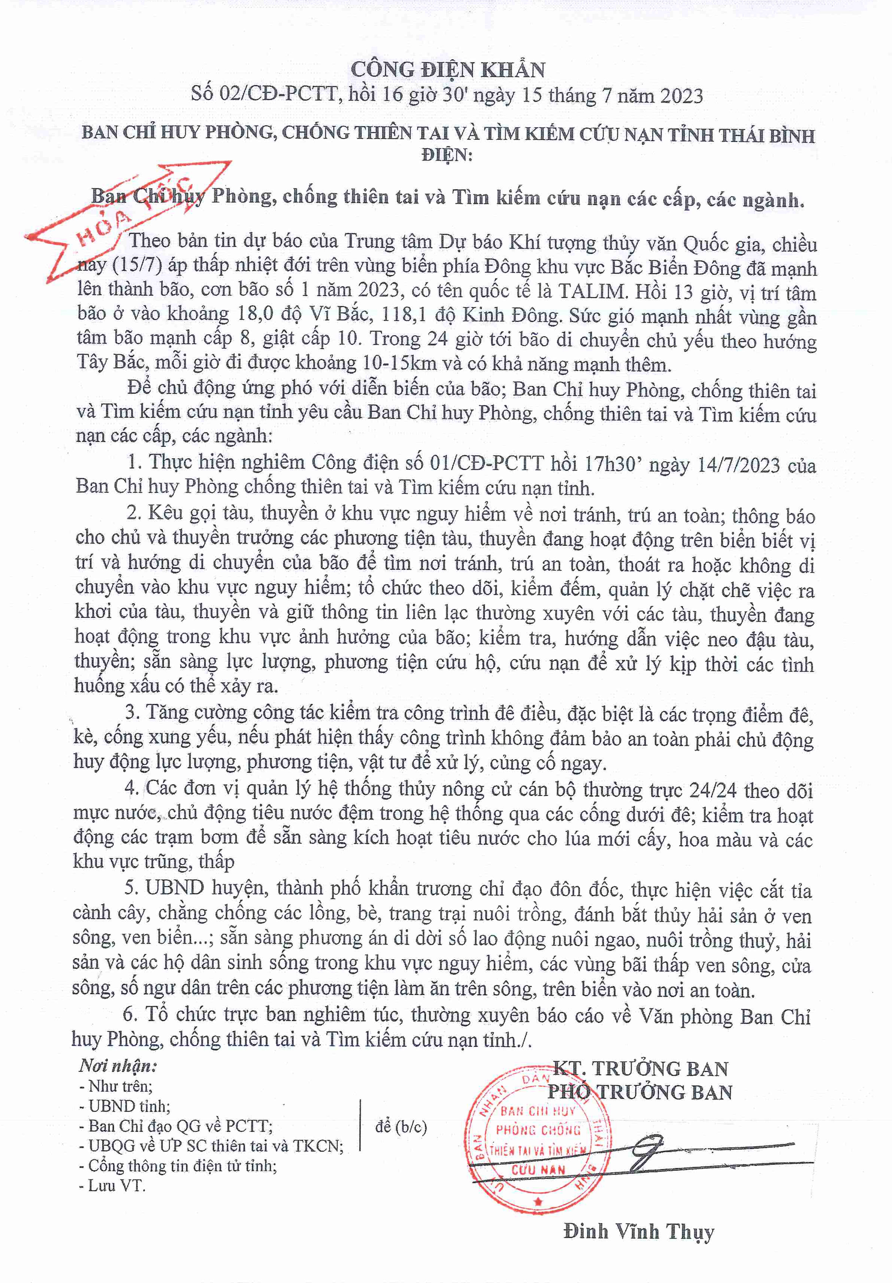 Công điện khẩn số 02/CĐ-PCTT, hồi 16h30p ngày 15/7/2023 của Ban Chỉ huy Phòng, chống thiên tai và Tìm kiếm cứu nạn tỉnh Thái Bình