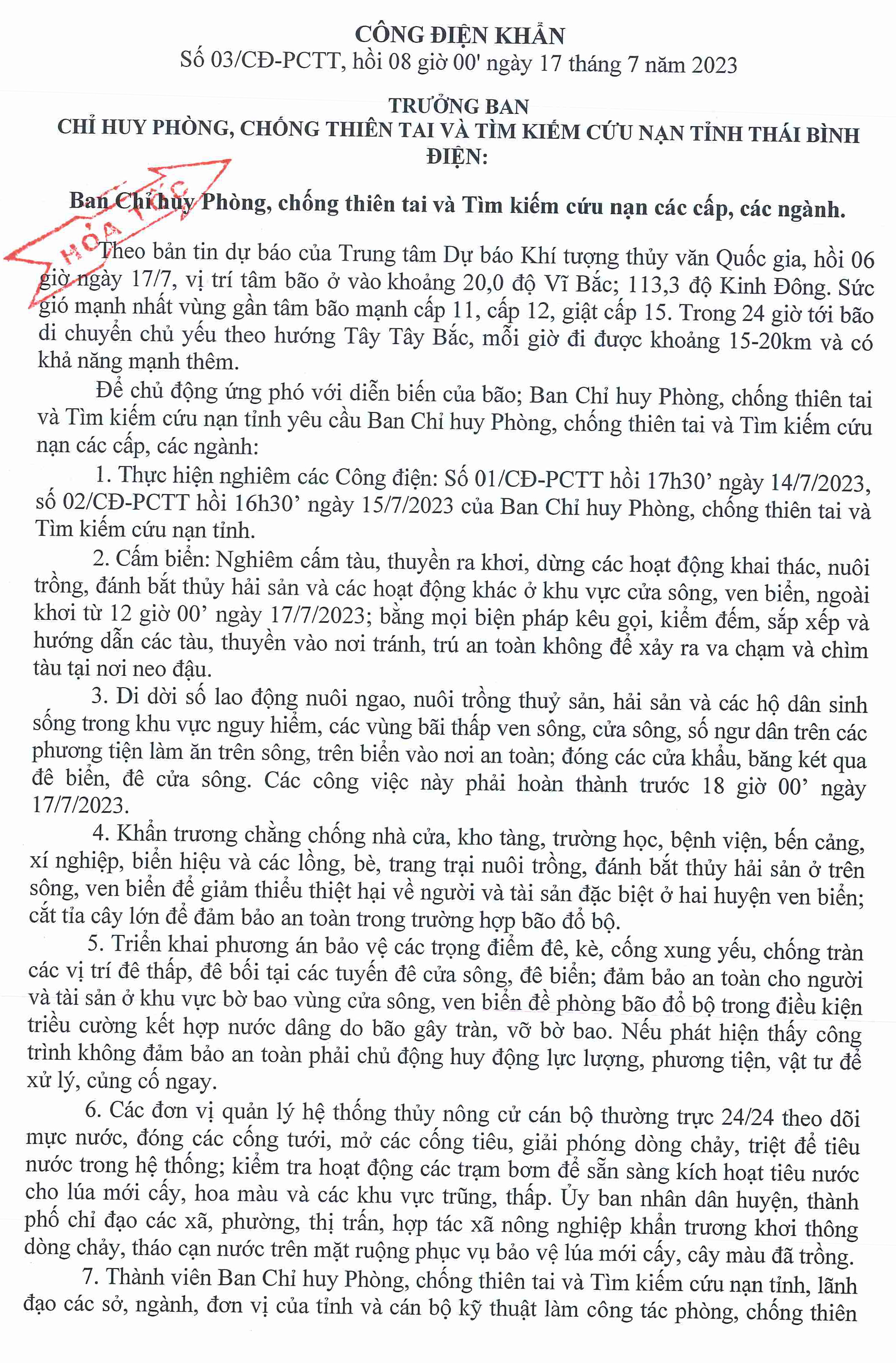 Công điện khẩn số 03/CĐ-PCTT, hồi 08h00p ngày 17/7/2023 của Ban Chỉ huy Phòng, chống thiên tai và Tìm kiếm cứu nạn tỉnh Thái Bình