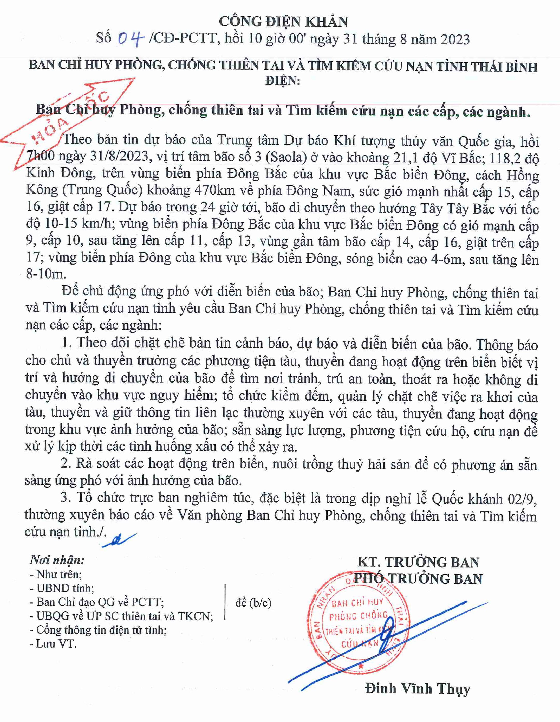 Công điện khẩn số 04/CĐ-PCTT, hồi 10 giờ 00 ngày 31/8/2023 của Ban Chỉ huy Phòng, chống thiên tai và Tìm kiếm cứu nạn tỉnh Thái Bình
