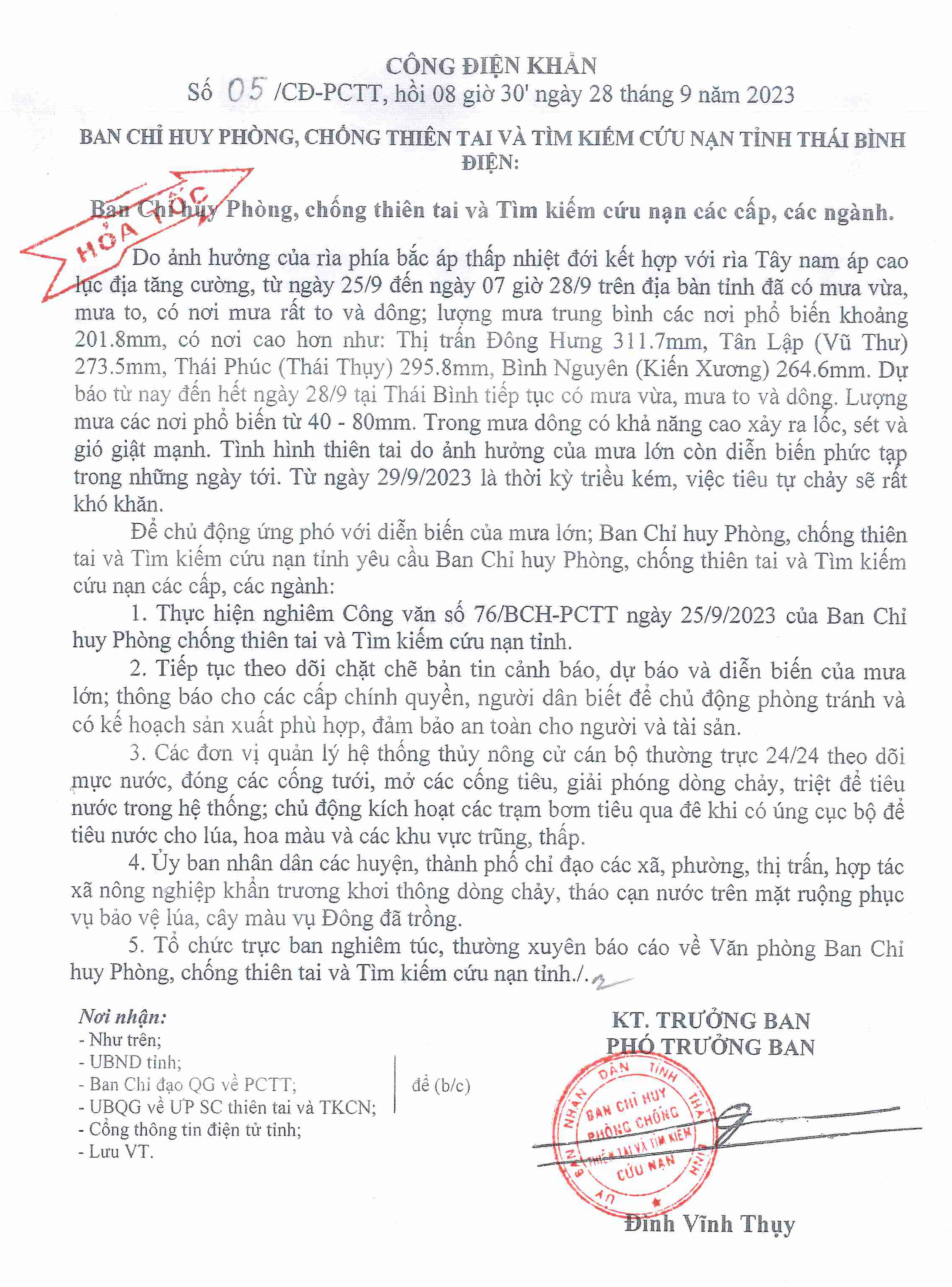 Công điện khẩn số 05/CĐ-PCTT, hồi 8 giờ ngày 28/9/2023 của Ban Chỉ huy Phòng, chống thiên tai và Tìm kiếm cứu nạn tỉnh Thái Bình