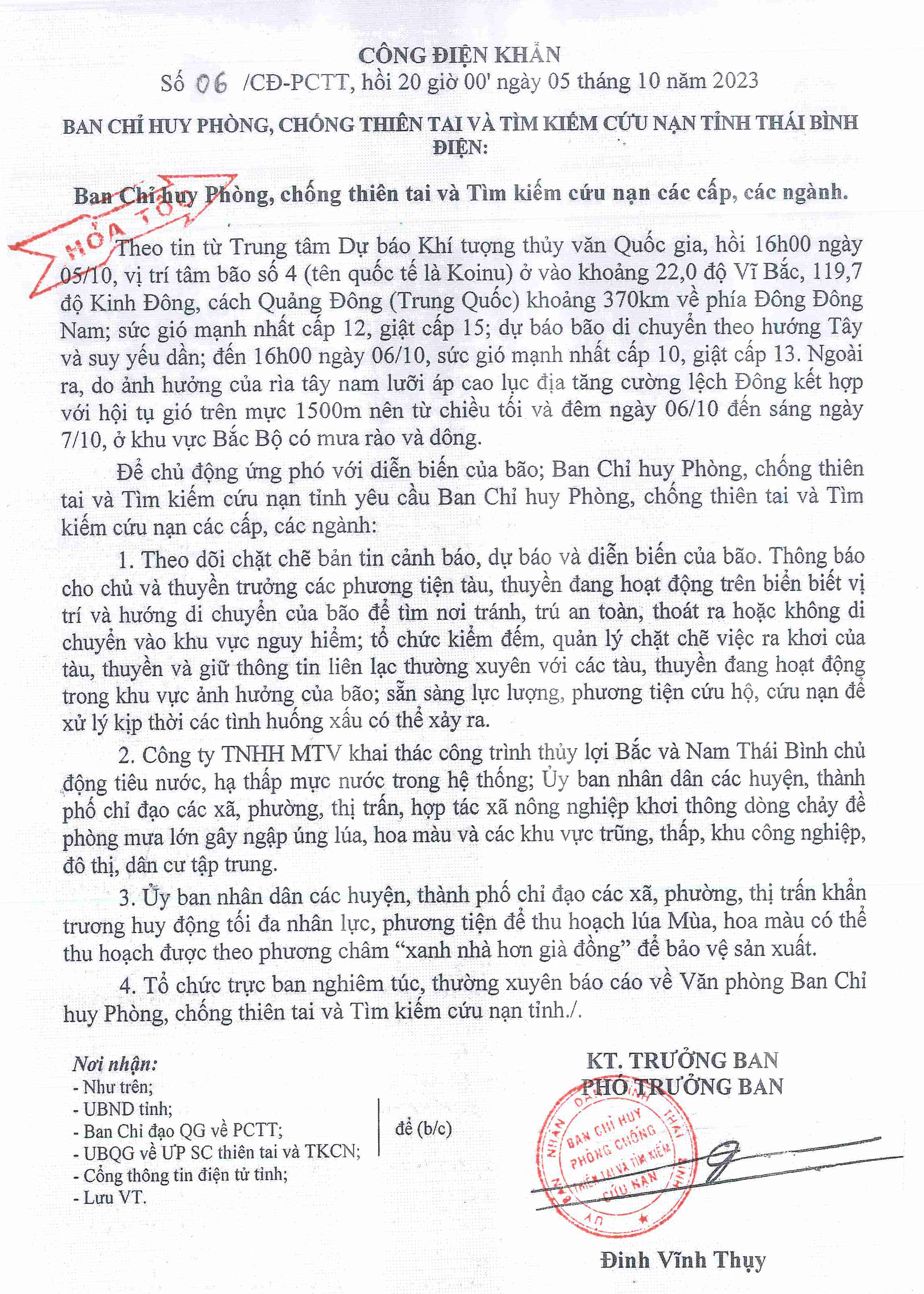 Công điện khẩn số 06/CĐ-PCTT, ngày 5/10/2023 của Ban Chỉ huy Phòng, chống thiên tai và Tìm kiếm cứu nạn tỉnh Thái Bình