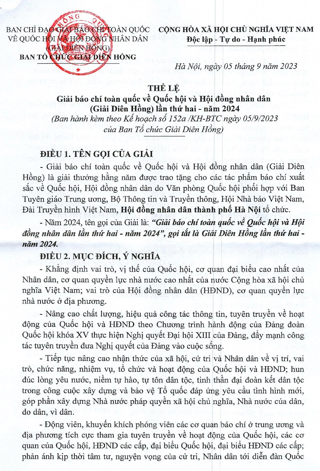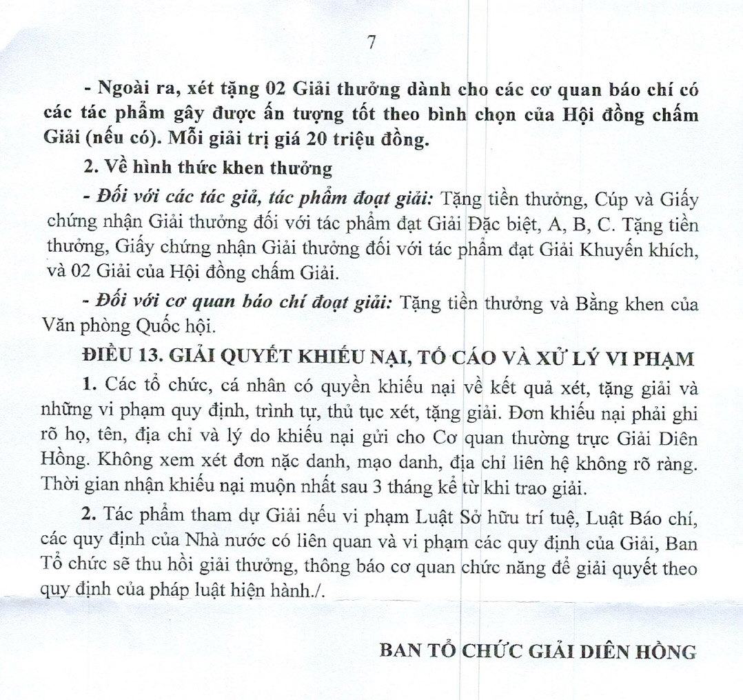 Thời gian nhận tác phẩm tham dự Giải Diên Hồng lần thứ hai - 2024 (Giải báo chí toàn quốc về Quốc hội và Hội đồng nhân dân) là từ ngày 09/6/2023 (ngày phát động giải) đến ngày 05/12/2023 theo dấu bưu điện.