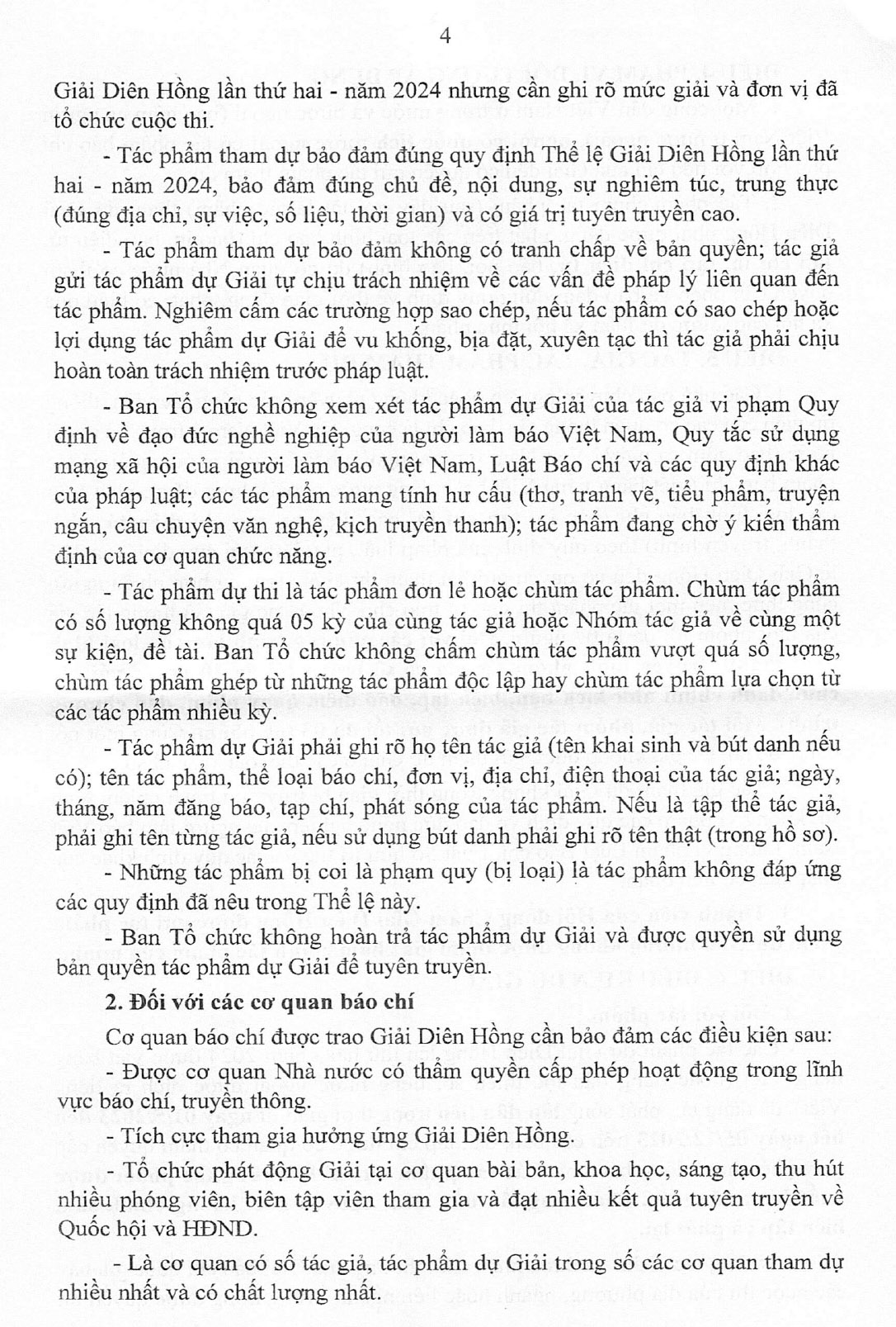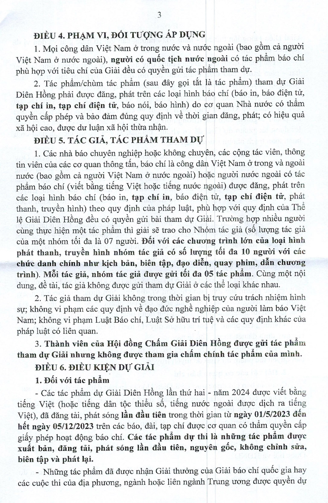 Các tác phẩm báo chí tham dự giải thuộc 03 nhóm thể loại: Thông tấn, chính luận, chính luận nghệ thuật và một số thể loại báo chí đa phương tiện, báo chí dữ liệu; đăng tải, phát sóng lần đầu tiên từ ngày 01/5/2023 đến hết ngày 05/12/2023 trên các báo, đài, tạp chí được cơ quan có thẩm quyền cấp phép hoạt động báo chí.