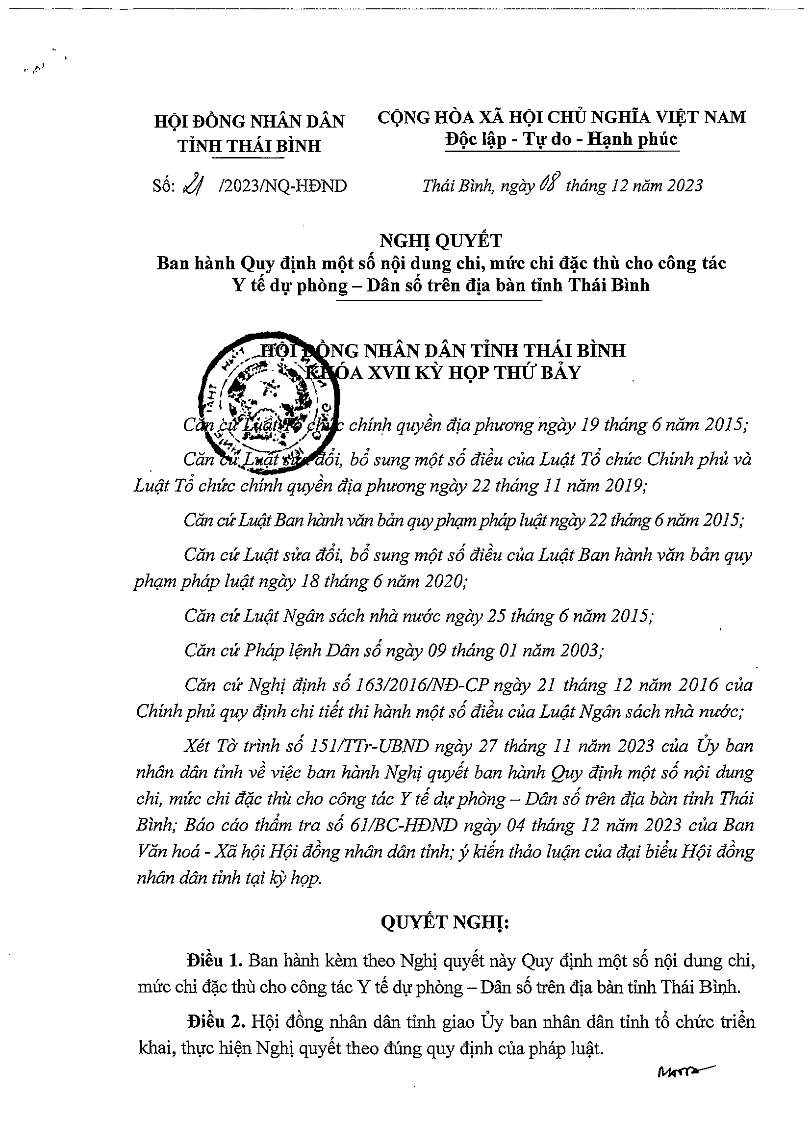 Nghị quyết số 21/2023/NQ-HĐND ban hành quy định một số nội dung chi, mức chi đặc thù cho công tác Y tế dự phòng - Dân số trên địa bàn tỉnh Thái Bình