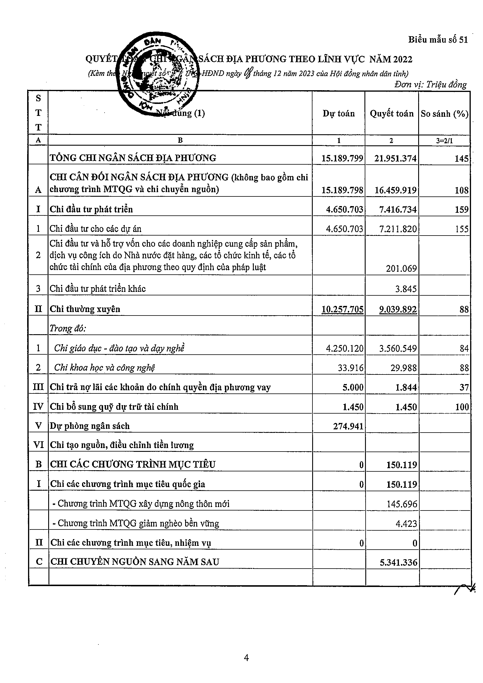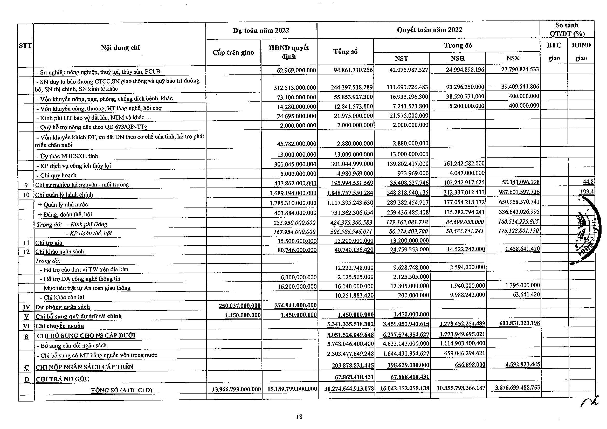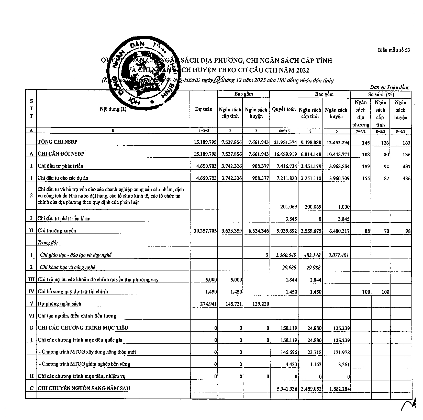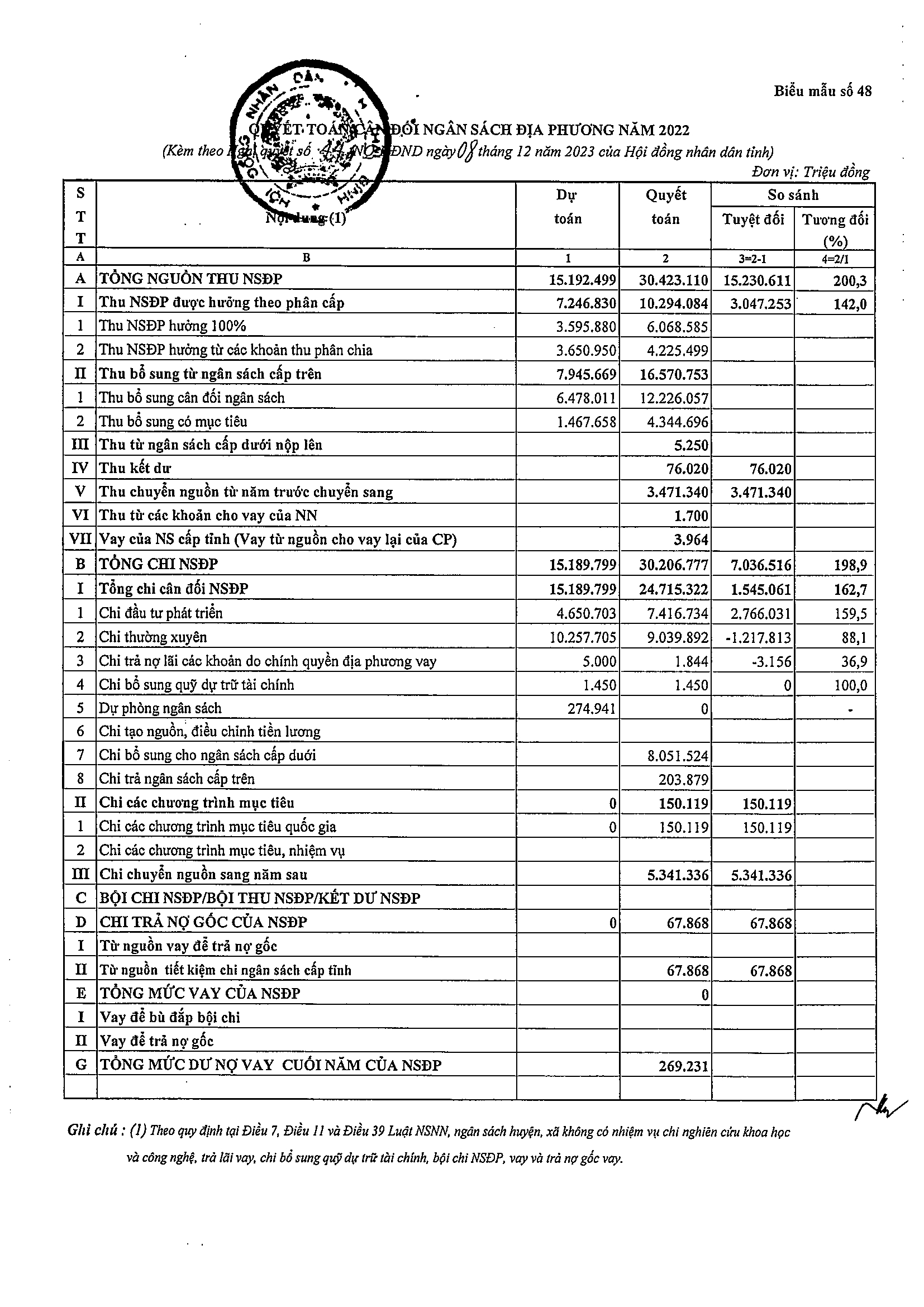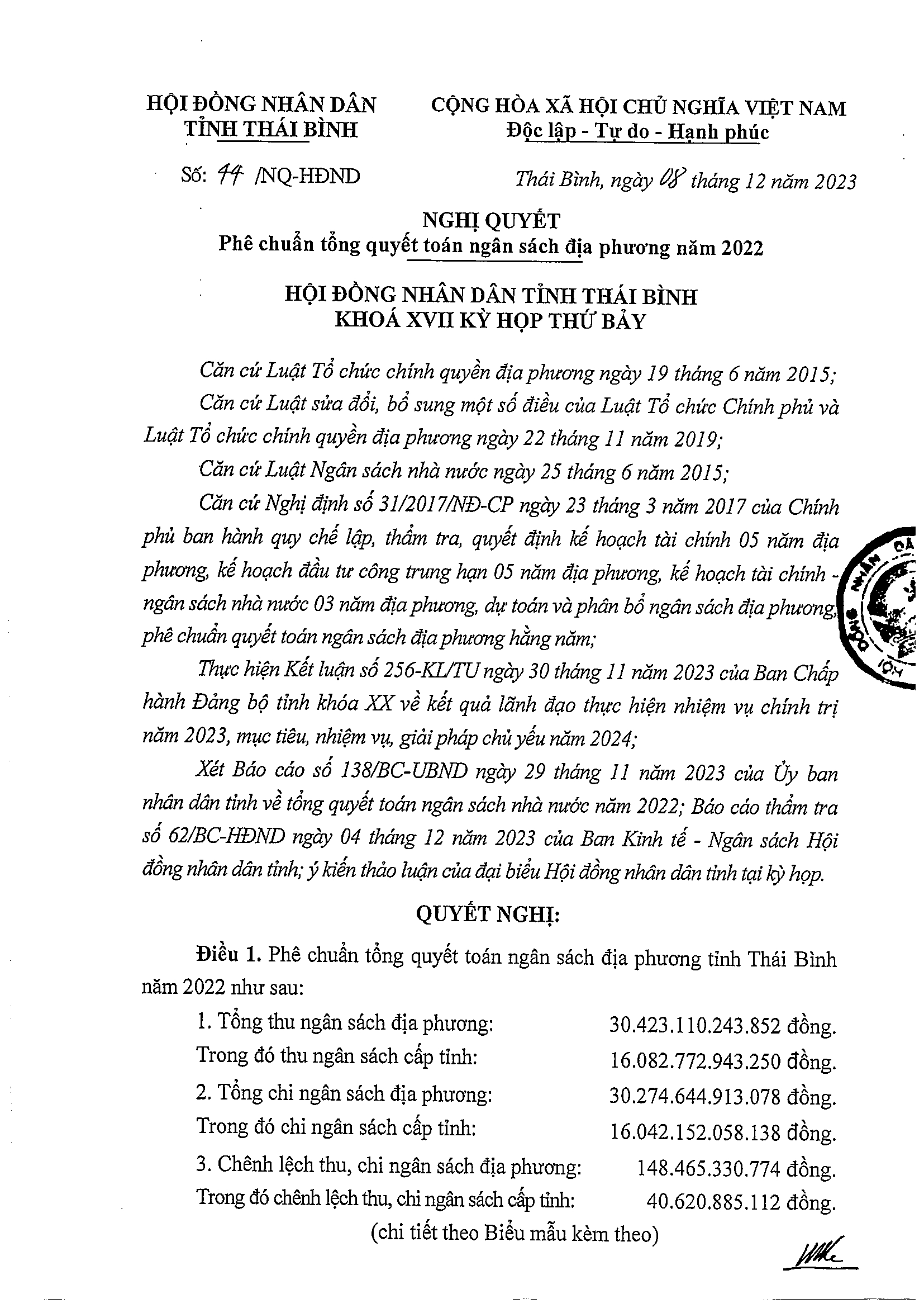 Nghị quyết số 44/NQ-HĐND về việc phê chuẩn tổng quyết toán ngân sách địa phương năm 2022