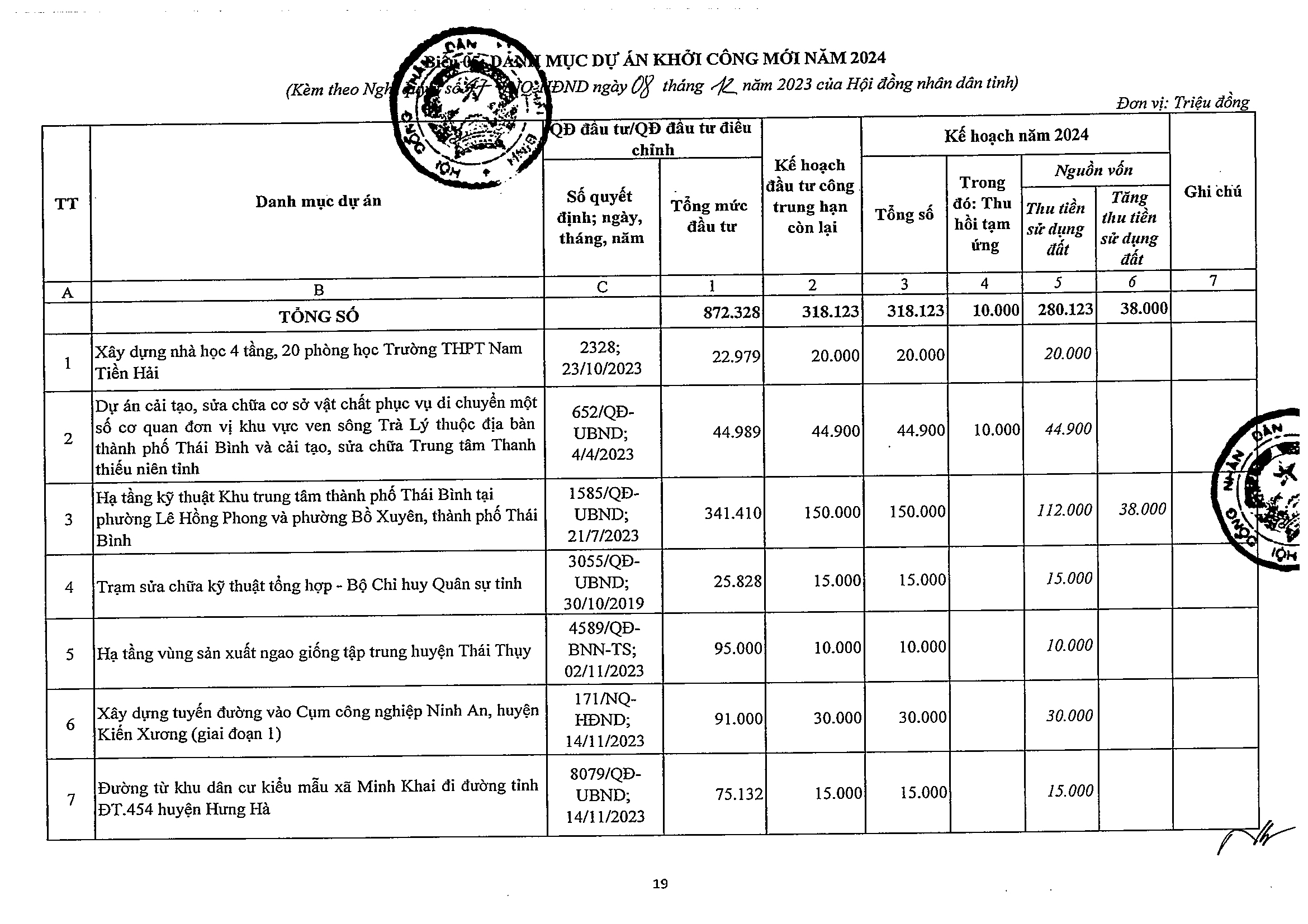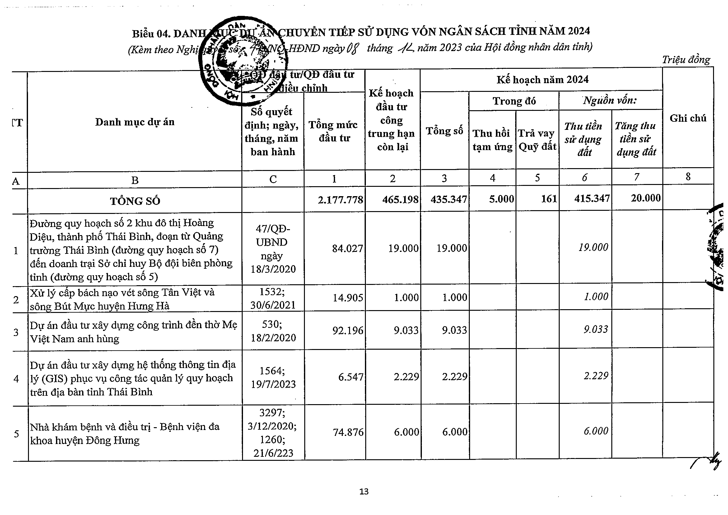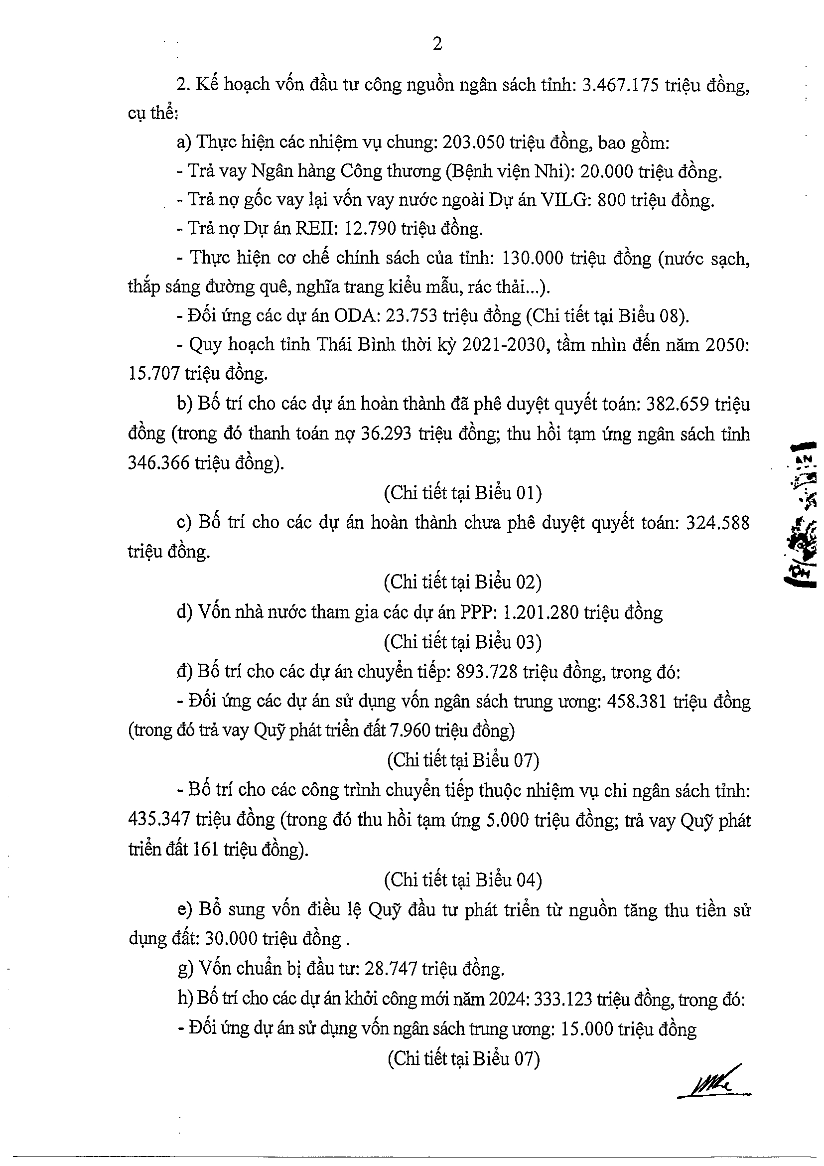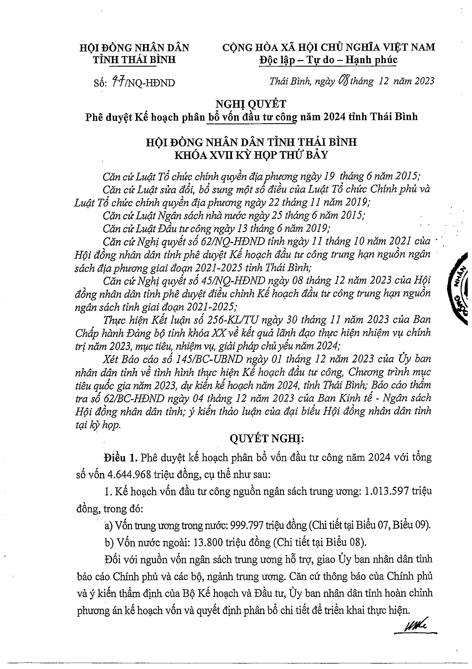 Nghị quyết số 47/NQ-HĐND phê duyệt kế hoạch phân bổ vốn đầu tư công năm 2024 tỉnh Thái Bình