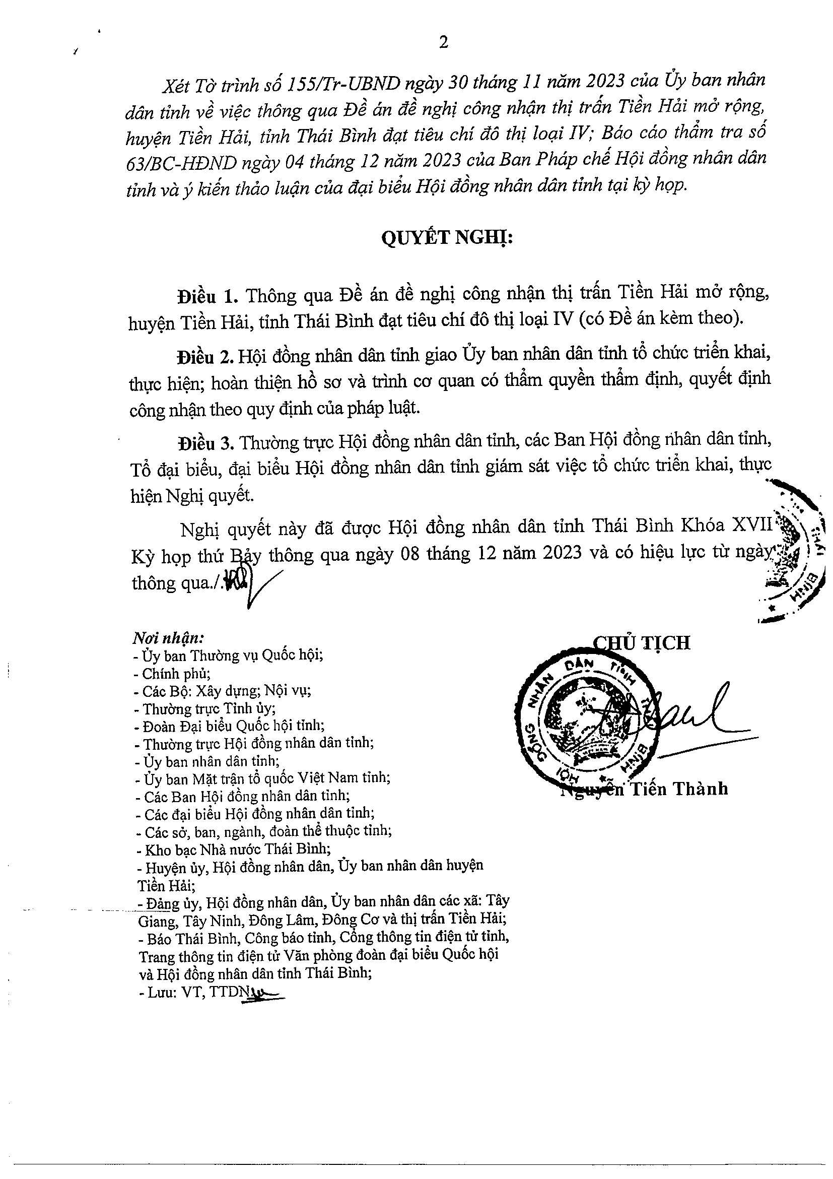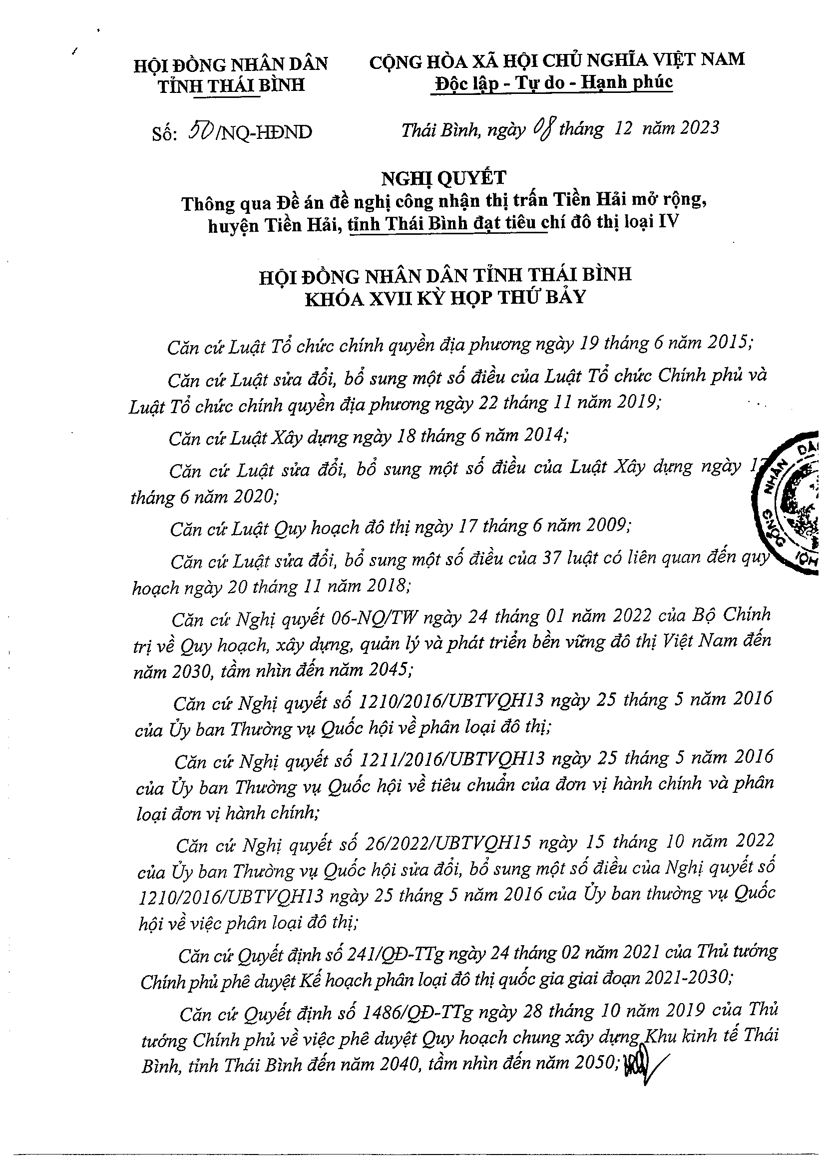 Nghị quyết số 50/NQ-HĐND thông qua Đề án đề nghị công nhận thị trấn Tiền Hải mở rộng, huyện Tiền Hải, tỉnh Thái Bình đạt tiêu chí đô thị loại IV