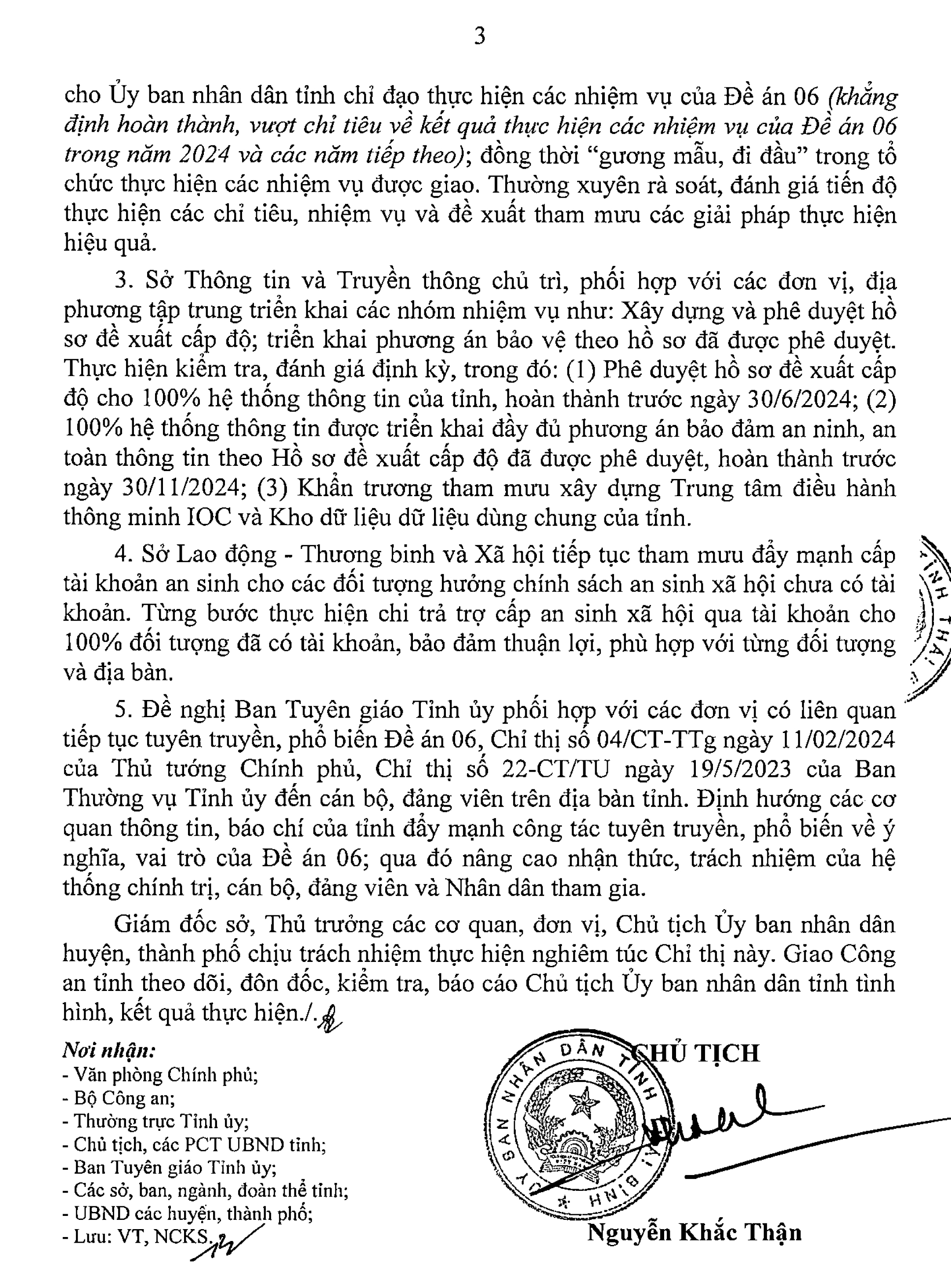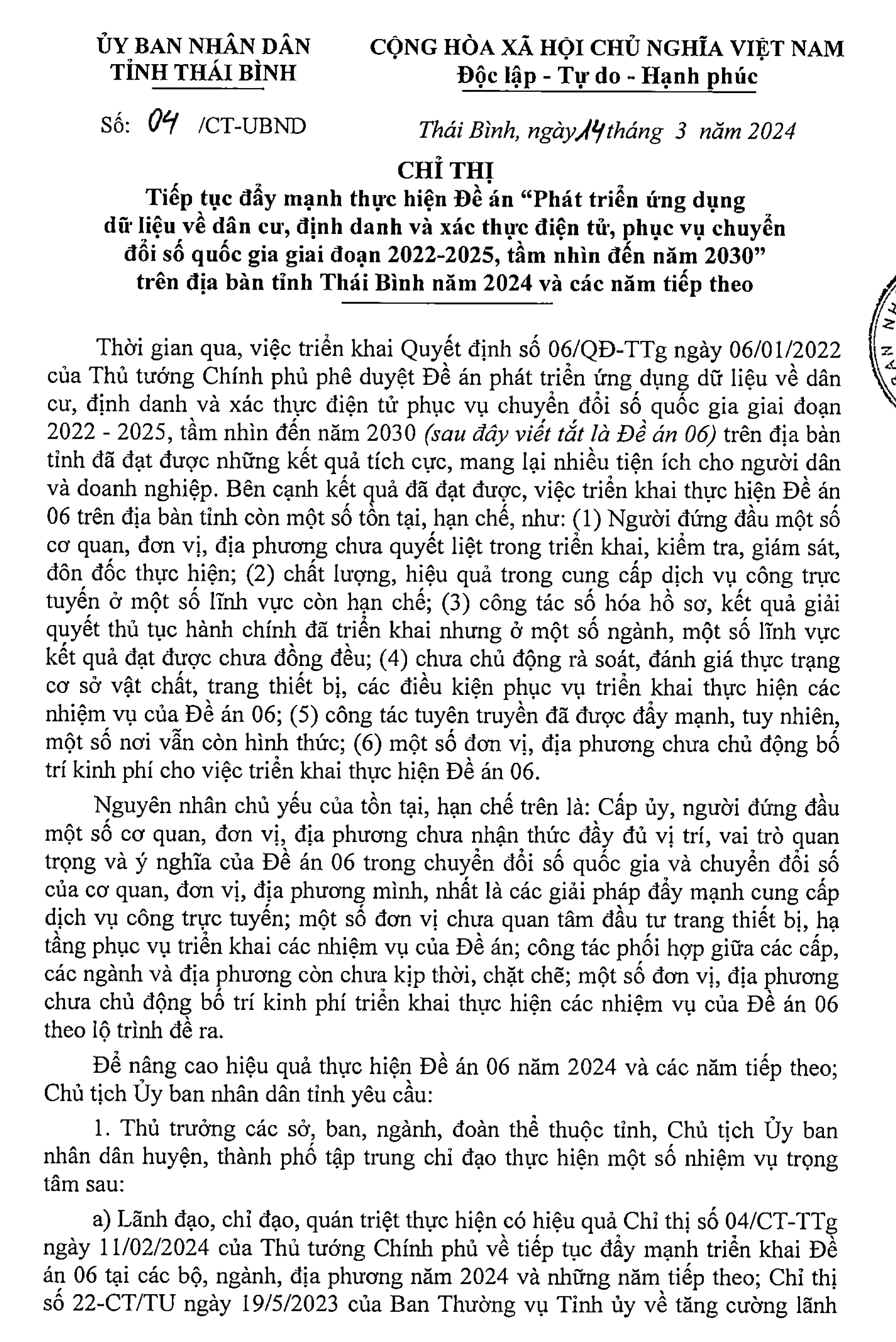 Chỉ thị số 04/CT-UBND ngày 14/3/2024 của Ủy ban nhân dân tỉnh về việc tiếp tục đẩy mạnh thực hiện Đề án "Phát triển ứng dụng dữ liệu về dân cư, định danh và xác thực điện tử, phục vụ chuyển đổi số quốc gia giai đoạn 2022-2025, tầm nhìn đến năm 2030" trên địa bàn tỉnh Thái Bình năm 2024 và các năm tiếp theo.