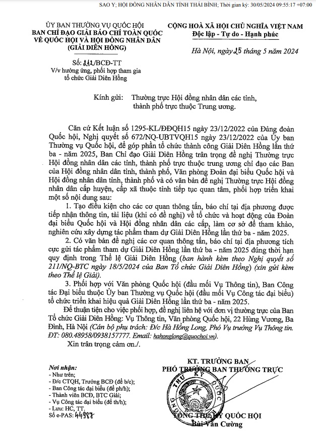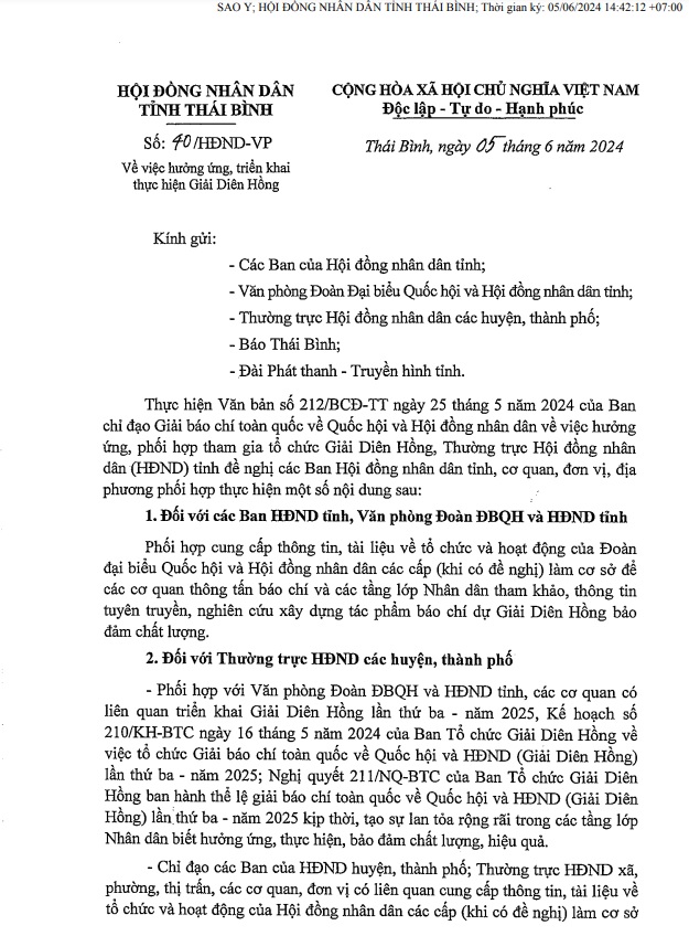 Ngày 05/6, HĐND tỉnh có Công văn số 40/HĐND-VP về việc hưởng ứng, triển khai thực hiện Giải Diên Hồng.