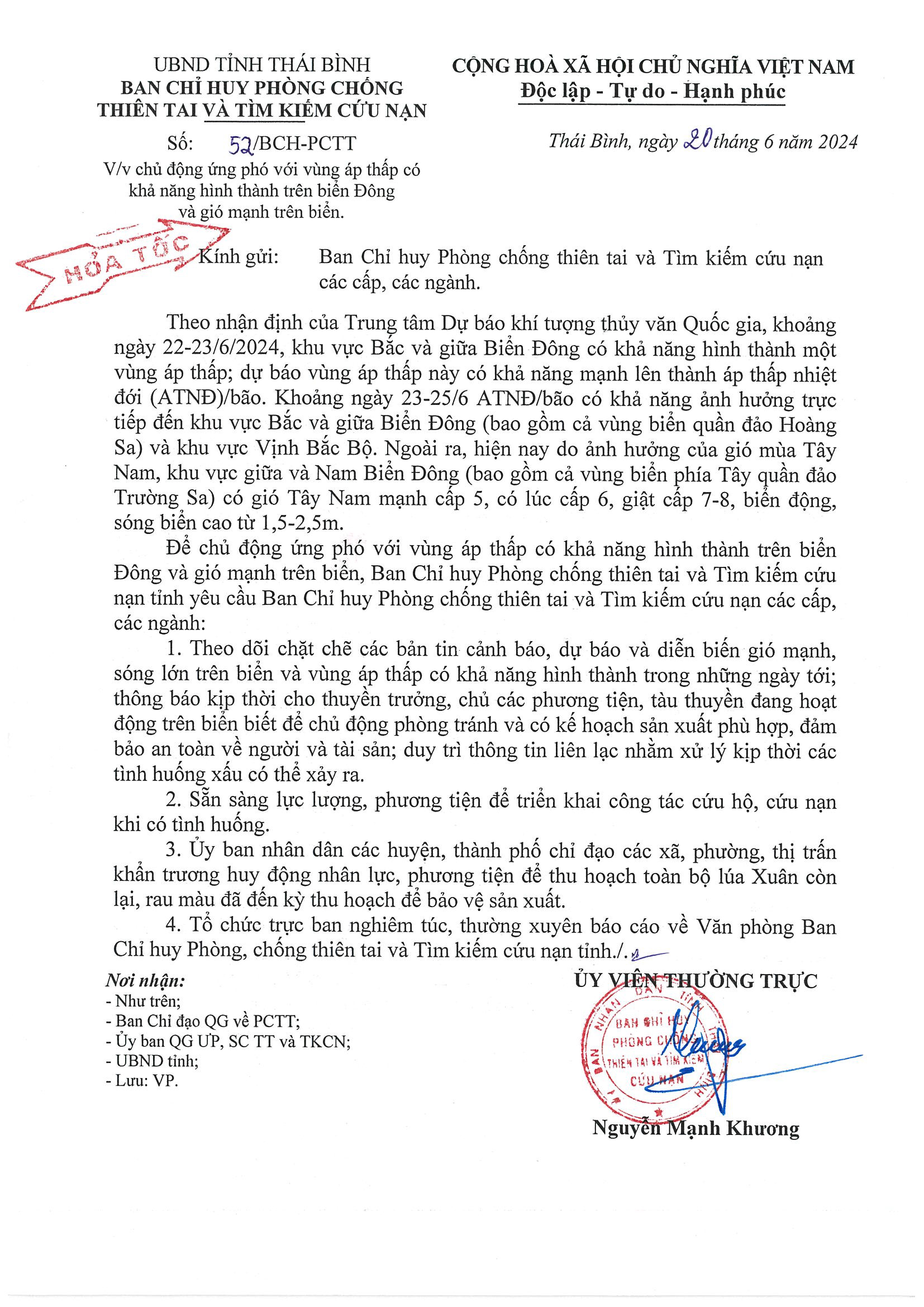 - Công điện khẩn số 10 của Ban chỉ huy PCTT và TKCN tỉnh Thái Bình điện Ban chỉ huy PCTT và TKCN các cấp, các ngành 03.09.2024 | 22:24 PM