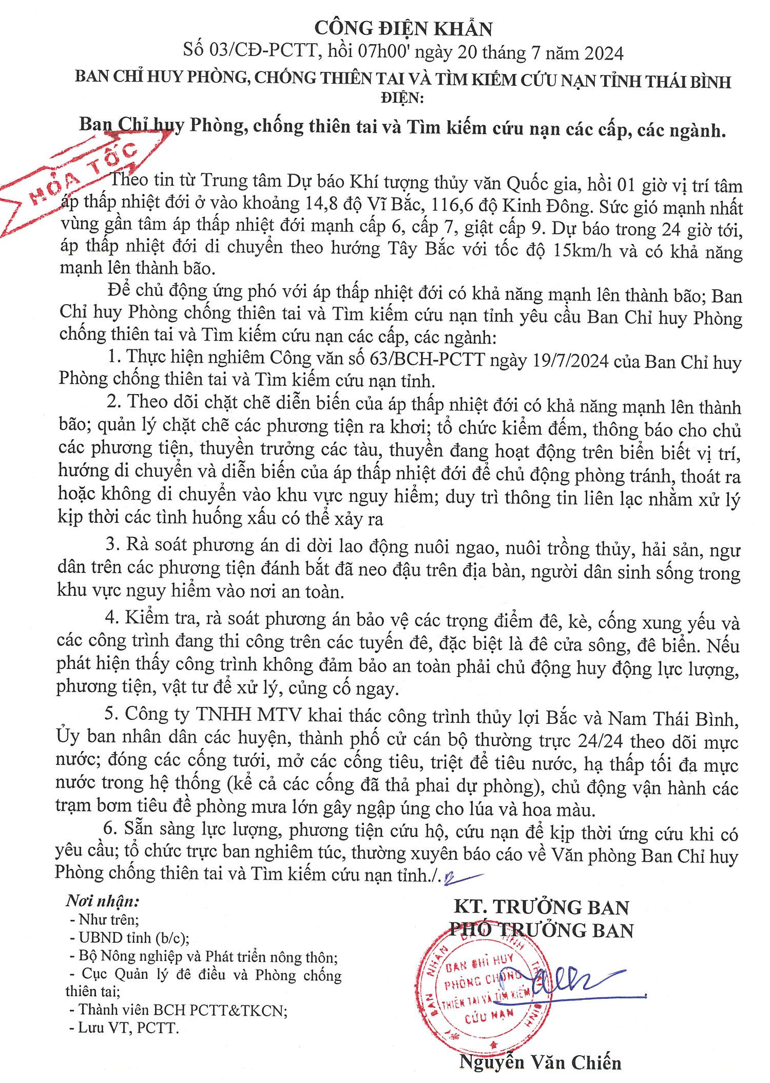Công điện khẩn số 03/CĐ-PCTT, hồi 7 giờ 00' ngày 20/7/2024 của Ban Chỉ huy Phòng, chống thiên tai và Tìm kiếm cứu nạn tỉnh Thái Bình