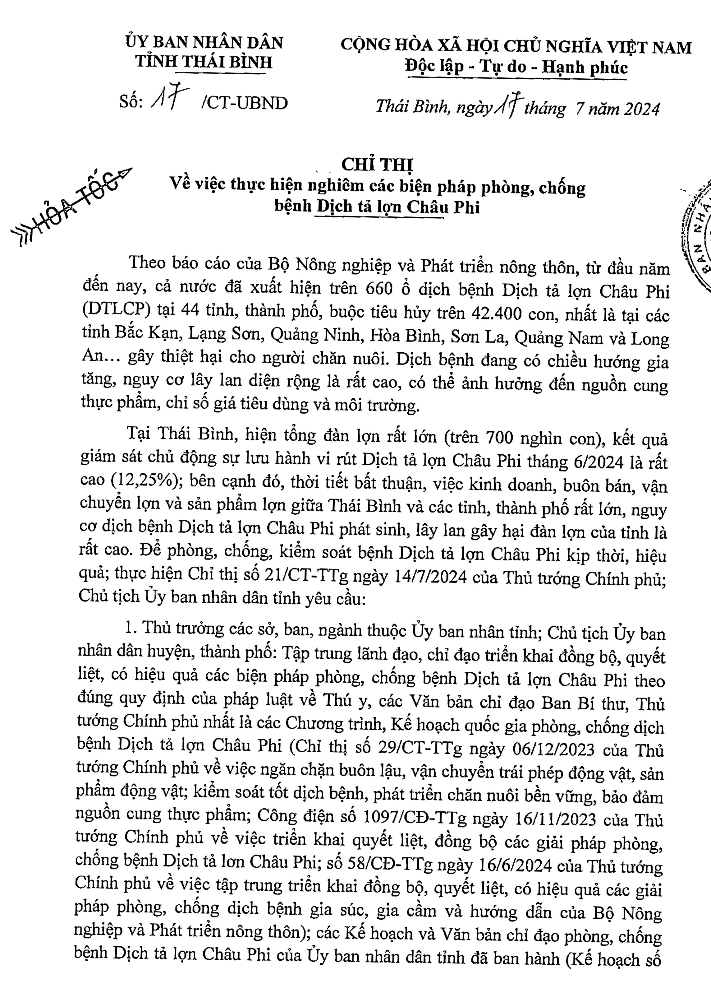- Công điện khẩn số 03/CĐ-PCTT, hồi 7 giờ 00' ngày 20/7/2024 của Ban Chỉ huy Phòng, chống thiên tai và Tìm kiếm cứu nạn tỉnh Thái Bình 21.07.2024 | 07:47 AM