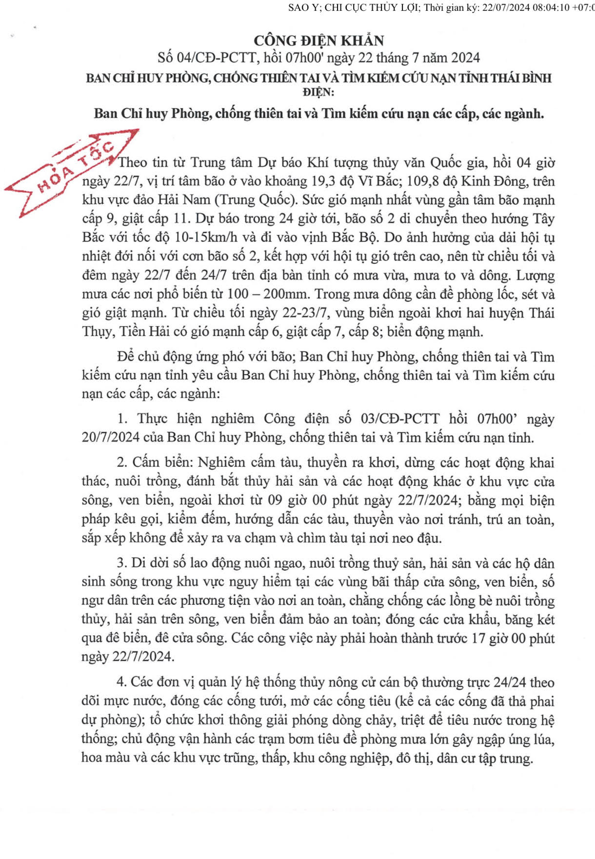 Ngày 22/7, Ban Chỉ huy Phòng, chống thiên tai và Tìm kiếm cứu nạn tỉnh Thái Bình có Công điện khẩn số 04/CĐ-PCTT điện Ban Chỉ huy Phòng, chống thiên tai và Tìm kiếm cứu nạn các cấp, các ngành. Nội dung công điện khẩn như sau: